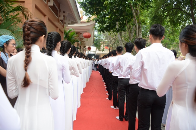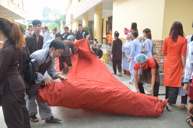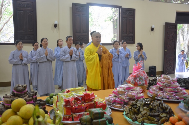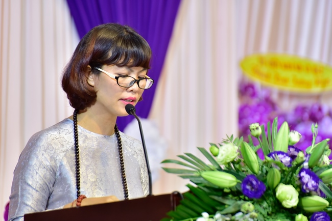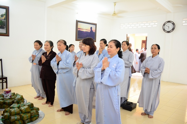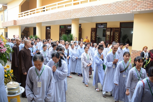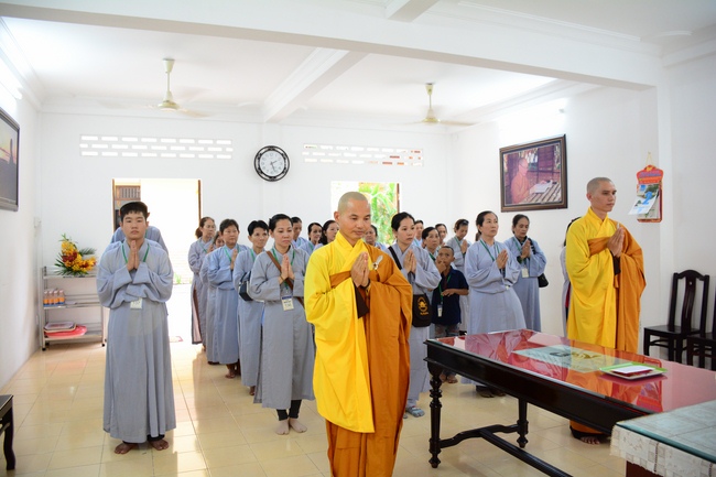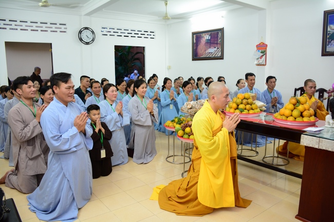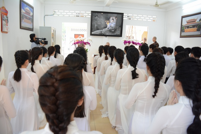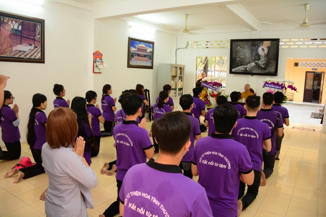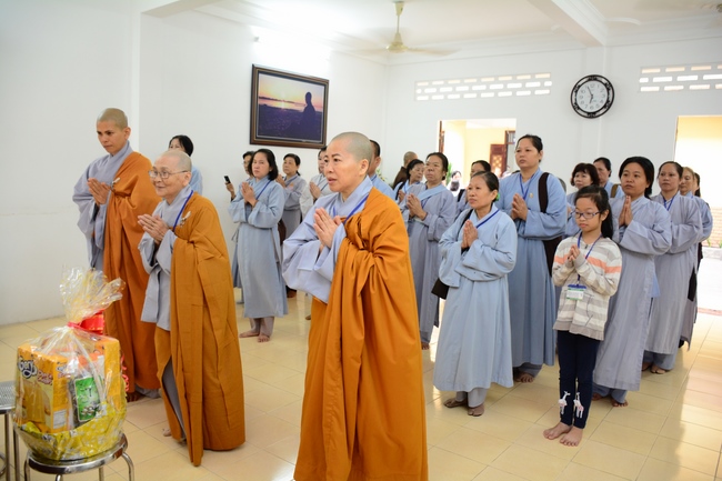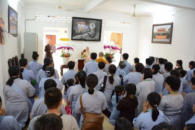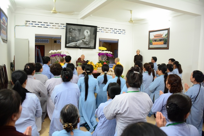 After the introduction, in solemn and pure atmosphere, the ashram spent a moment of silence in remembrance of the merit of the Master Founder, who devoted his whole life to preach Dharma and serve sentient beings. Venerable Thich Tam Kinh, Abbot of Tay Khanh pagoda in Thai Binh province, on behalf of Hoang Phap sangha, delivered a speech of the biography and contributions of the Founder, Master Ngo Chan Tu.