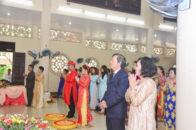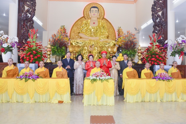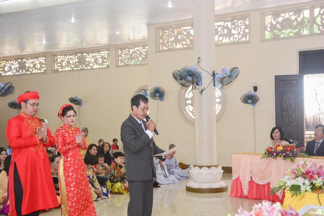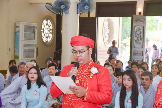 After offering incense to pay homage to Buddha, representatives of the groom and bride families appealed for the witness of the clergymen and then the couple exchanged wedding rings. Senior Venerable Abbot Thich Chan Tinh, on behalf of the clergy witnesses gave them the lecturing about marriage etiquette to the young couple.