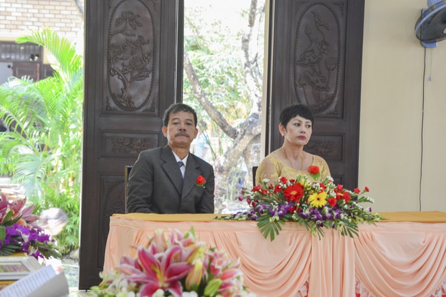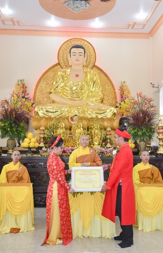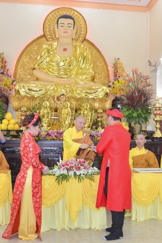 At the end of the marriage rite, the Senior Venerable sent the just-marriage spouse the Buddhism marriage certificate and wedding gift.