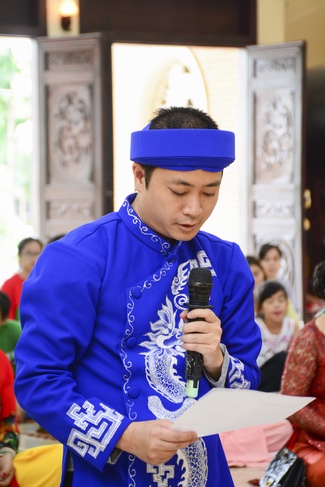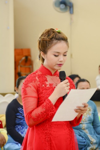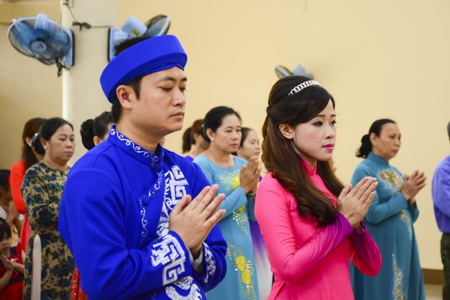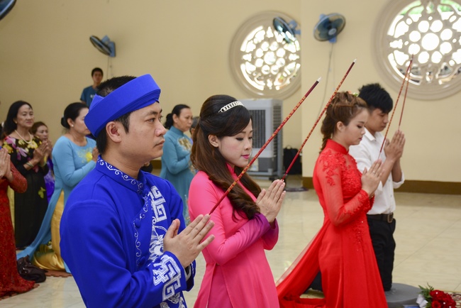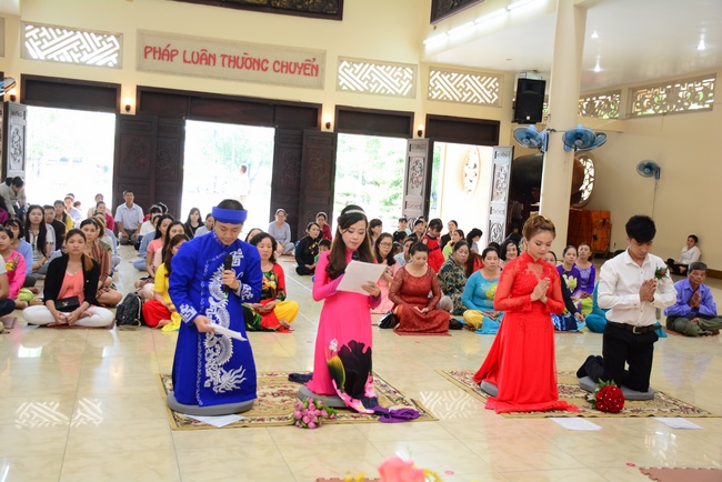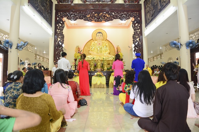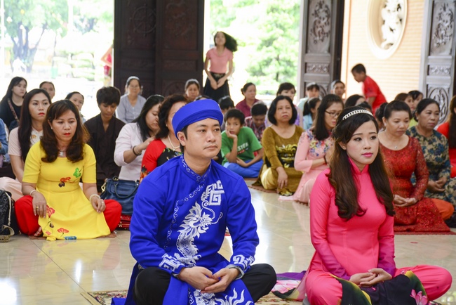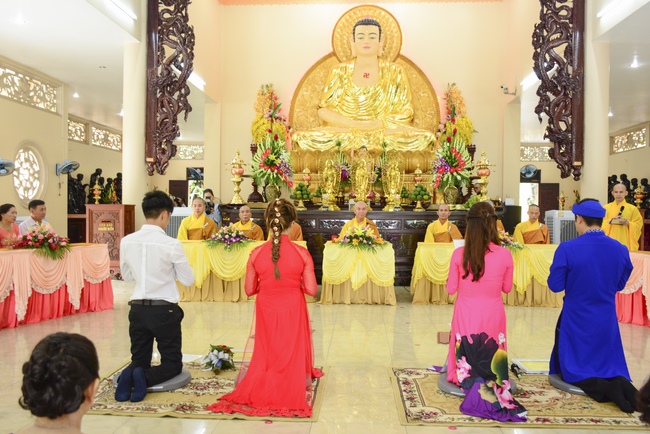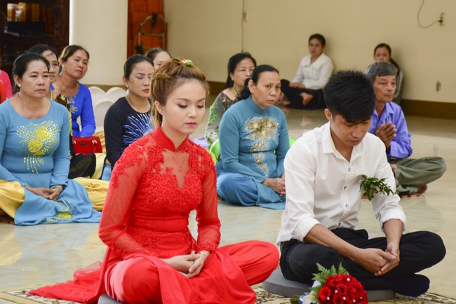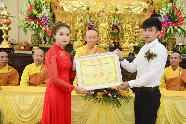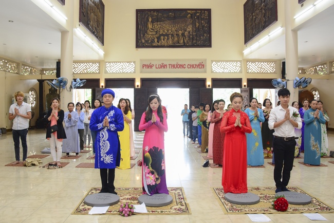 On April 29, 2017 (April 04, lunar calendar), representatives of Hoang Phap Pagoda held the Buddhism wedding ceremony for the couples: * Bride Huynh Thi Trang Thi and Groom Pham Hong Thanh, * Bride Nguyen Phuong Quynh Dong and Groom Pham Xuan Thuc.