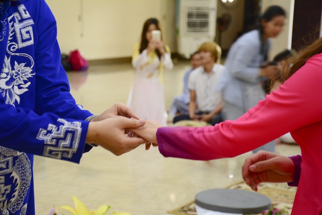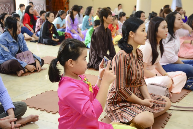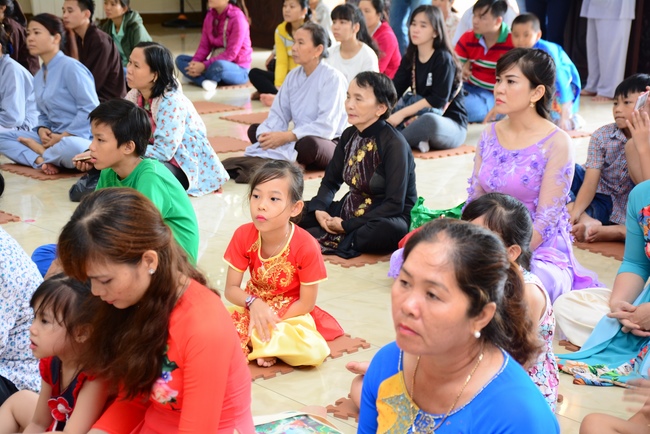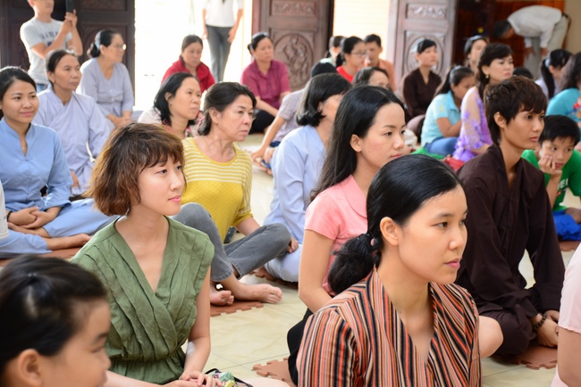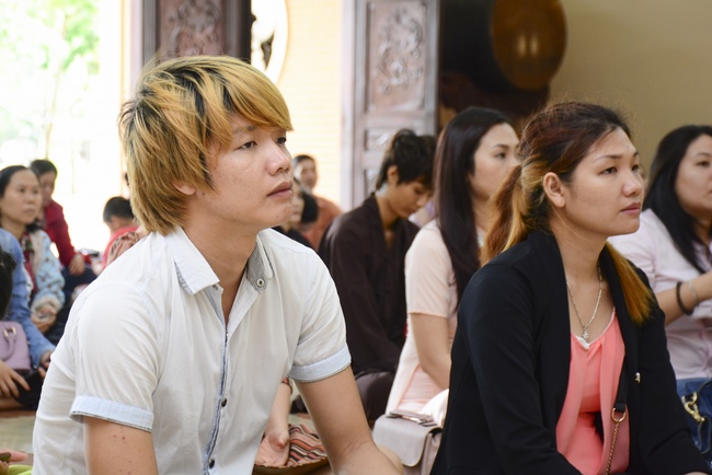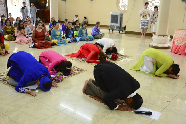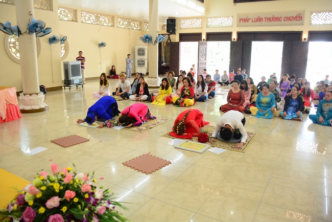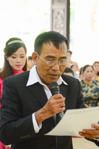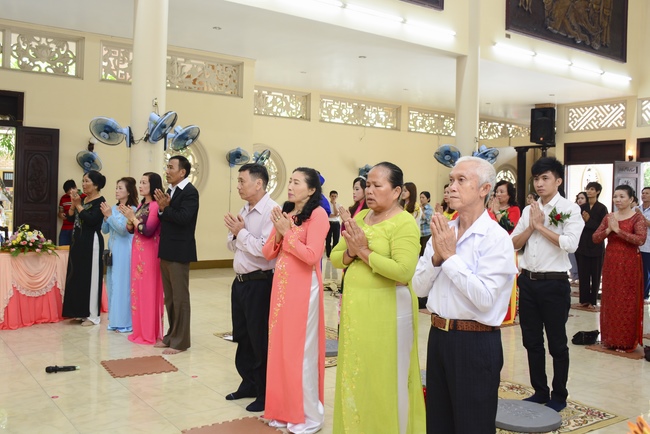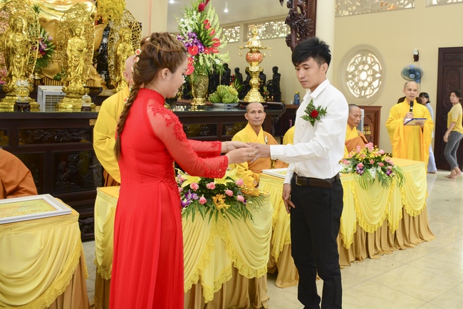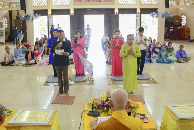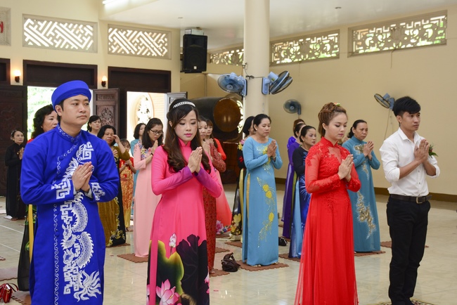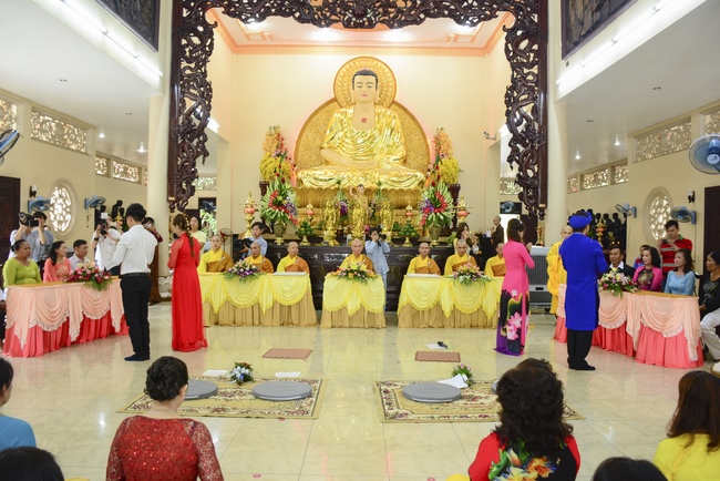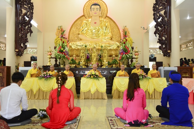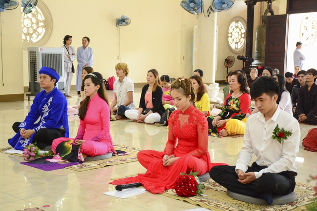 After Buddhism marital rites as offering incense to Triratna, appealing from the couples’ families, wedding ring exchange, ... , in dignified and warm atmosphere, Reverend Thich Tam Hue gave Dharma talk and advices to the just-married couples. Getting marriage is a very important decision in human life. In order to have a sustained home-sweet-home, both husband and wife should cultivate virtue, respect each other, know how to listen to others’ opinion, be tolerant, wholeheartedly love each other and live faithfully together. With the teachings, witness from the monks and the attentions of families/relatives, the wedding got more meaningful and sacred. This is also the motivation for couples trying their best building home-sweet home and living happily in the whole life.