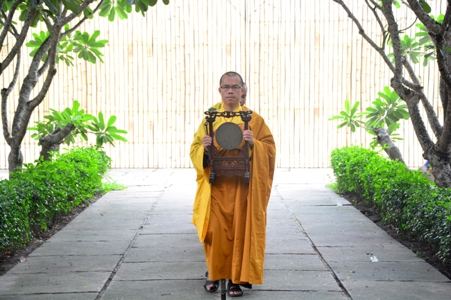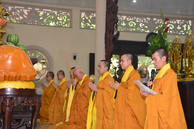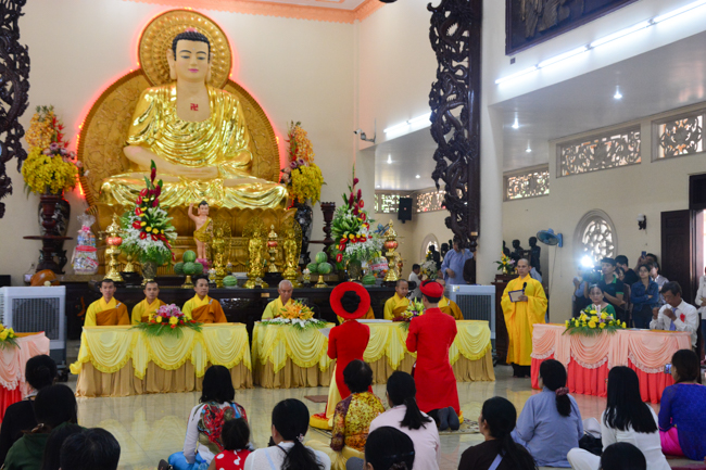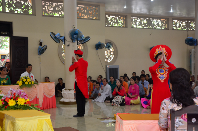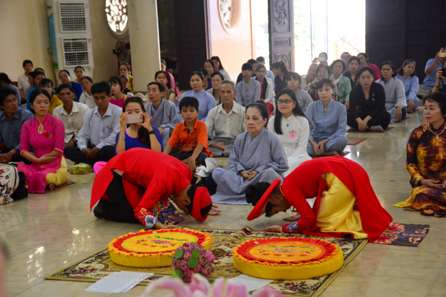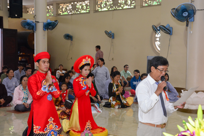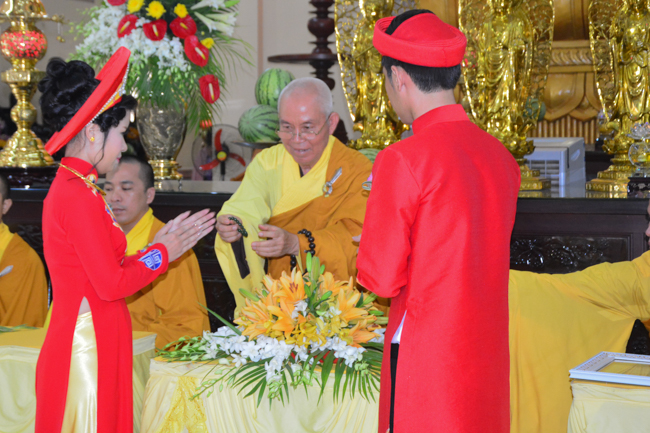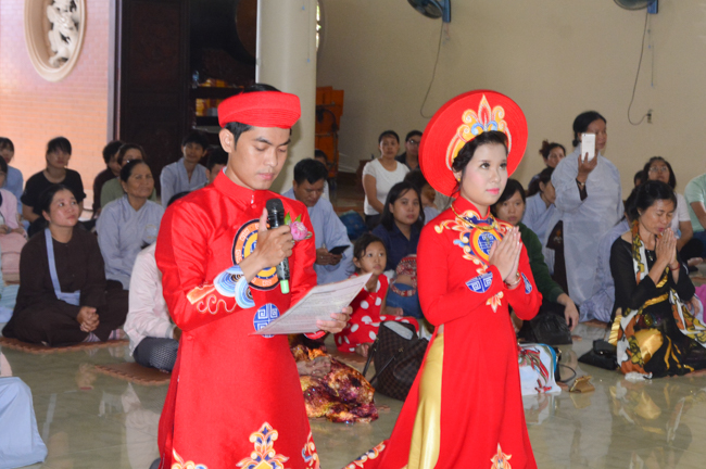 After Buddhism wedding rites as offering incense to Triratna, appealing from the couple’s families… in the important and sacred moment, under the witness of Triratna and families, the just-married couple vowed to preserve the five precepts for Buddhists, be the true Buddhist, be faithful to marriage life, respect, understand and share things with his/her spouse, together with his/her spouse build a happy Buddhism family in the whole life and perform the five duties as per Buddha’s teaching in Sigalovada Sutra as following: