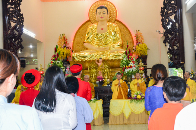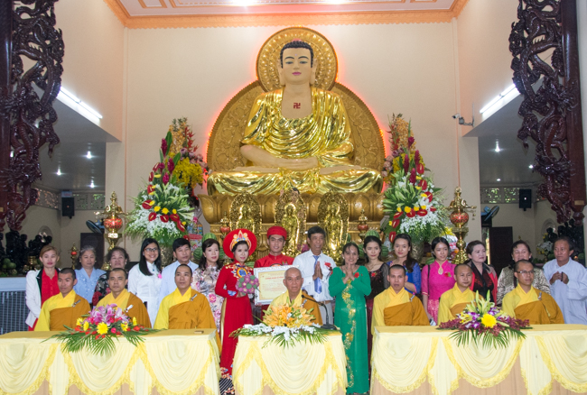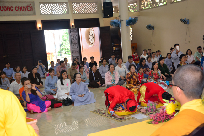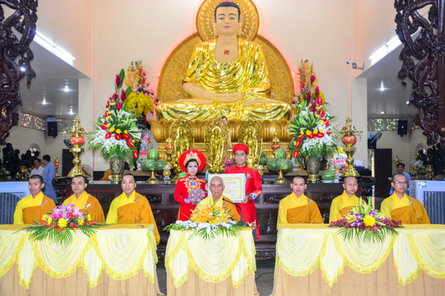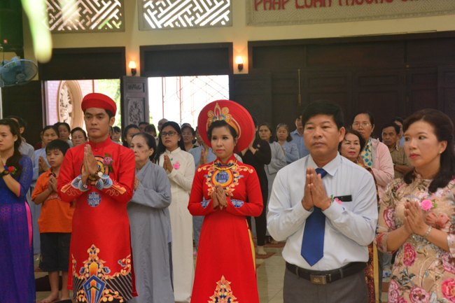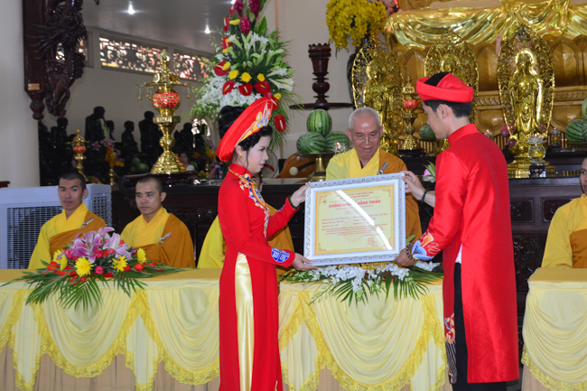 On behalf of clergy witnesses, Reverend Thich Tam Hue gave the couple advices on marital duties, pregnant education, children breeding, how to build up a Buddhism home-sweet-home, and how to deal with parents… Moreover, he advised that the couple should frequently learn Dharma to promote their family life to the Truth-Goodness-Beauty.