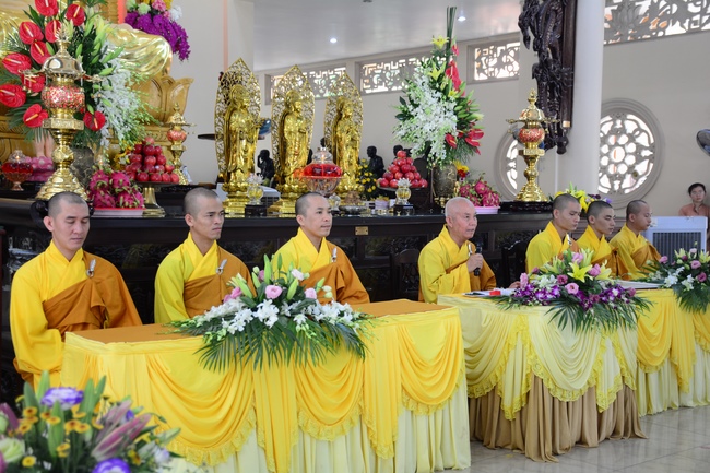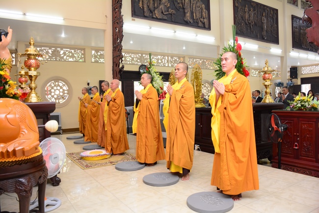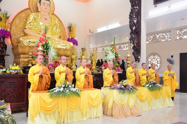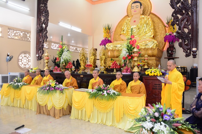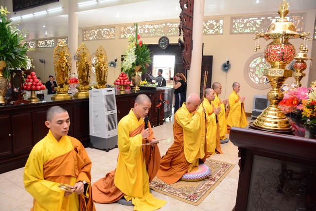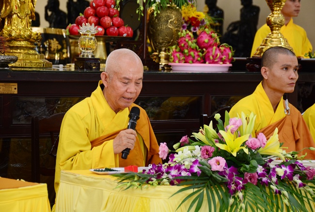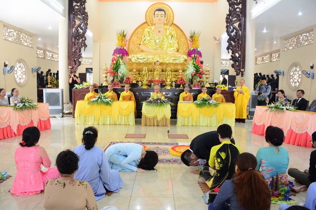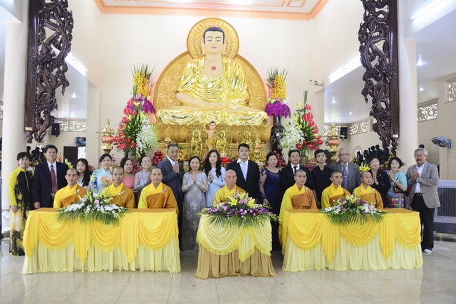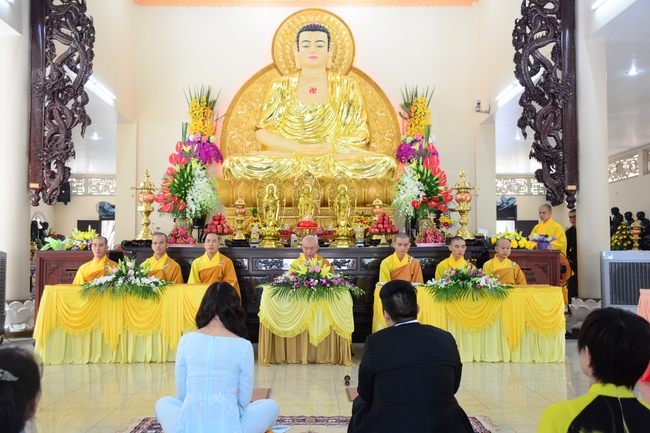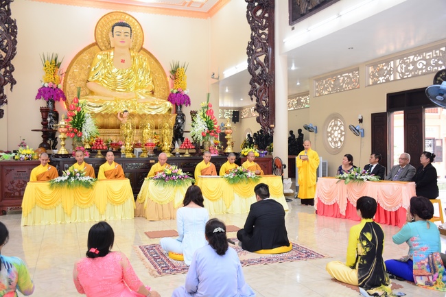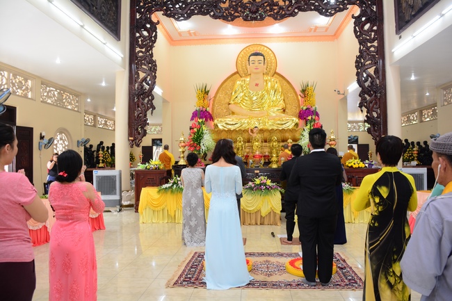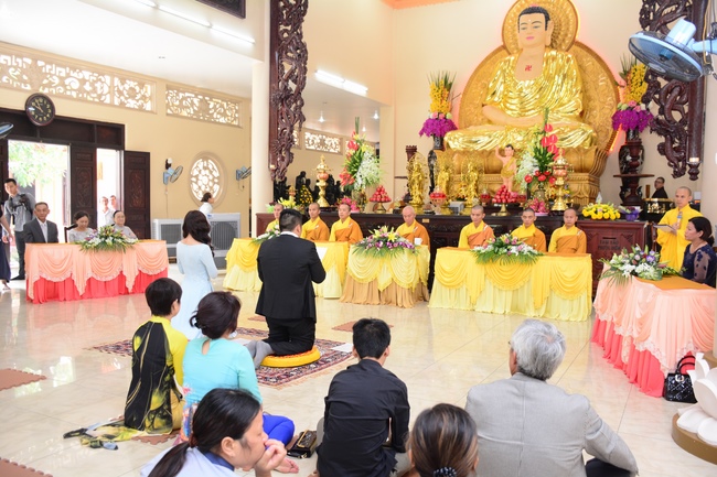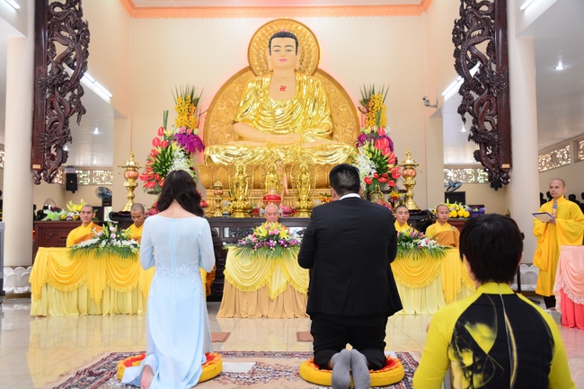 After Buddhism wedding rites as offering incense to Buddha, words from representatives of the two families and handing wedding rings, ... in Buddhism dignified and warm atmosphere, Venerable Thich Tam Hue delivers a Dharma talk as the guidance to young couple before their marriage life. To have a happy marriage, spouses should always love, respect each other, listen to, and take care of the family. In the meantime, partners should be tolerant forgiving mistakes of husband/wife with compassion and ease. Simultaneously, husband/wife should fulfill all the relevant duties in the family as per Buddha teaching in Sigalovada Sutra: