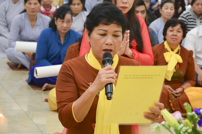 In the main shrine of Hoang Phap pagoda, representatives of the couple’s families offer appeal for the witness of clergymen in the important day of the bride and groom.