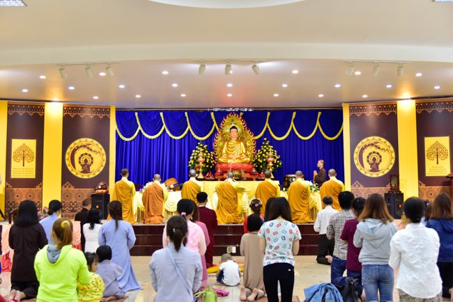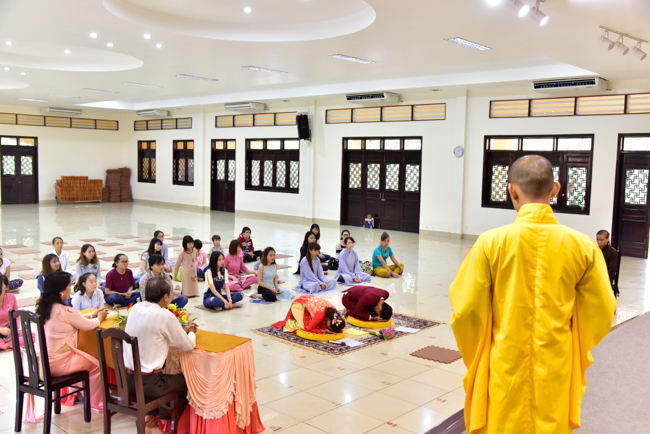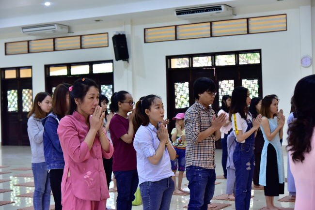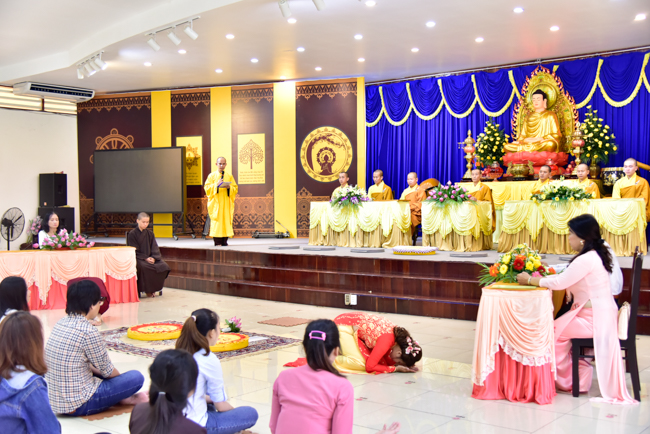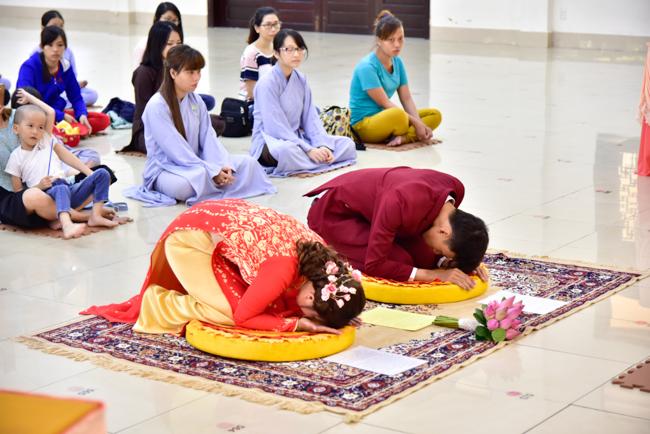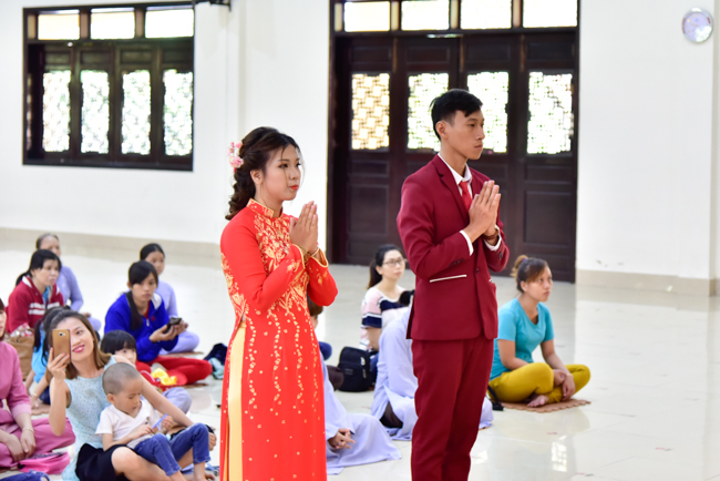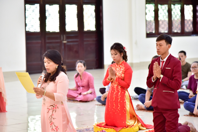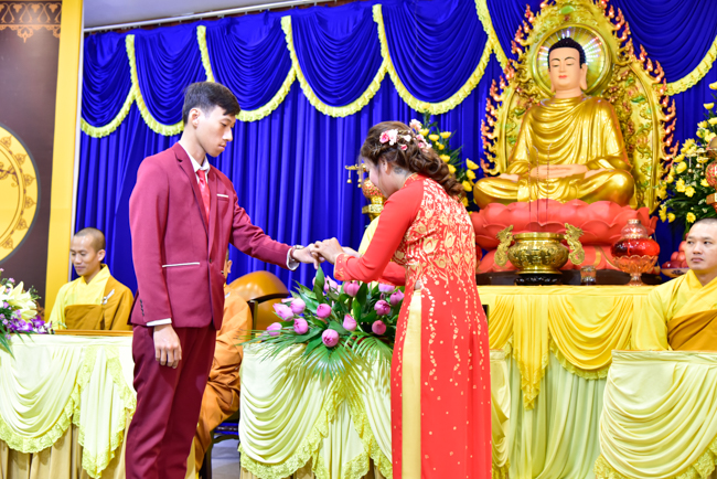With the witness from Triratna, families and relatives, the young couple performs traditional marital rites such as paying homage to Triratna, parents, hands over wedding rings and takes the marriage oath, in which they vow to live the whole life together following Buddha’s teachings in Sigalovada Sutra.