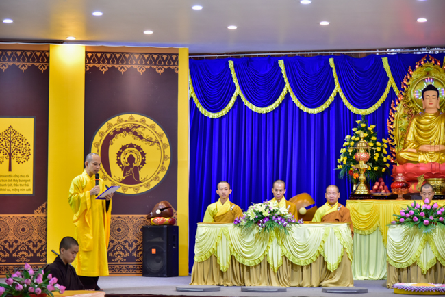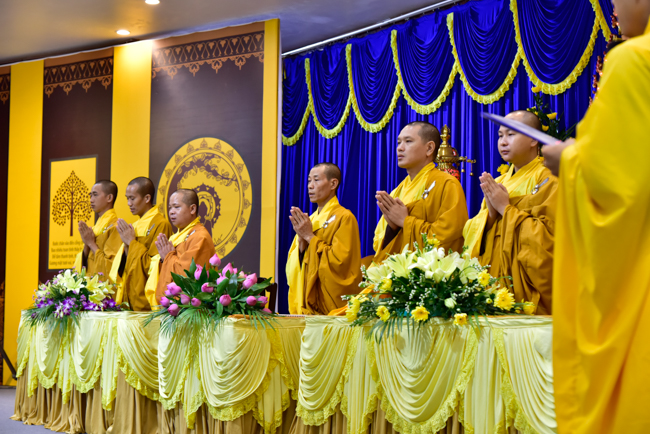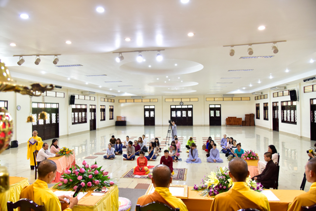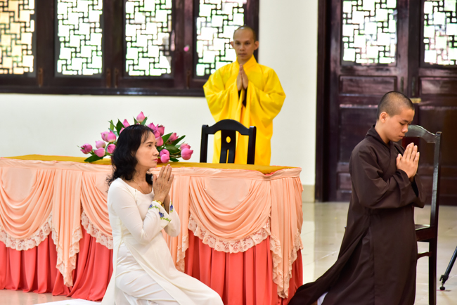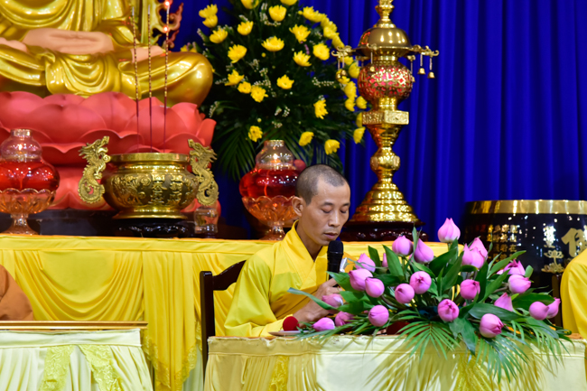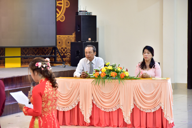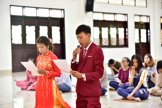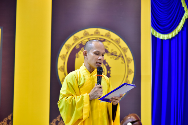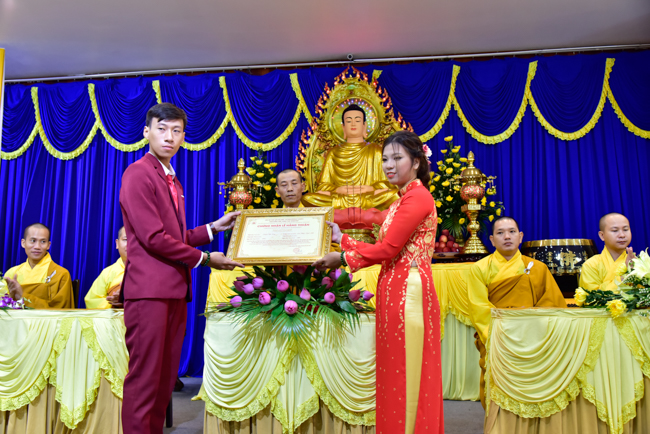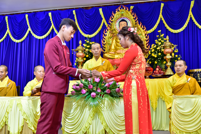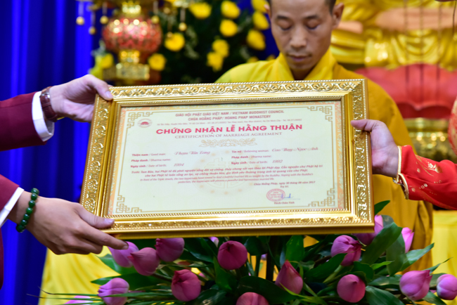 Venerable Thich Tam Chieu, on behalf of Hoang Phap sangha, sends blessings to the just-married couple. He also reminds the bride and groom practicing the spirit of Kà ya sà maggi (six good terms for harmony) from Buddha’s teaching into the family. Buddhists should preserve the five precepts for lay Buddhists and apply Buddha's teachings in life for the peaceful and happy marriage. After that, the Venerable sends Buddhism marital certificate and wedding gift to the young couple. The ceremony ends in joy of all.