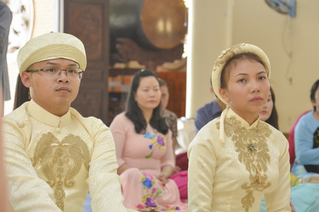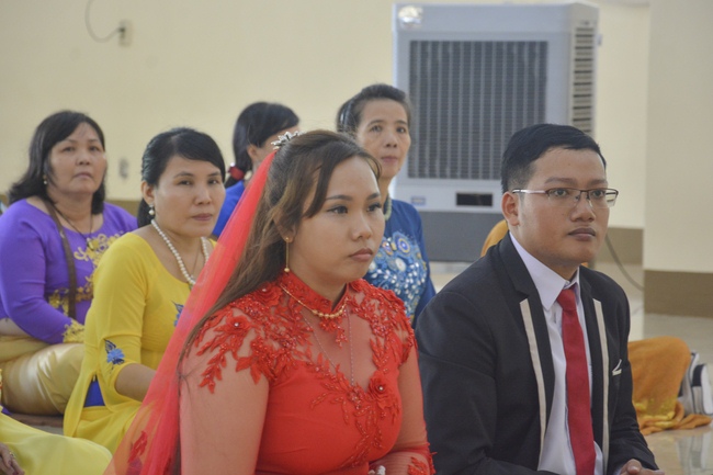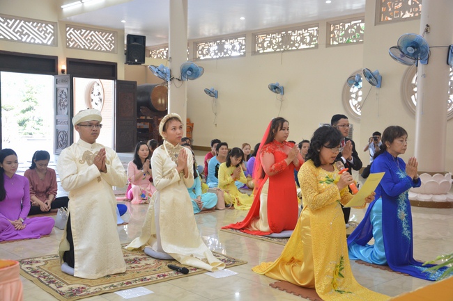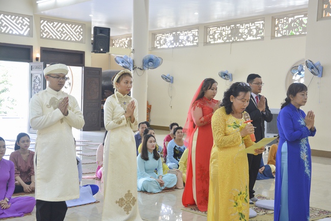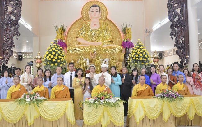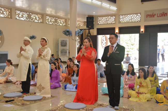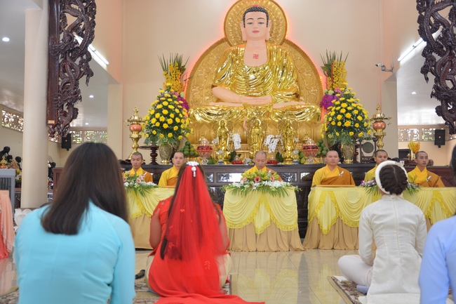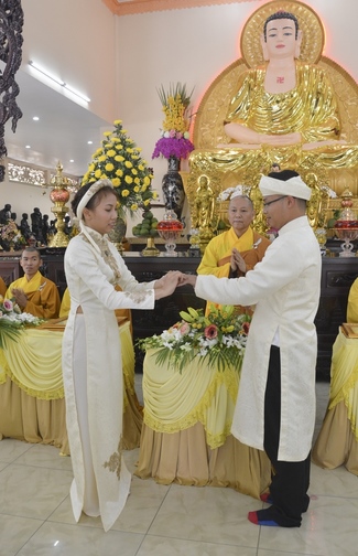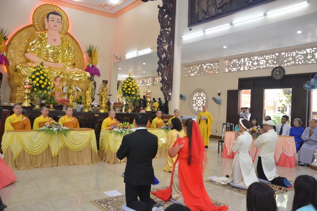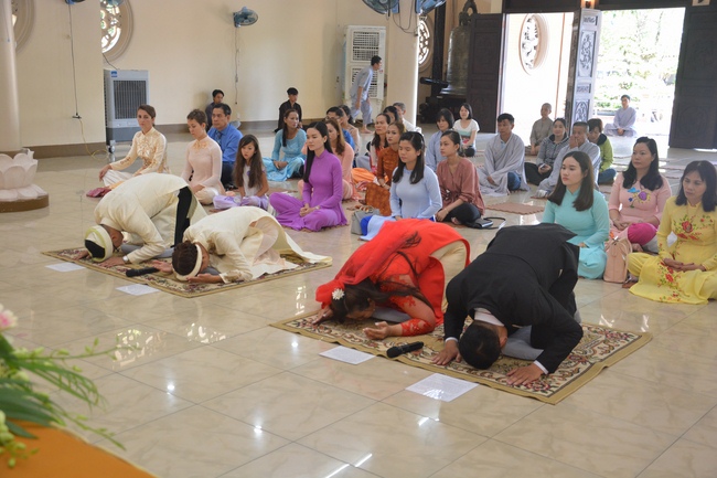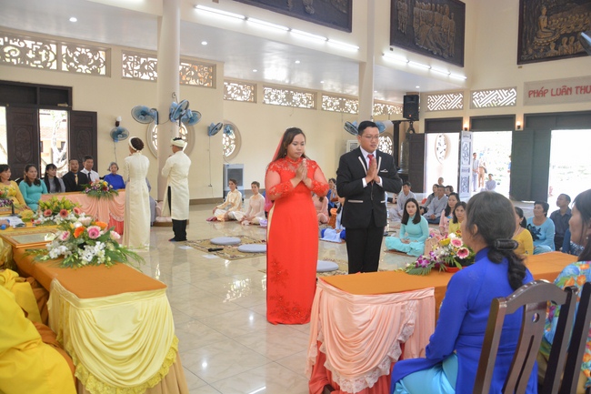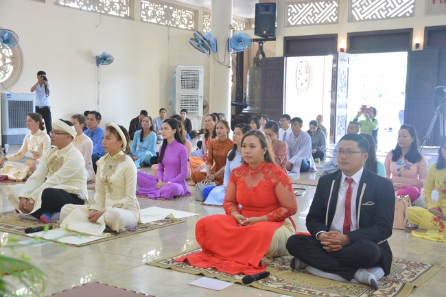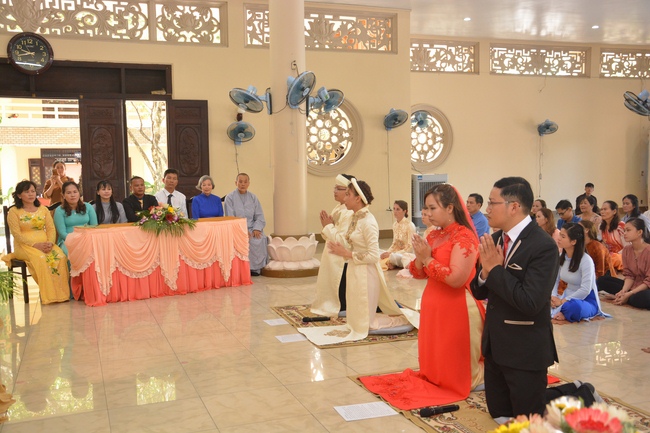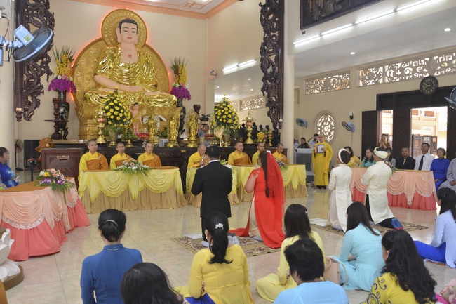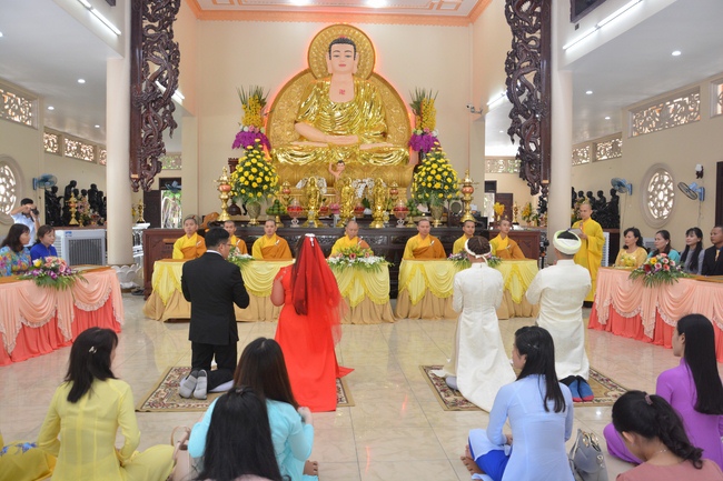 On Oct 27, 2017 (Sep 08, lunar calendar), in the main shrine of the pagoda, monks from Hoang Phap Sangha carried out Buddhism wedding ceremony to young couples: - Groom Le Hoang Sang (religious name Hoang Song) and bride Nguyen Thanh Phuong Uyen (religious name Dieu Tri) - Groom Pham Van Phuoc (religious name Nhat Hai) and bride Le Minh Thu (religious name Lien Thu).