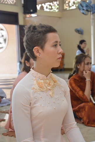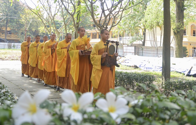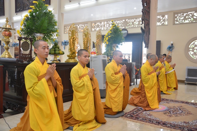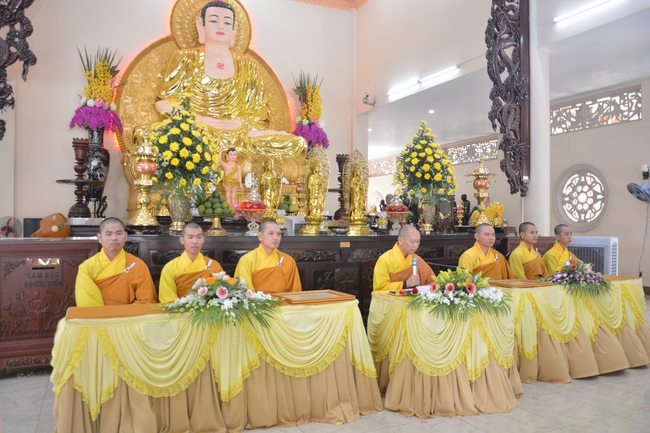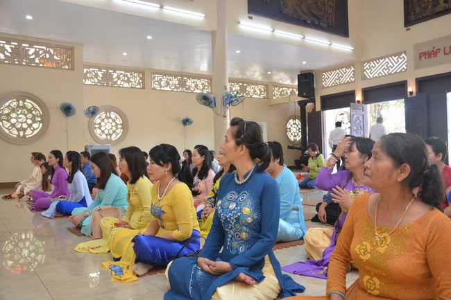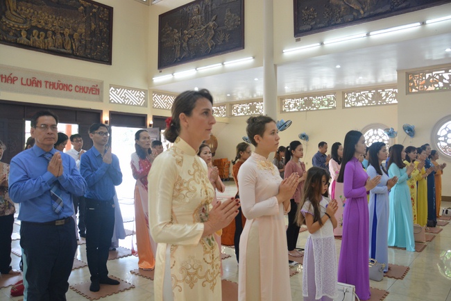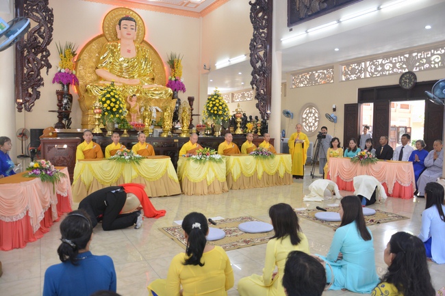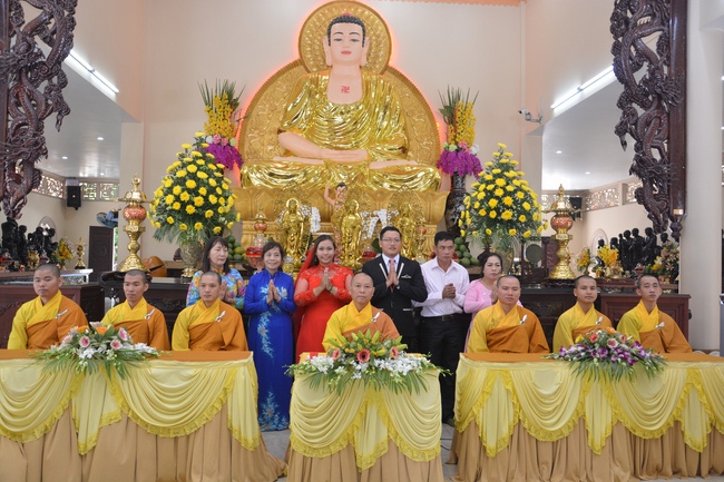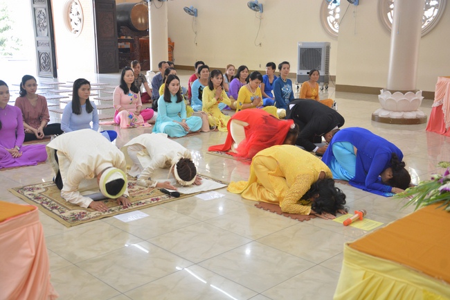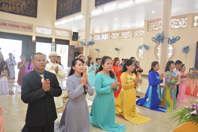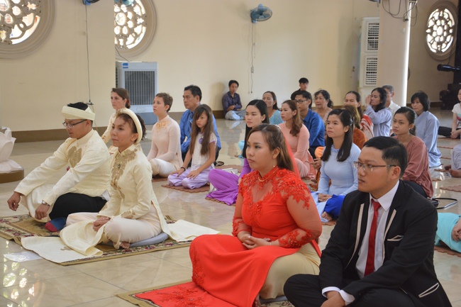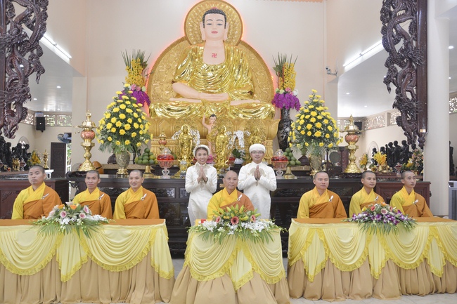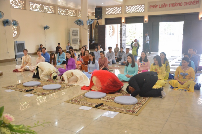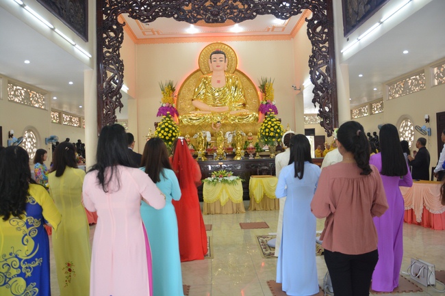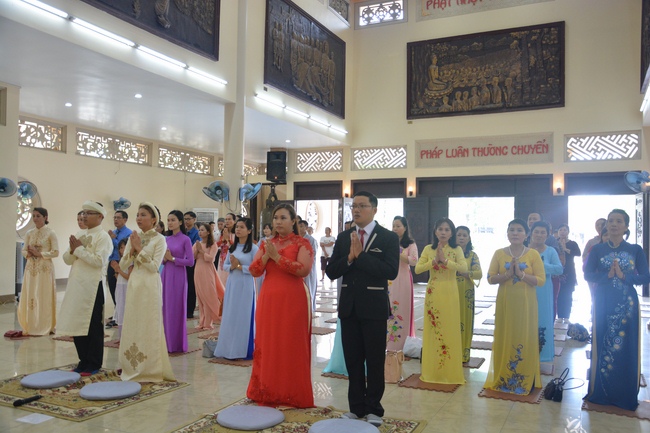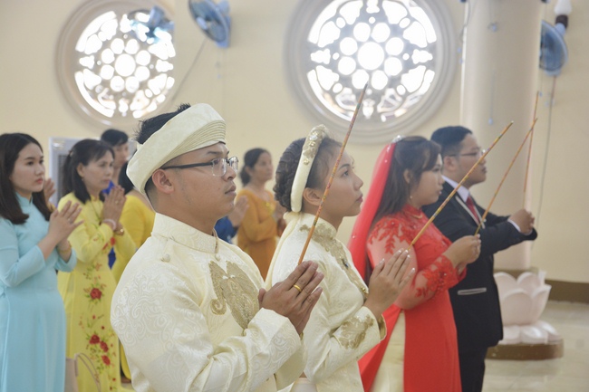 On Oct 27, 2017 (Sep 08, lunar calendar), in the main shrine of the pagoda, monks from Hoang Phap Sangha carried out Buddhism wedding ceremony to young couples: - Groom Le Hoang Sang (religious name Hoang Song) and bride Nguyen Thanh Phuong Uyen (religious name Dieu Tri) - Groom Pham Van Phuoc (religious name Nhat Hai) and bride Le Minh Thu (religious name Lien Thu).