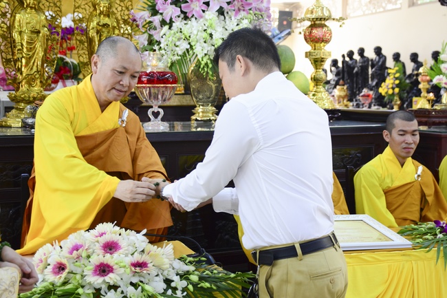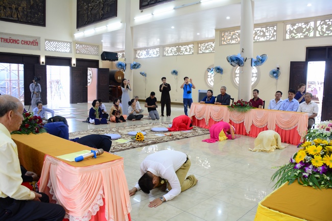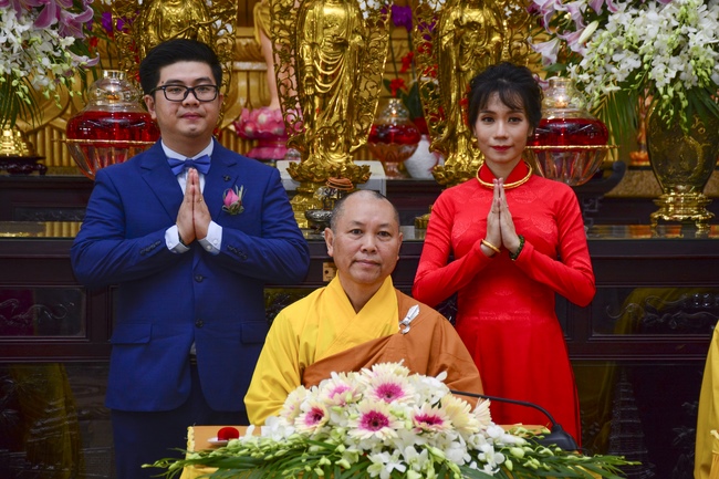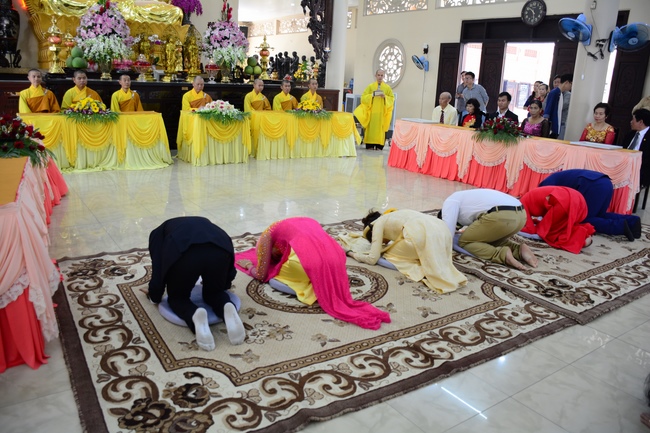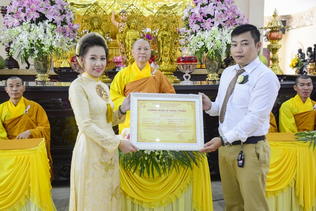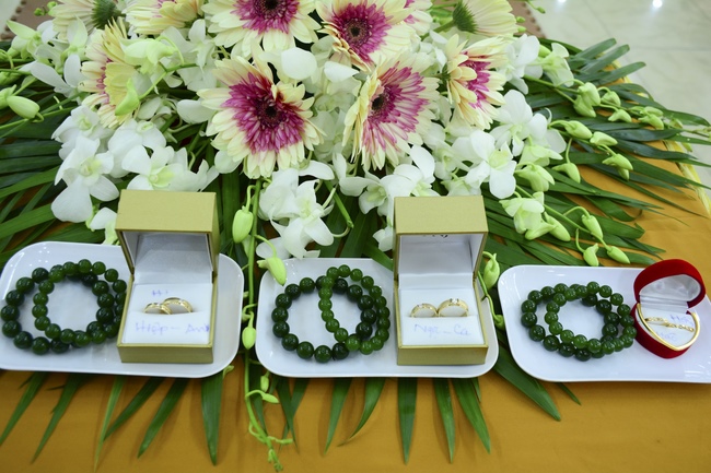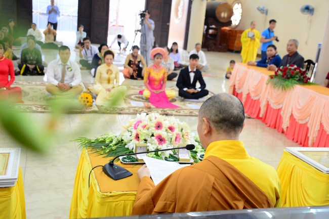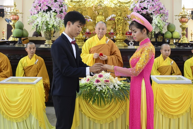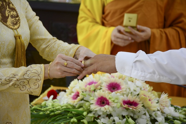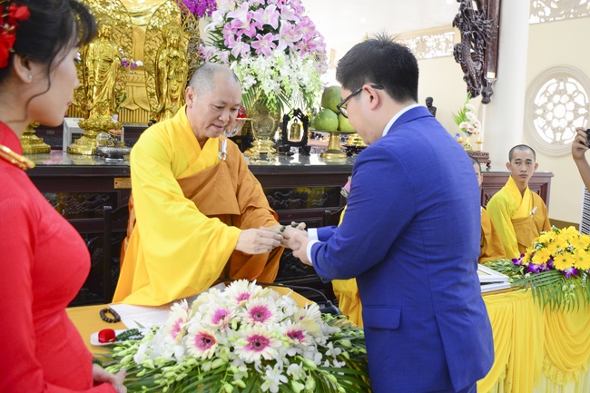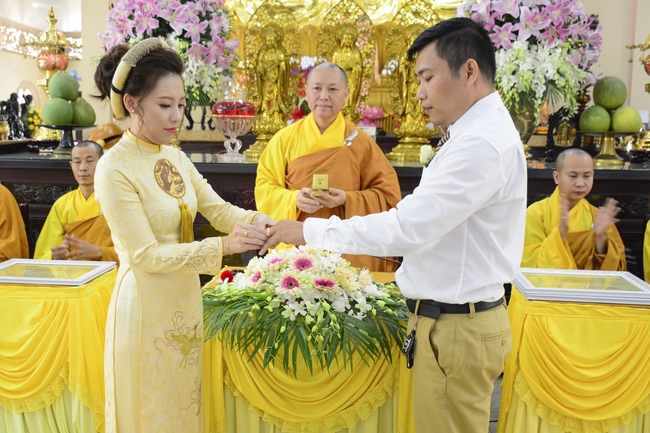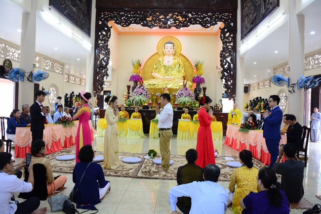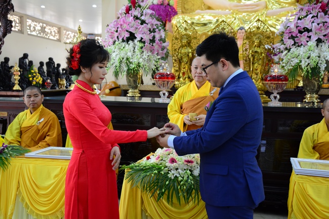 With the witness of Triratna and families, couples performed\r\ntraditional wedding rituals as paying homage to Triratna, kowtowing to express\r\ngratitude to parents’ merits, handing wedding rings and taking the marriage\r\noath living together in the whole life following Buddha’s teachings.