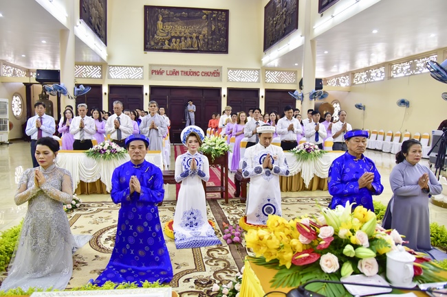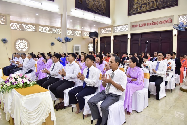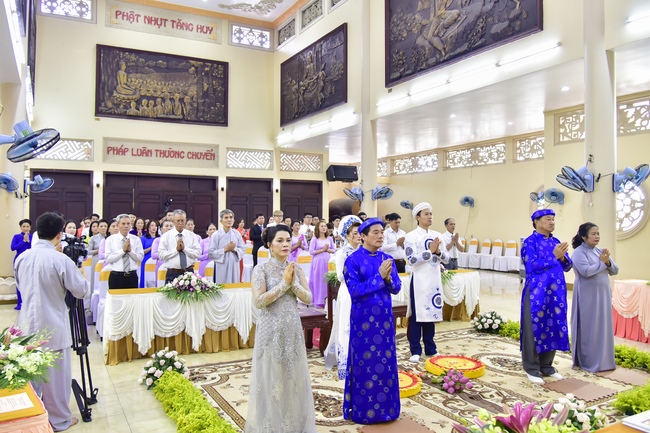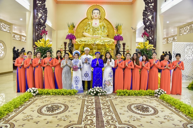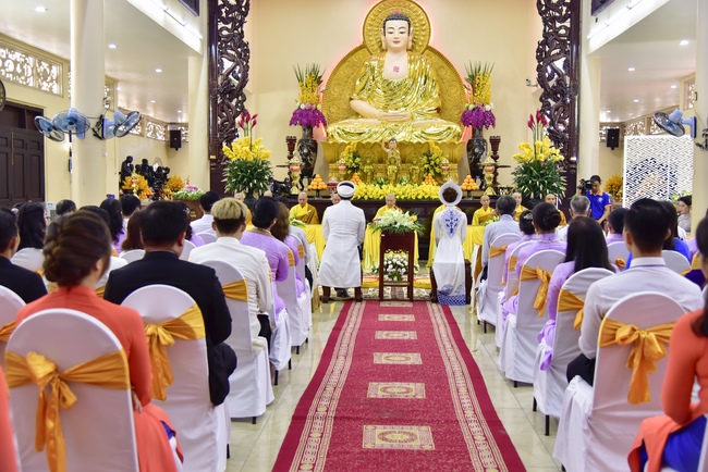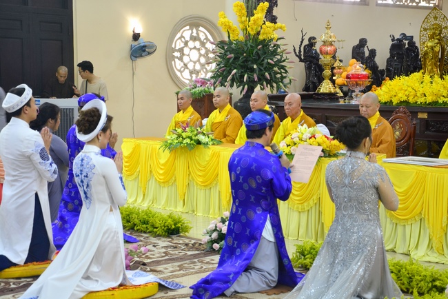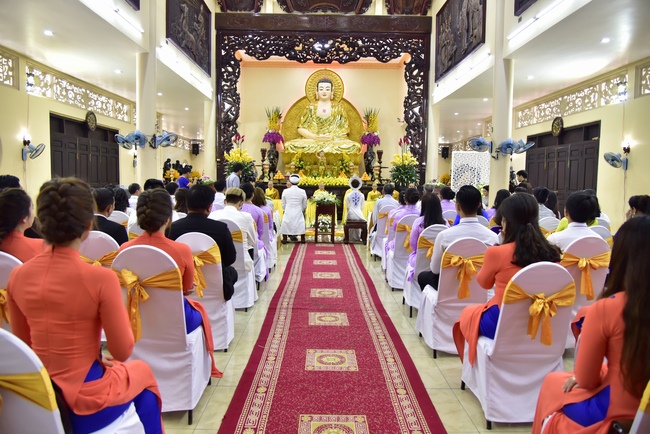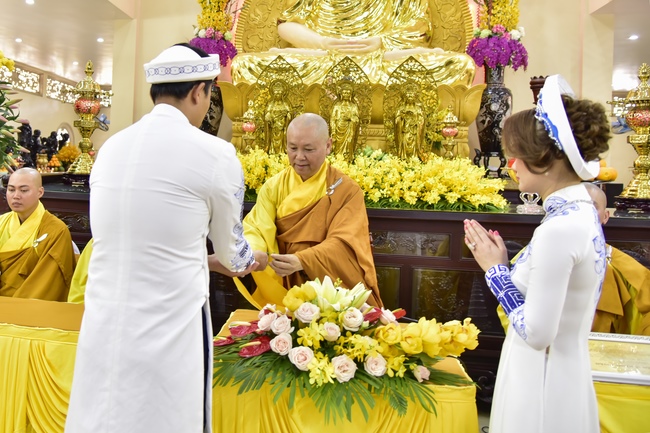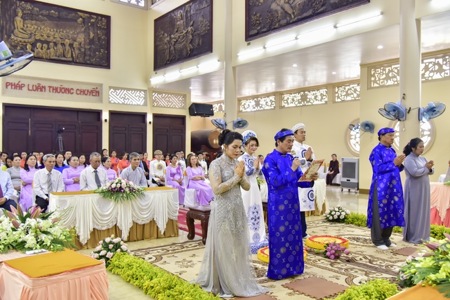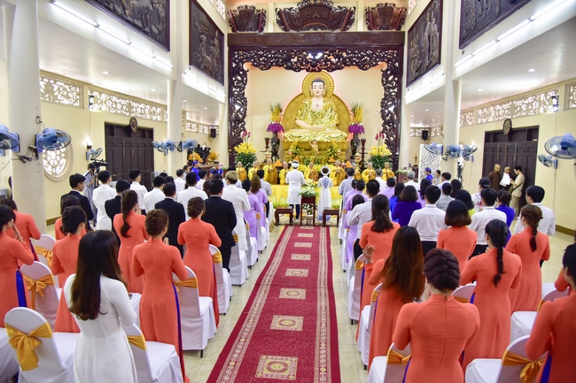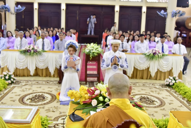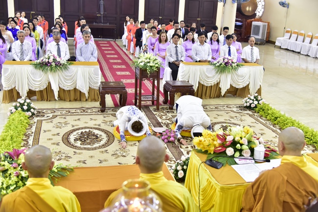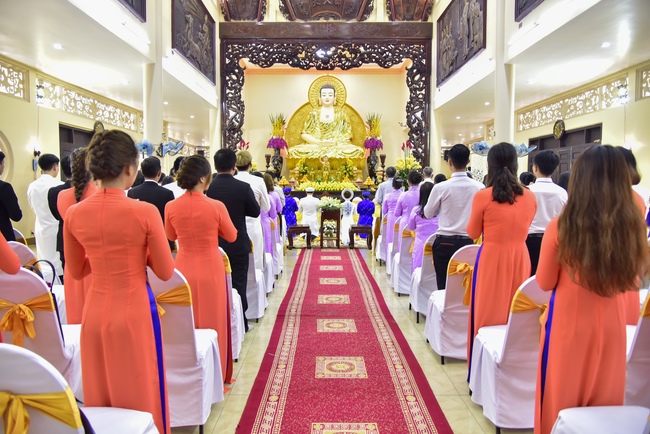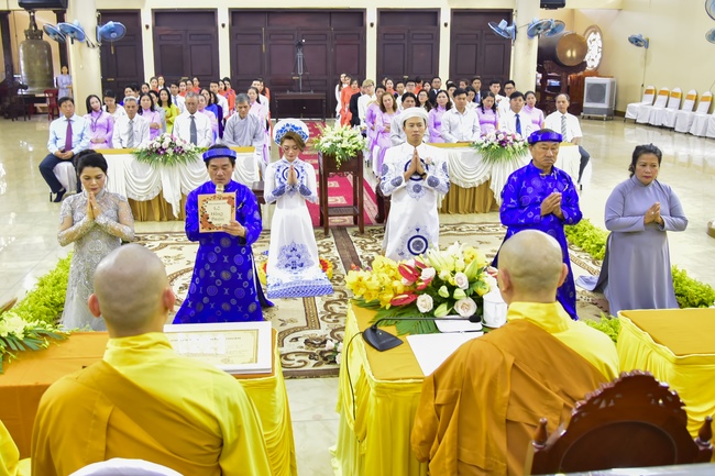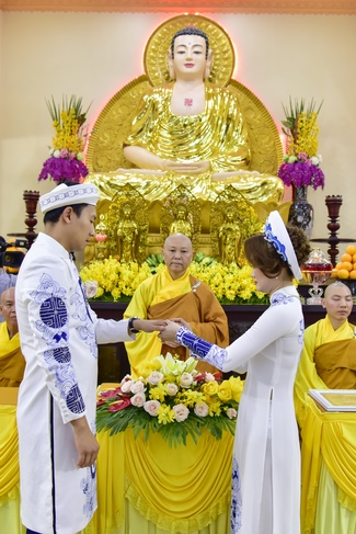 With the witness of Triratna and families, the young couple performs traditional wedding rituals as paying homage to Triratna, kowtowing parents to express gratitude to their large merit, handing wedding rings and taking marriage oath abiding Buddha teachings in the whole life.