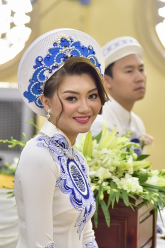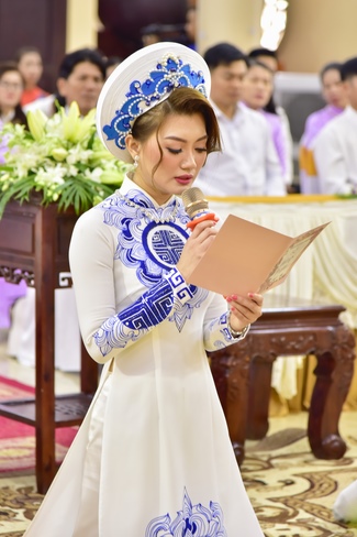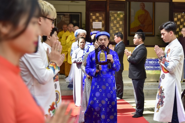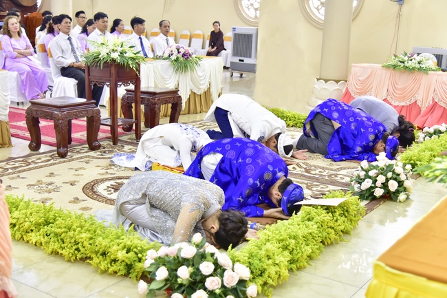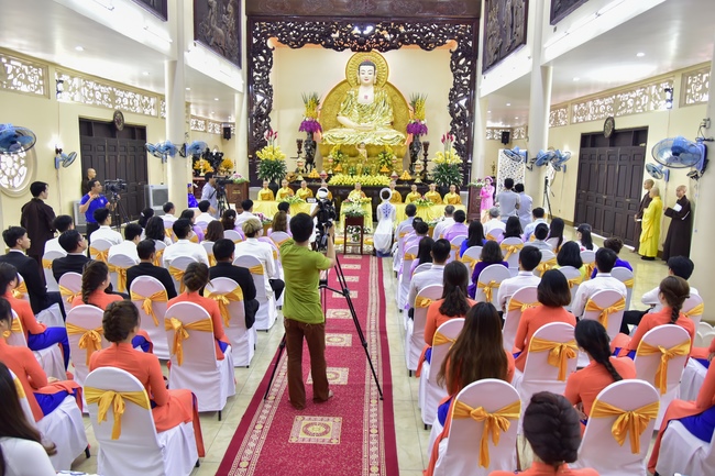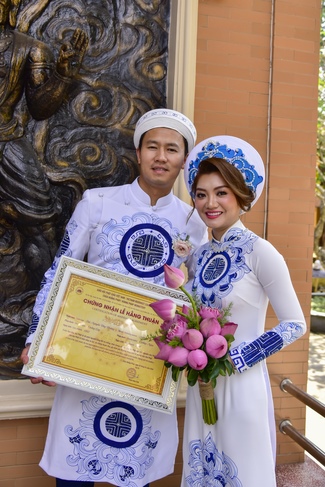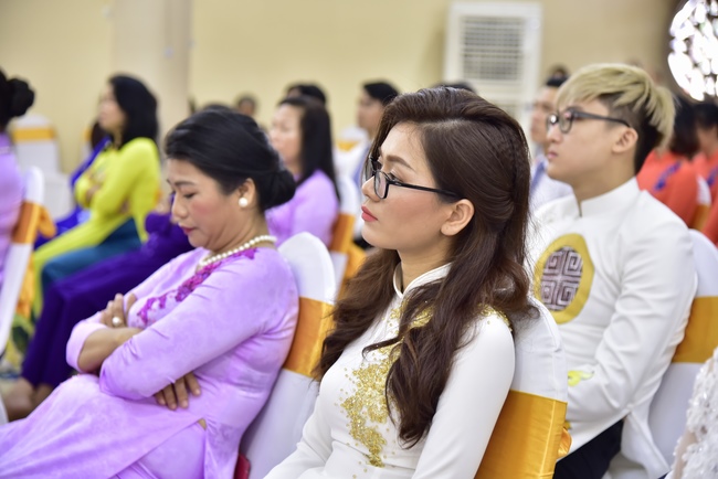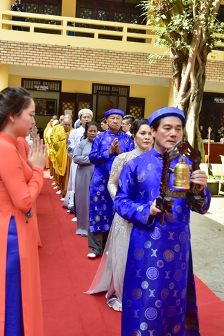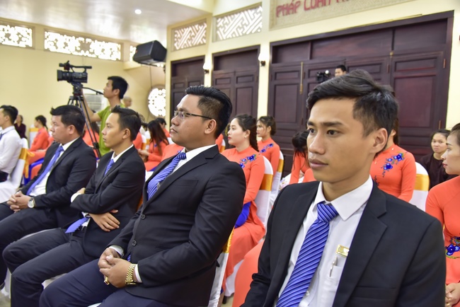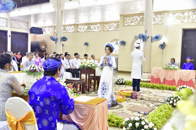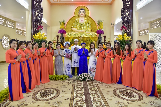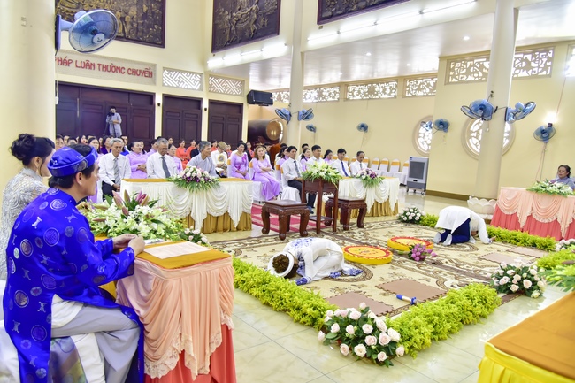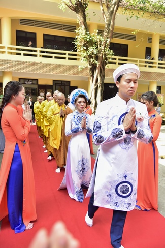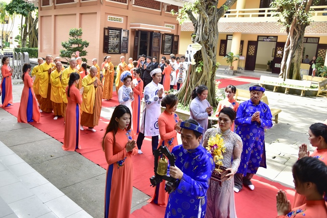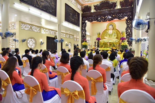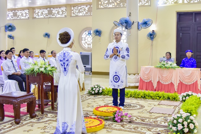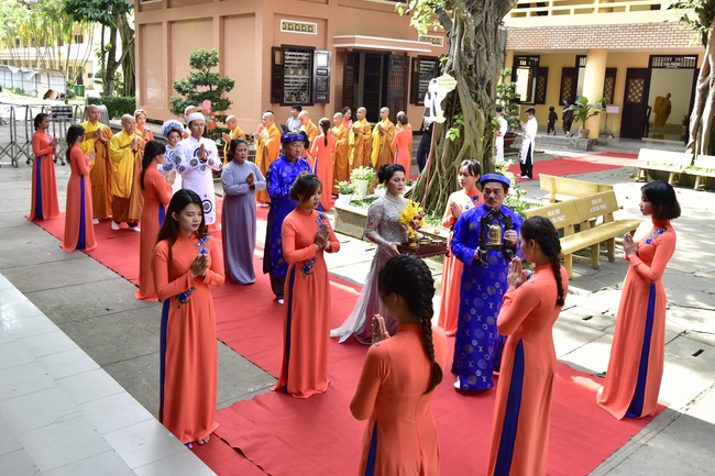 With the witness of Triratna and families, the young couple performs traditional wedding rituals as paying homage to Triratna, kowtowing parents to express gratitude to their large merit, handing wedding rings and taking marriage oath abiding Buddha teachings in the whole life.
