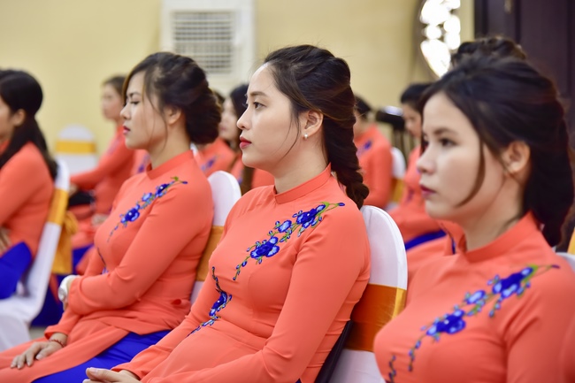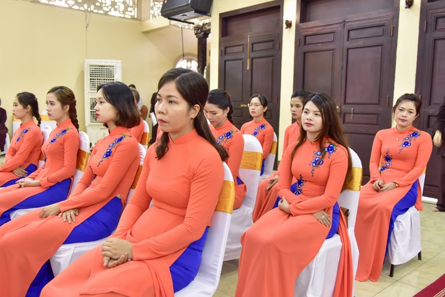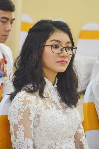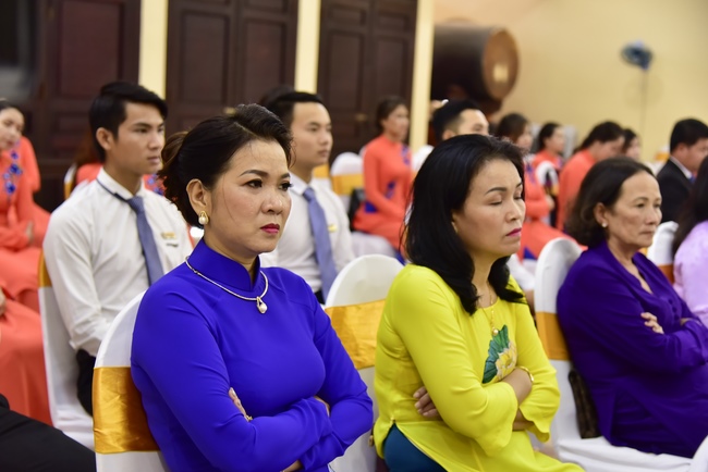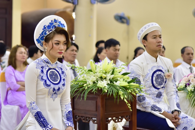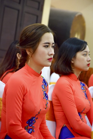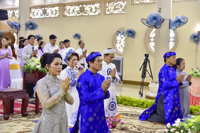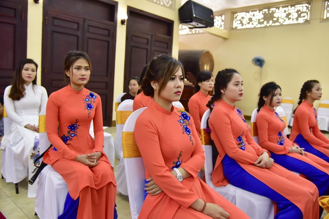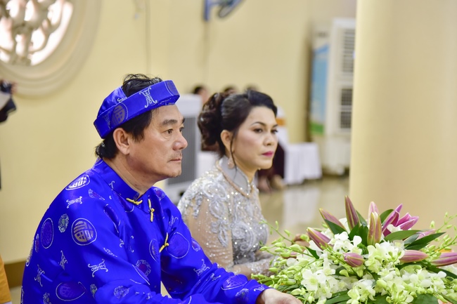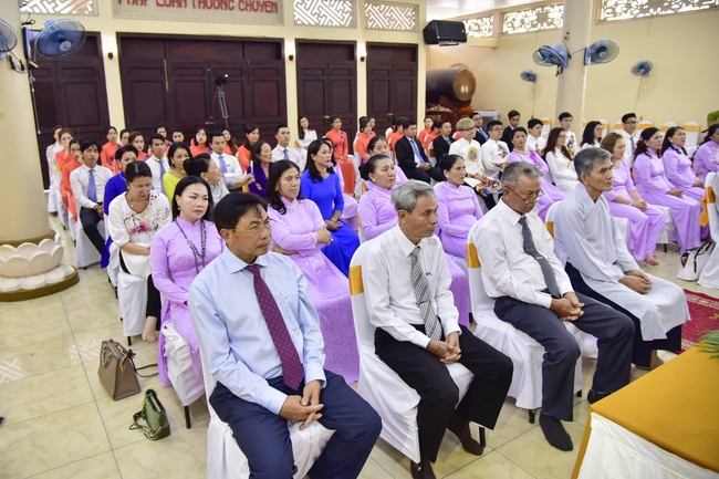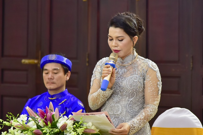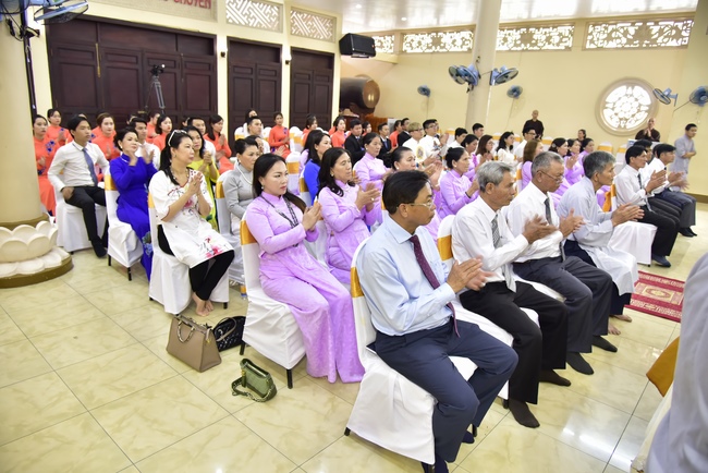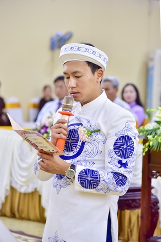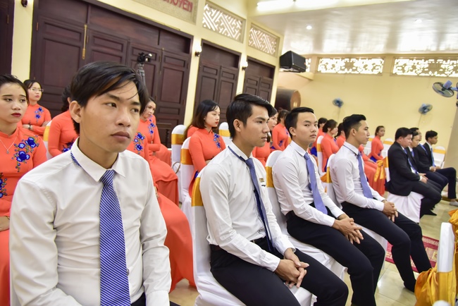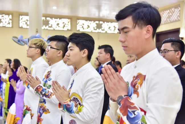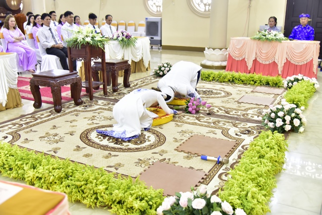 With the witness of Triratna and families, the young couple performs traditional wedding rituals as paying homage to Triratna, kowtowing parents to express gratitude to their large merit, handing wedding rings and taking marriage oath abiding Buddha teachings in the whole life.