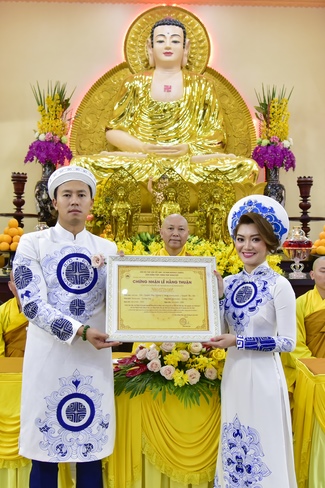 In addition, he also reminds young couple having proper preparation for future. It is taking refuge in Triratna and abiding five precepts for lay Buddhists. Each member of the family should constantly cultivate Dharmic knowledge, be virtuous people, believe in cause and effect rule. Five precepts for lay Buddhists are basic morality for human beings. Whoever preserves them can have peace in life both in present and future.