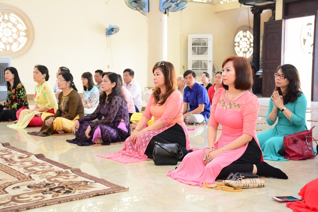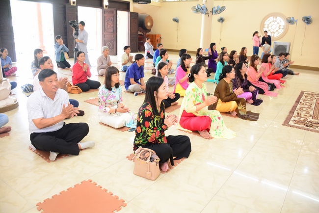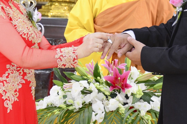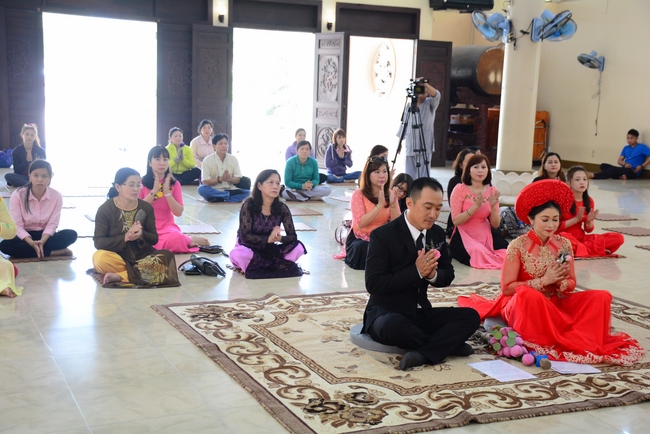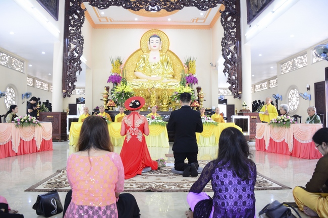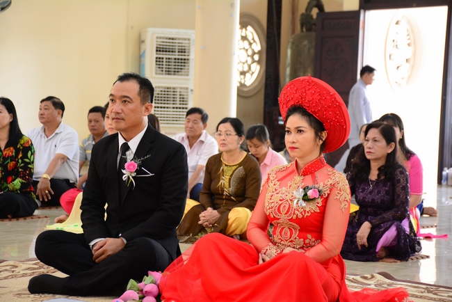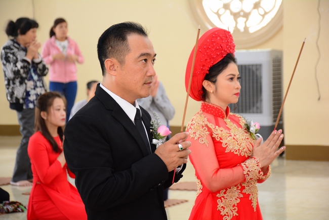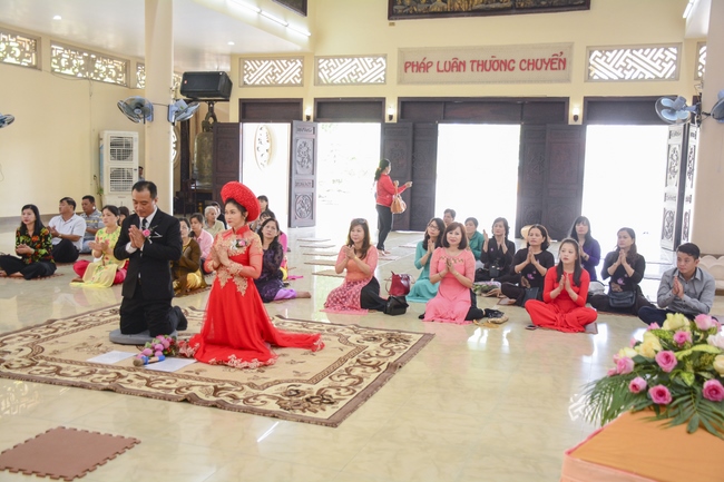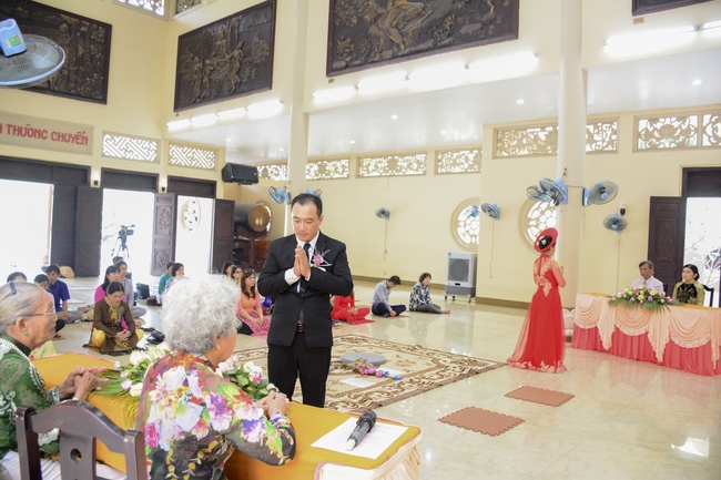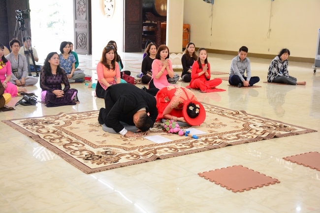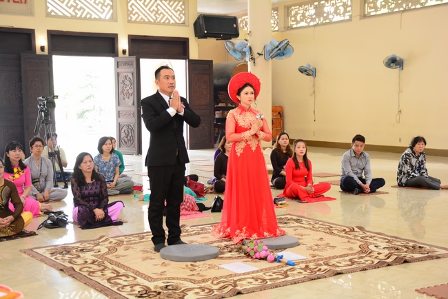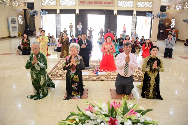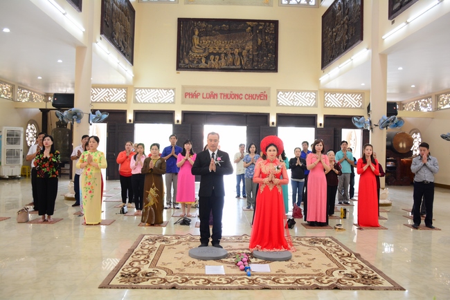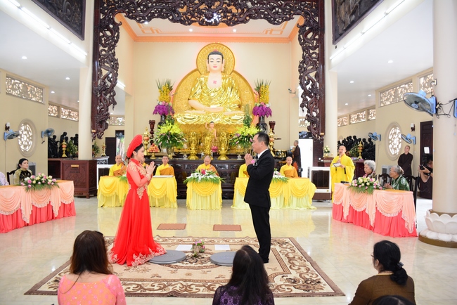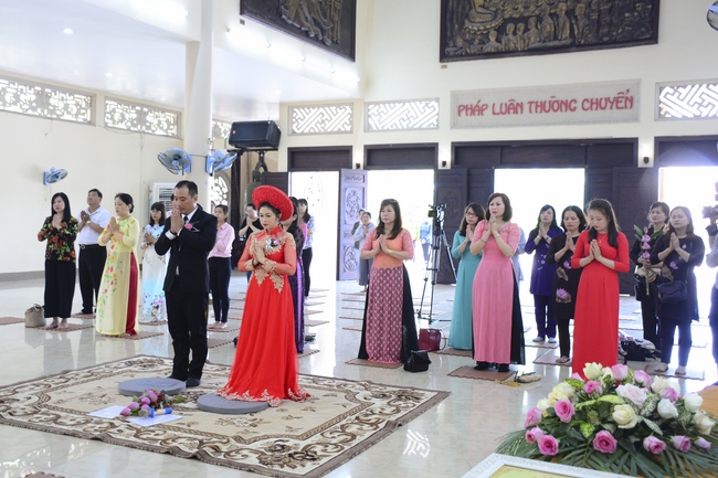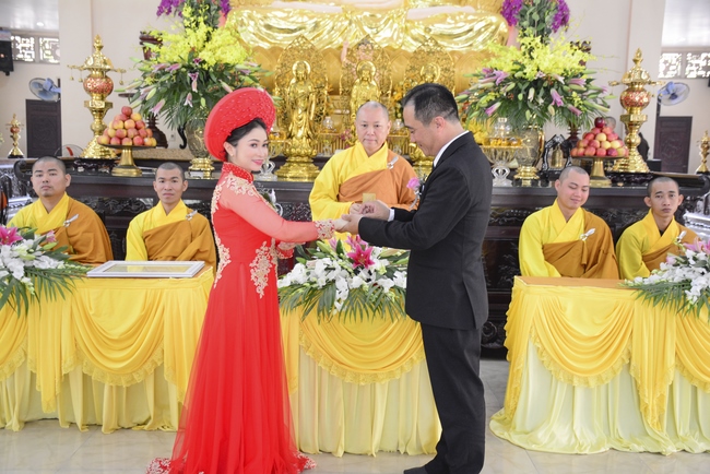 With the witness of the Triple Gems (Buddha, Dharma, Sangha) and the couple’s family, the Buddhist wedding activities with traditional rites were done by the pair as paying homage to the Triple Gems, kowtowing to express gratitude to parents’ merits, handing wedding rings and taking the marriage oath living together in the whole life following Buddha’s teachings.