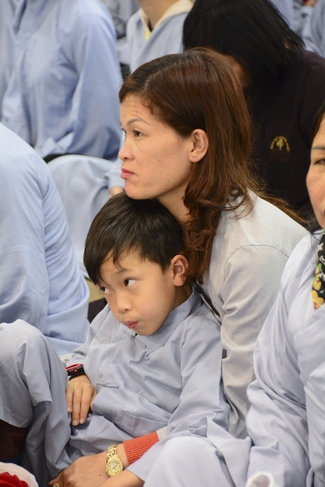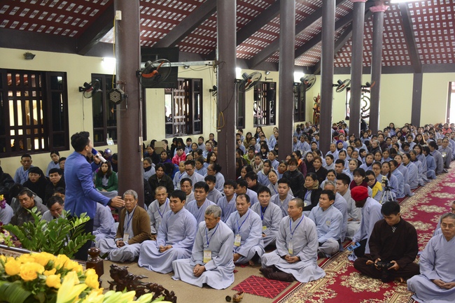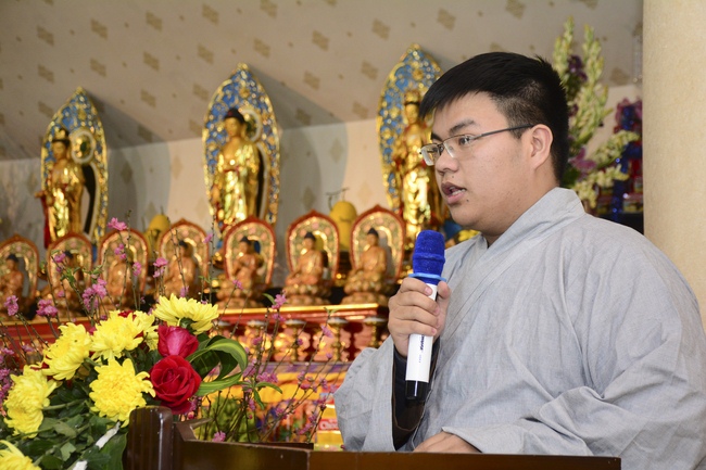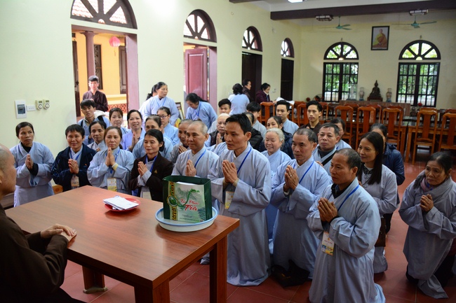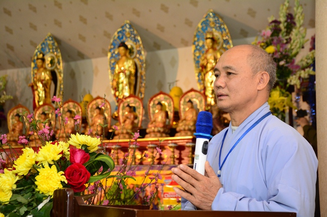 In the afternoon, on behalf of the venerables, Reverend Thich Tam Hoa explained definitions and meanings of basic teachings such as Taking Refuge, Three Germs, Ksama etc. After that, Buddhists were guided to practice the necessary etiquette for Buddhists such as holding their hands together, bowing, praying, ect