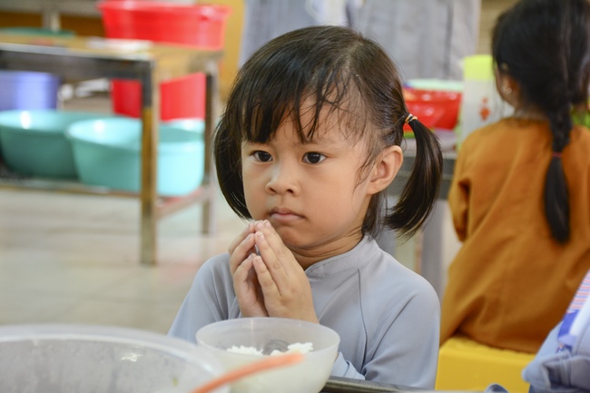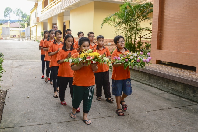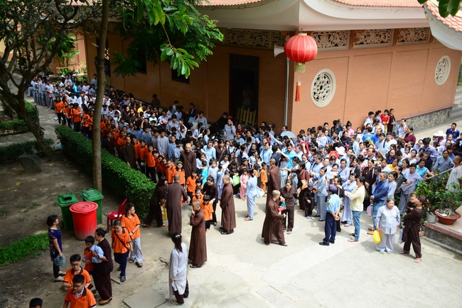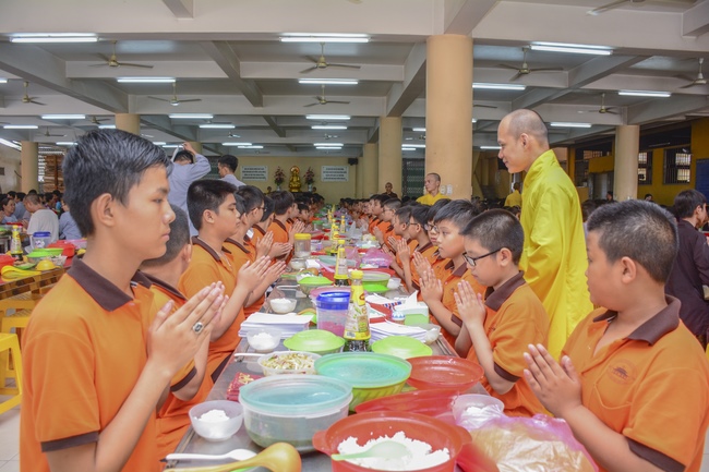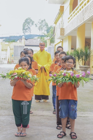 After lunch, monks of Hoang Phap Pagoda make the alms tour around the main hall for children’s donation. This is the opportunity for them to practice offering, sowing good deeds, opening the compassion and nurturing the belief in Triratna.