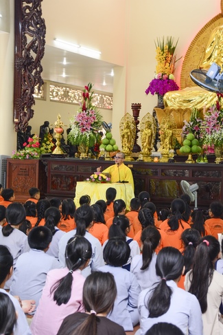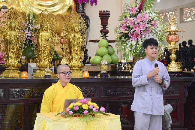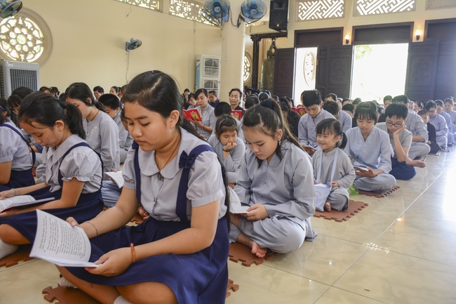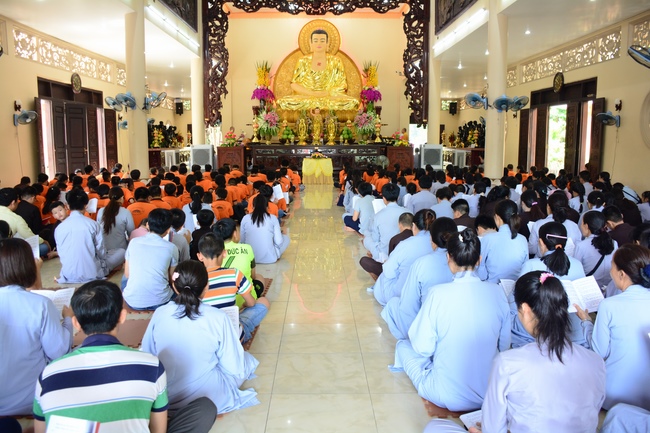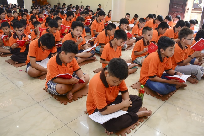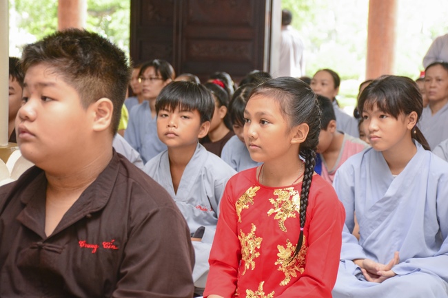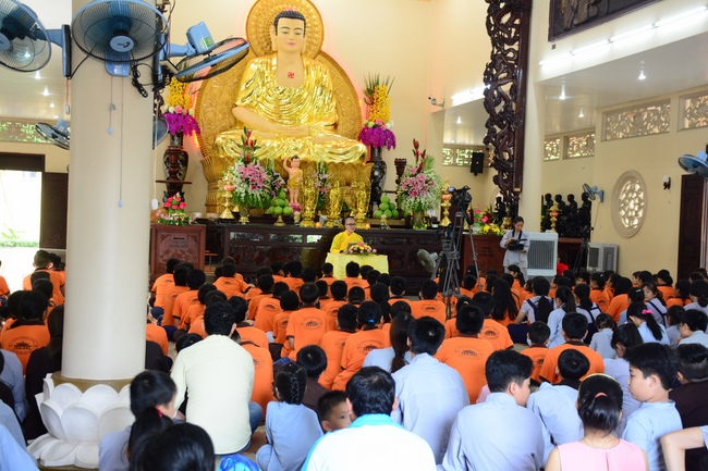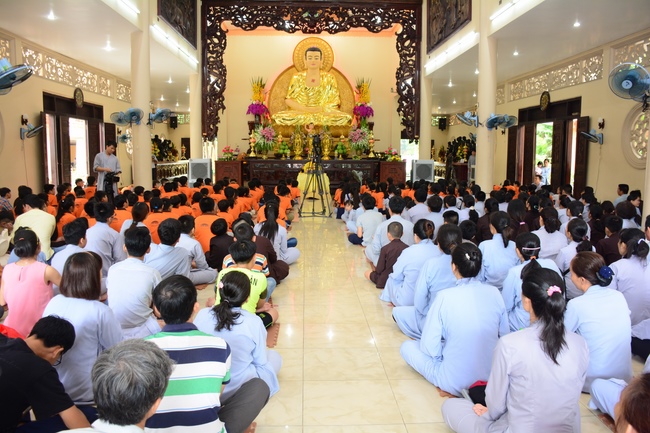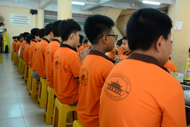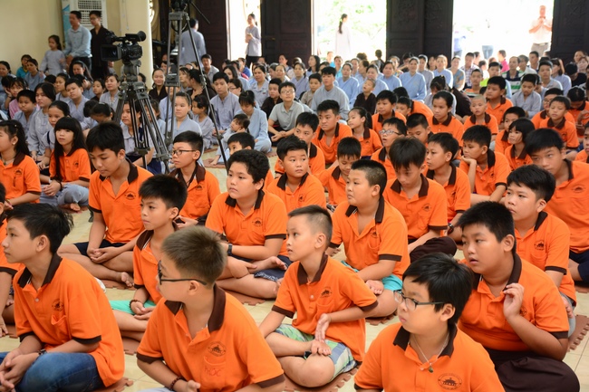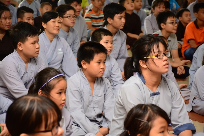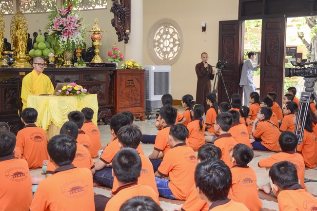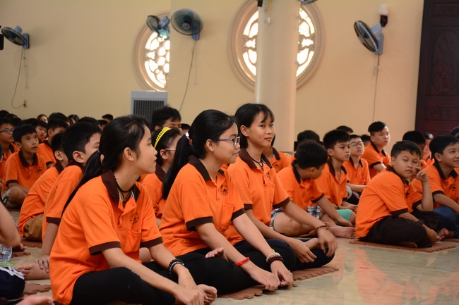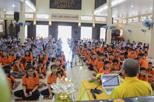 In the morning, all gather in the main hall to listen to the Dharma talk from Venerable Thich Tam Tien, monk of Hoang Phap Pagoda, teaching them practical, simple things to practice in daily life as: be integrity, regularly self-contemplate, share house-work with family members, make offerings to Triratna to diminish the greedy mind, satisfy with current situation, avoid competing with friends and others, be dutiful and love parents, ...