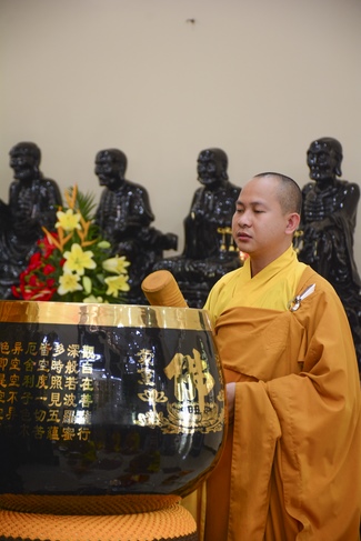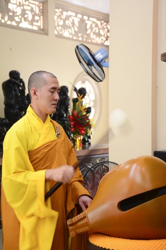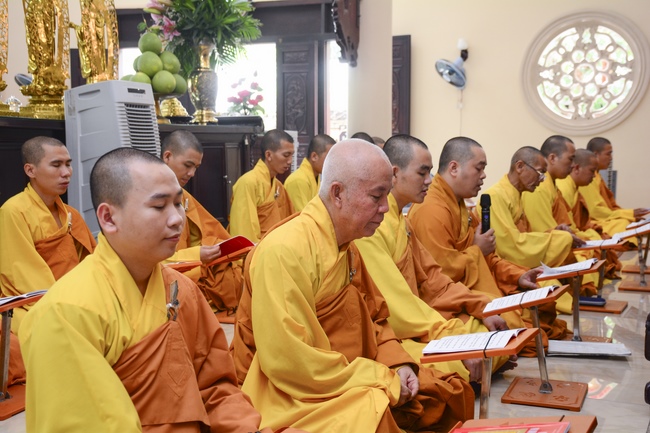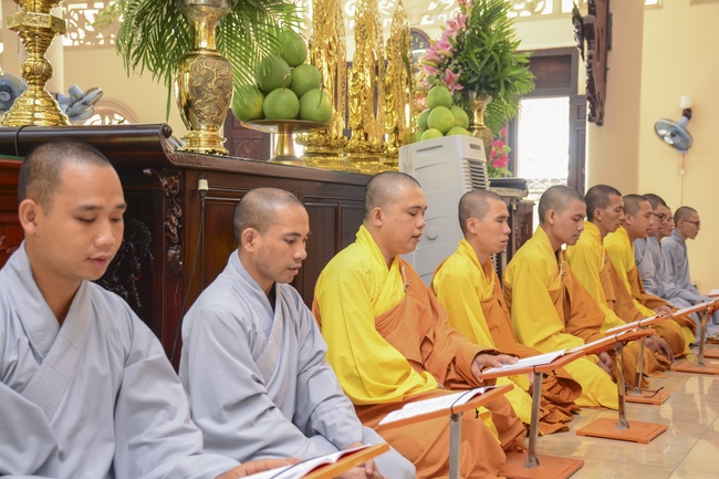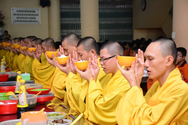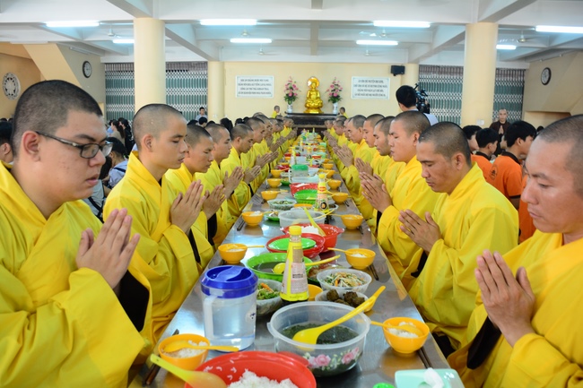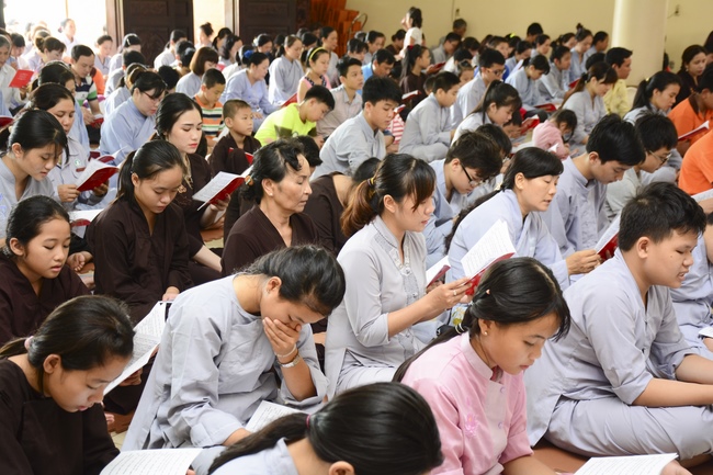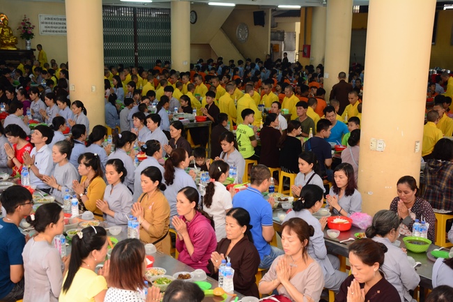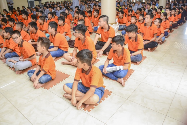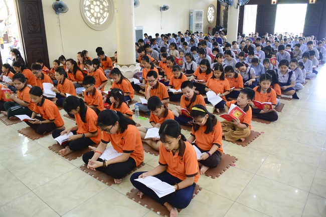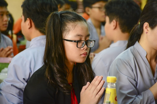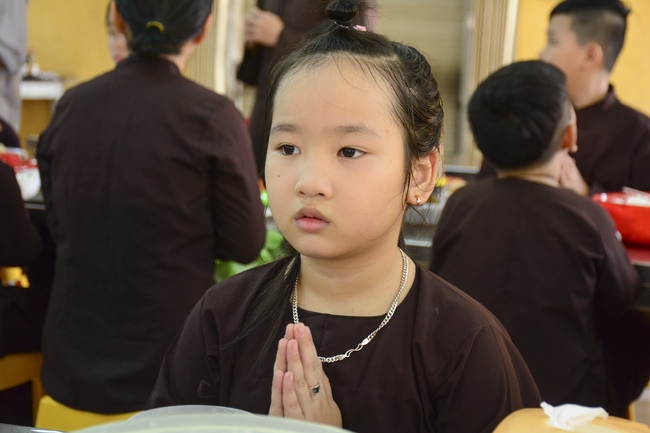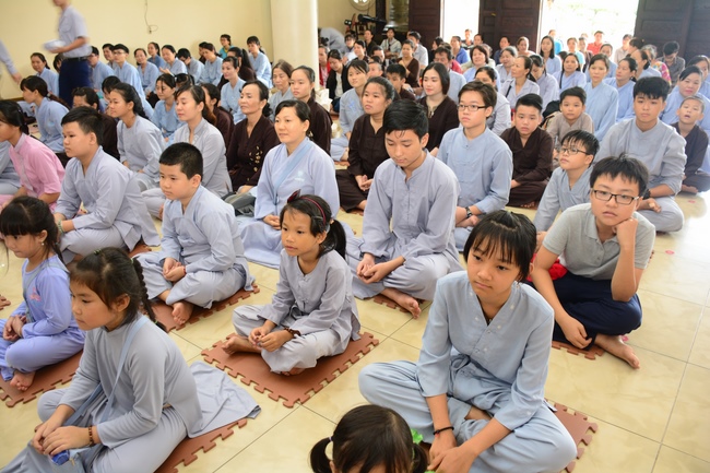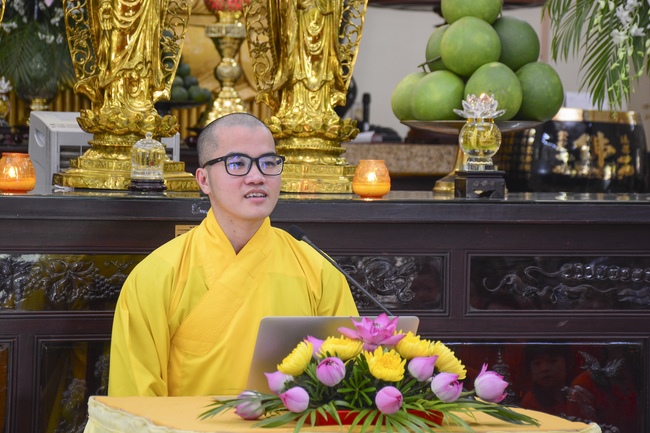 In the morning, all gather in the main hall to listen to the Dharma talk from Venerable Thich Tam Tien, monk of Hoang Phap Pagoda, teaching them practical, simple things to practice in daily life as: be integrity, regularly self-contemplate, share house-work with family members, make offerings to Triratna to diminish the greedy mind, satisfy with current situation, avoid competing with friends and others, be dutiful and love parents, ...