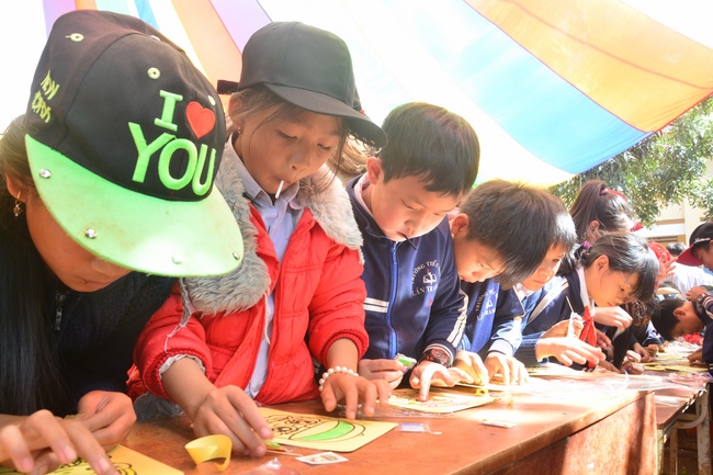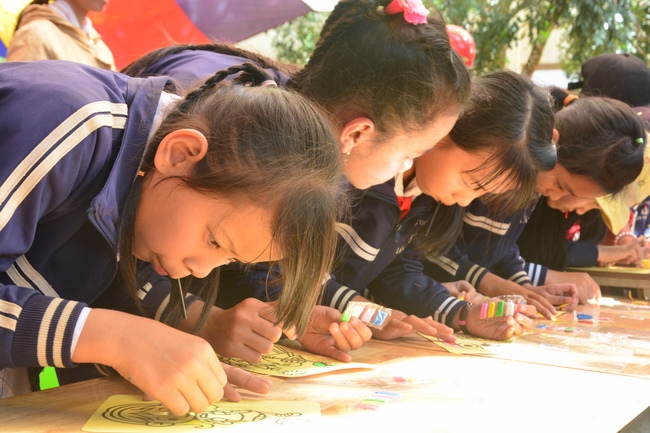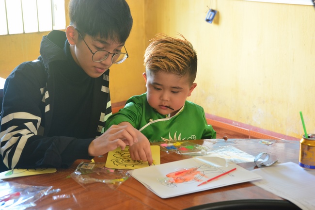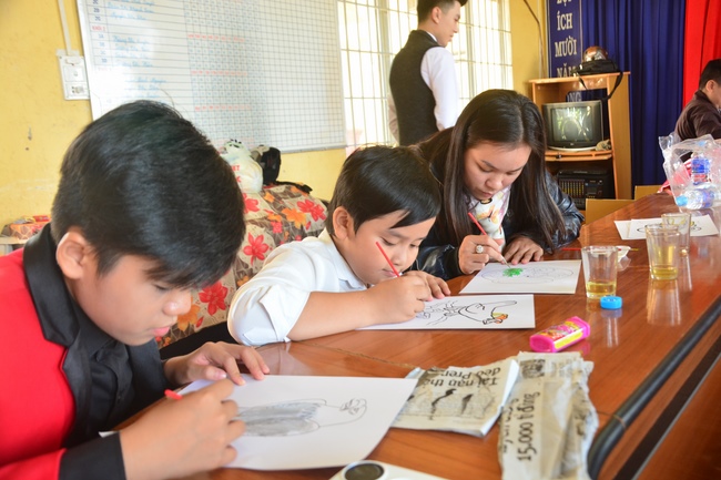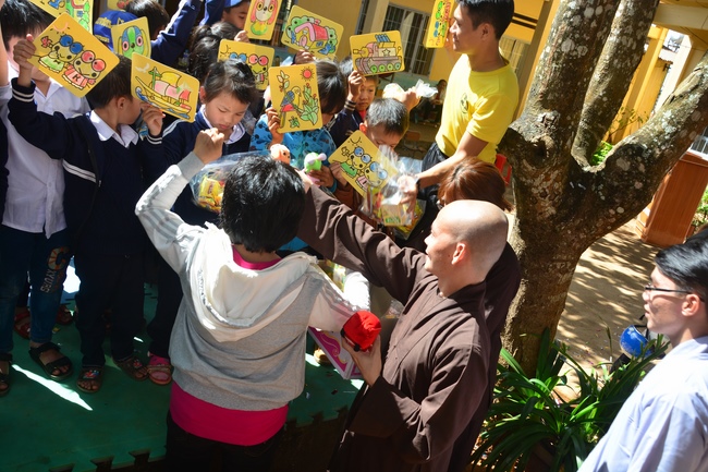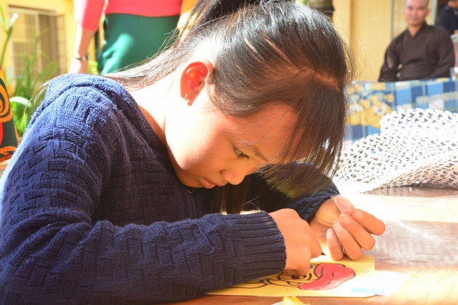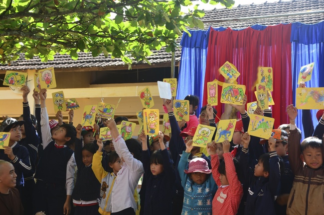 On the activity, the monks invited kid singers who came from HCMC such as Thuy Binh, Nguyen Khang, Nguyet Thu, Kim Ngoc as well as the kid ones at this school. The goal is to help them with useful fun, building a unity spirit and loving one another. Meanwhile, it reminds them of love toward small animals, aiming at developing compassion on their hearts. The Sangha taught them how to paint colorful pictures of the shapes such as fruit, animals, friendly and cute characters of cartoon films. They excitedly and enthusiastically created many different colors. Those products were painted would be their meaningful presents in the extracurricular activity.