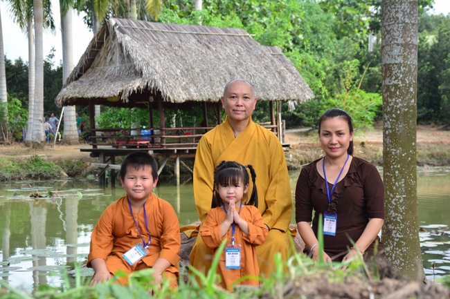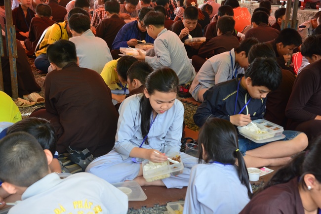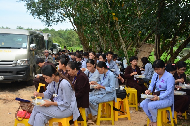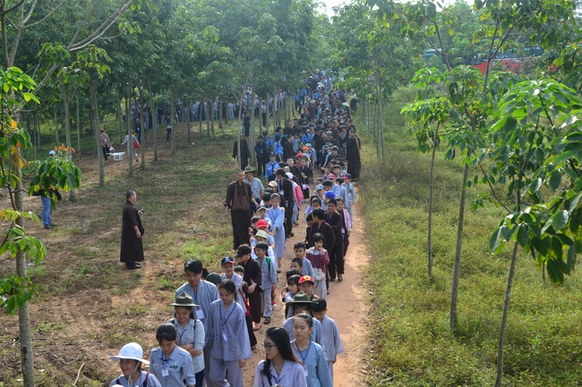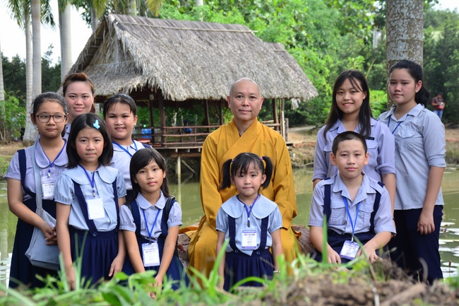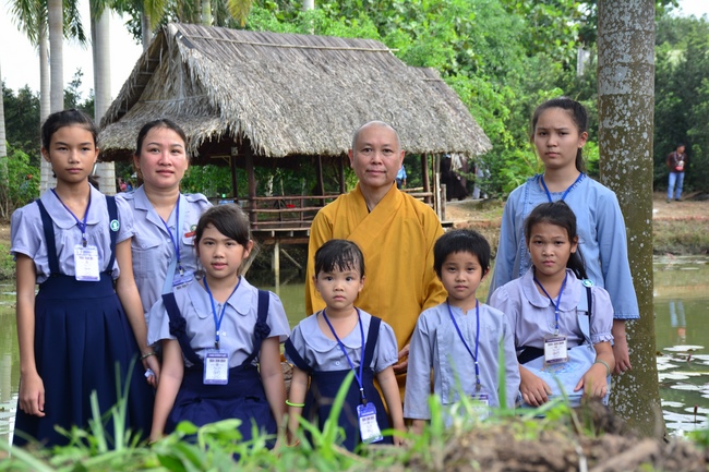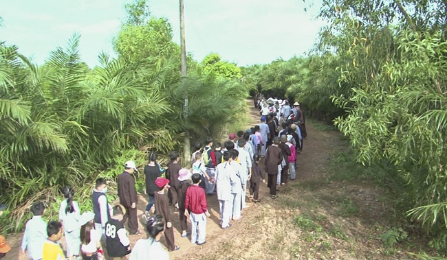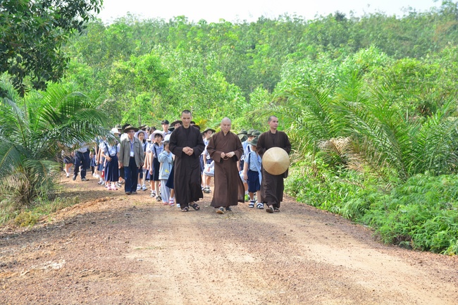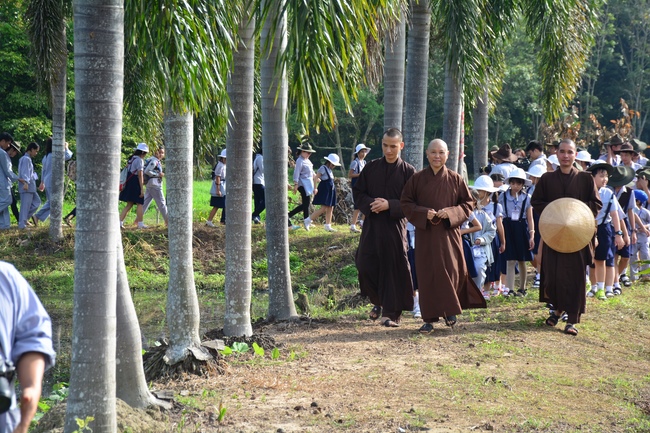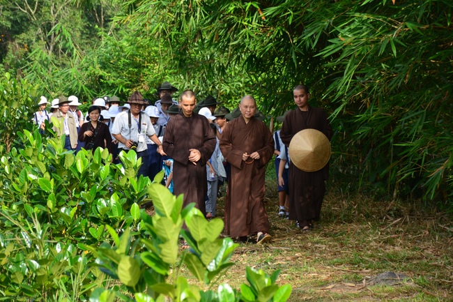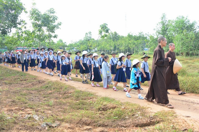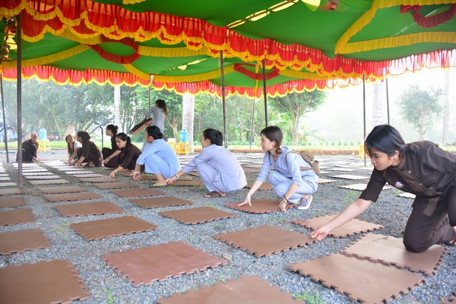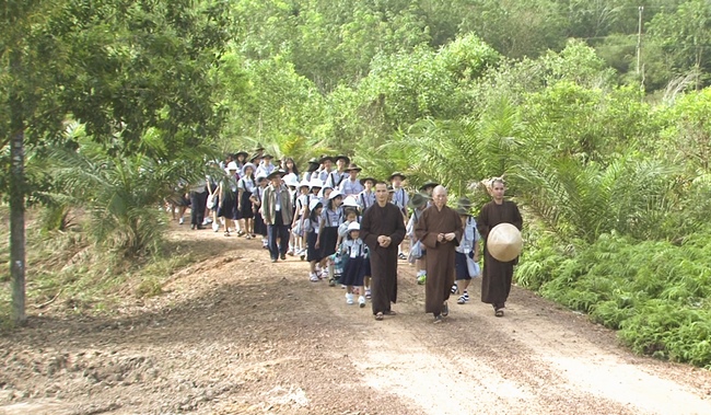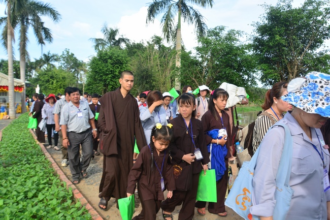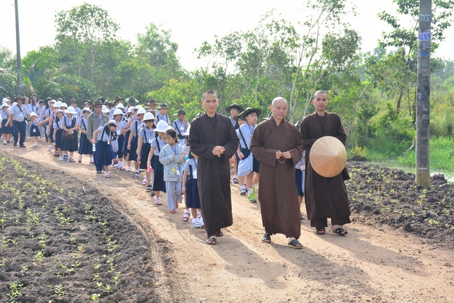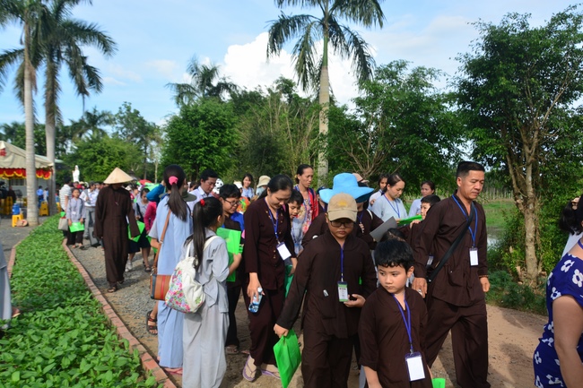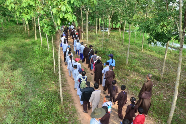 In the morning, after gathering at the cultivating area, Senior Venerable Thich chan Tinh, Abbot of Hoang Phap Pagoda, Chief of Organizers led them to meditation walking around the branch pagoda’s area. The steps are peaceful and free in the shining of early morning, the joyfulness on their faces, particularly to the children; because this is the first time they were instructed meditation walking in the nature, far from busy life of crowded streets, the stressful learning time. These meditative walking steps help bring them delight and excitement, which helps them recognize that the cultivating is not the strict and humdrum activity but it begins a meaningful day.