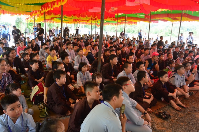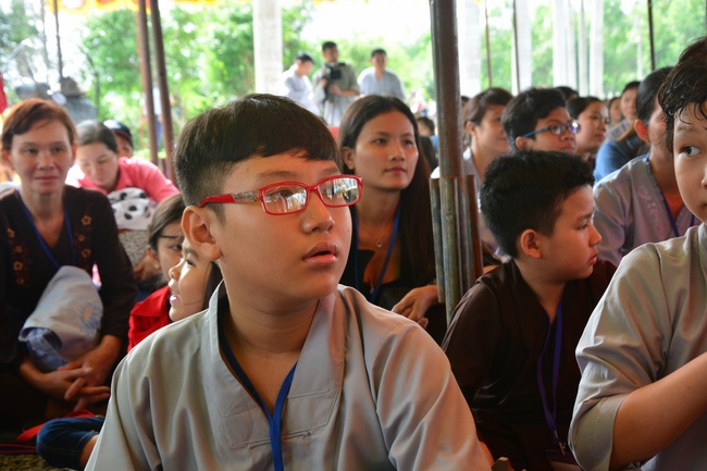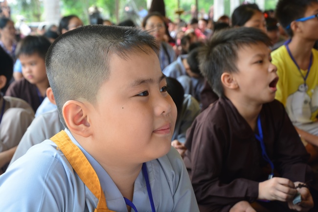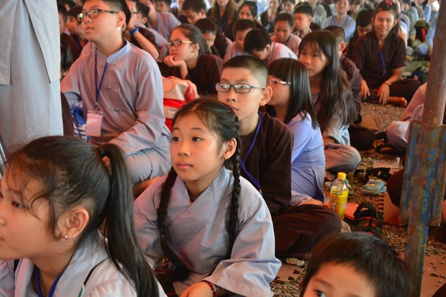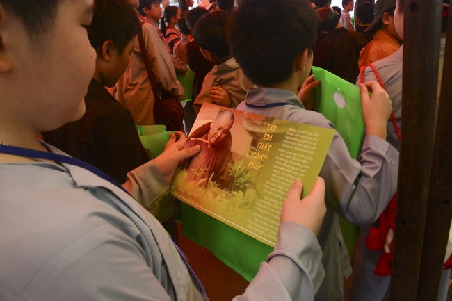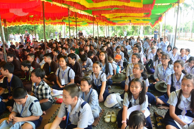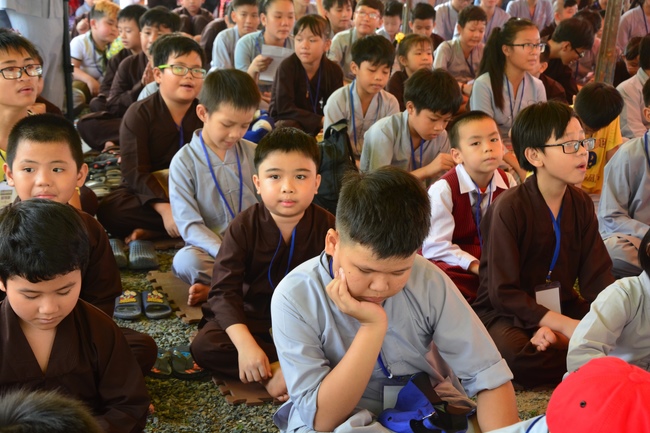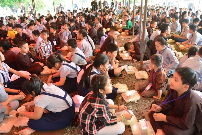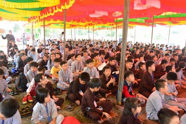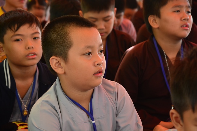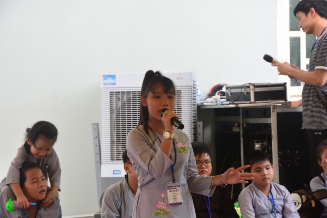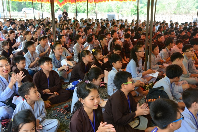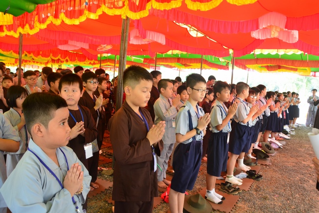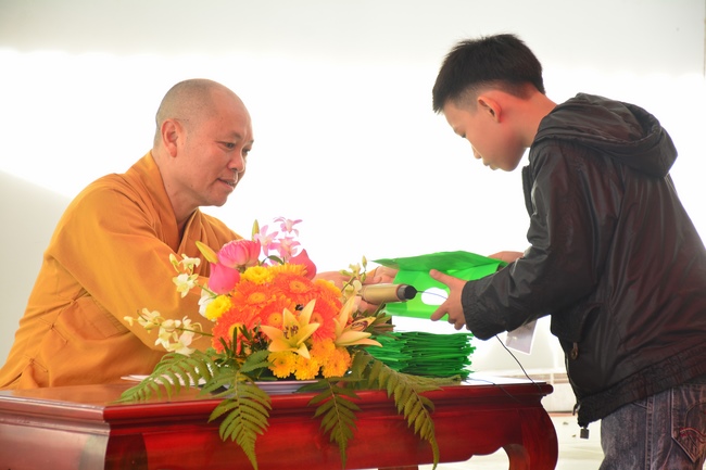 After that, they took a rest and gathered in the front of lecture hall for activities and fun. Next, all of them hold their hands as lotus shape to solemnly welcome Senior Venerable Thich Chan Tinh, Abbot of Hoang Phap Pagoda, who had a speech to them, the owners of the country in the future.