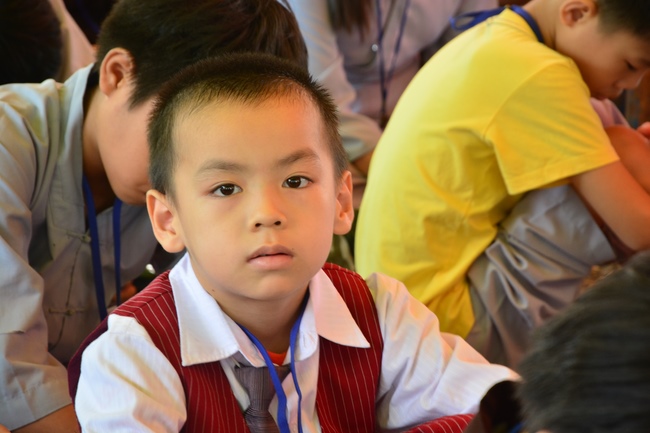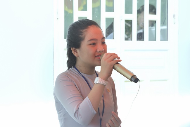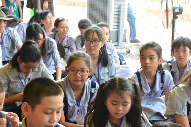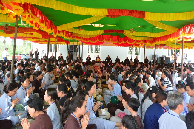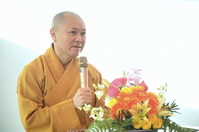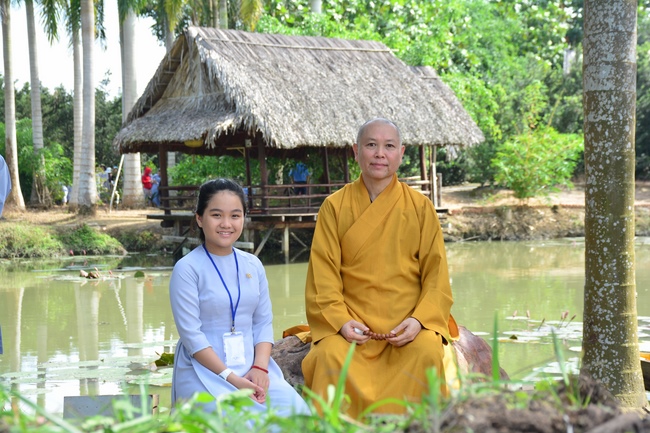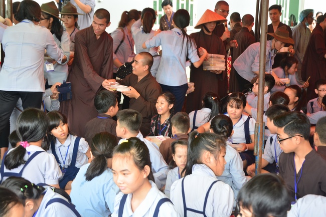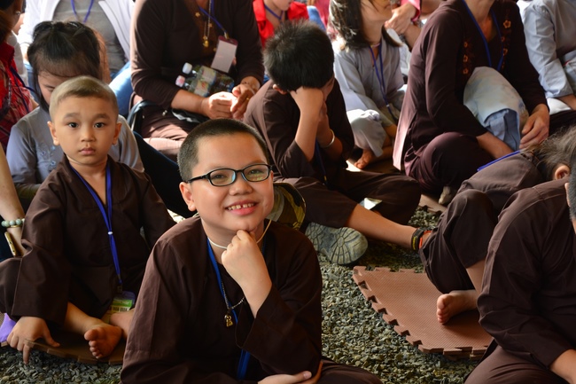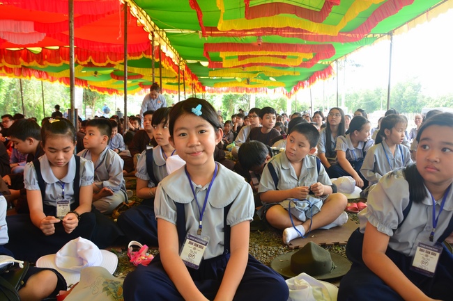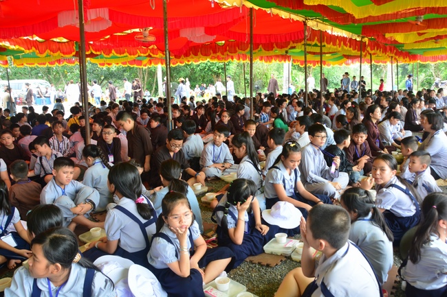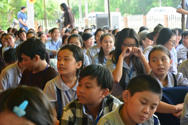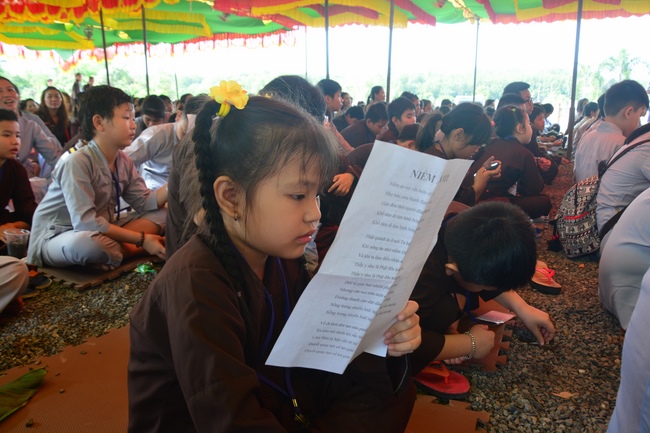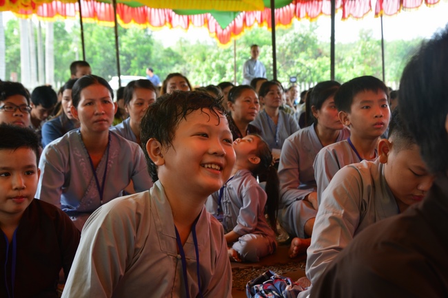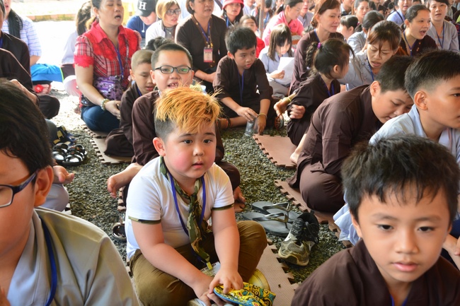 After that, they took a rest and gathered in the front of lecture hall for activities and fun. Next, all of them hold their hands as lotus shape to solemnly welcome Senior Venerable Thich Chan Tinh, Abbot of Hoang Phap Pagoda, who had a speech to them, the owners of the country in the future.