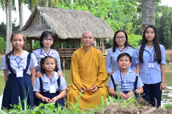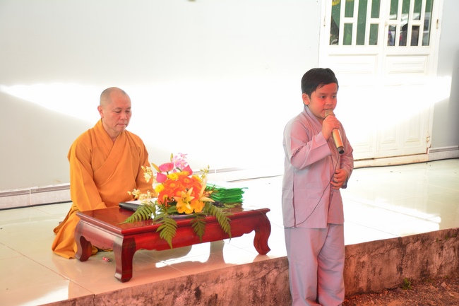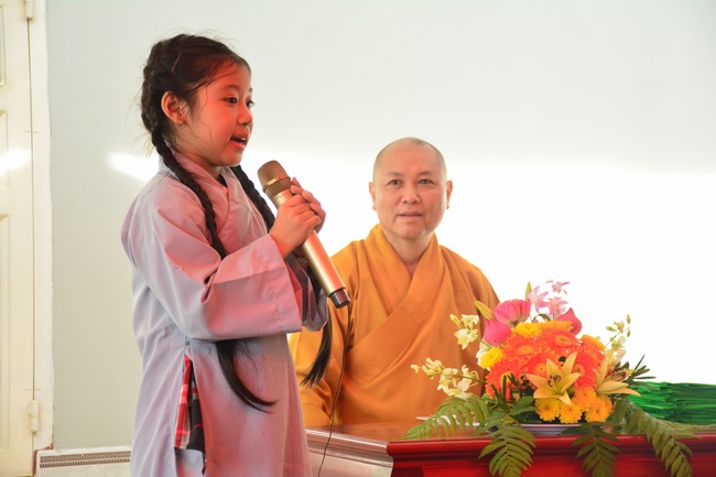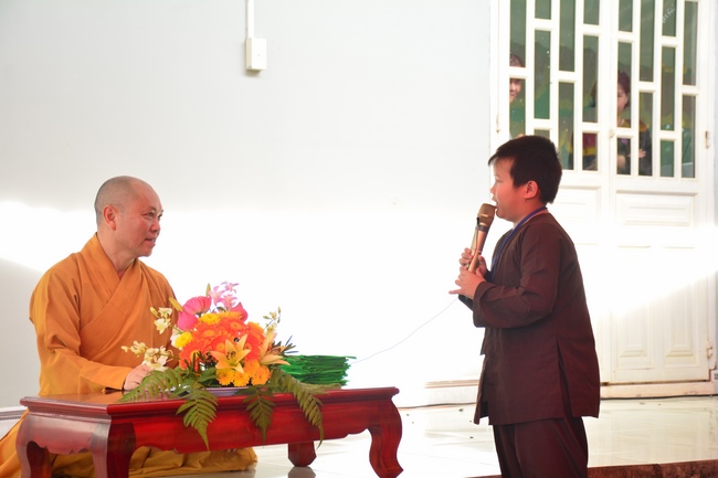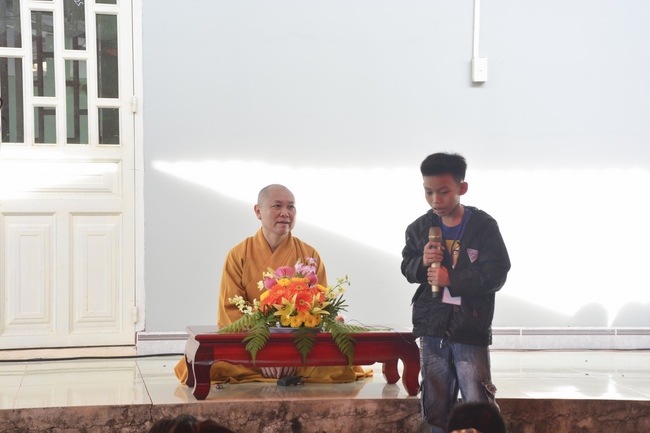 In his speech, he taught them the poem of “The Gratitudeâ€, which is composed by the Senior Venerable expressing the spirit of gratitude and repayment of Buddhists toward four grace gratitudes, taught by the Buddha. By this way, he emphasized that there are many large gratitudes in our life, such as the one of parents’s giving birth, farmers’ sowing and ploughing, workers’s production, teachers’ deeds, particulary to the Sangha who have preached Buddha’s dharma, helping us how to practice cultivation. Since then, he put thoughtful ideas into their mind, so that they could recognized what they have to do to repay those gratitudes. They also had their opinions on each topic, which was raised. Finally, he taught two poems which explained the usefulness of smile and using gentle voice in our life.