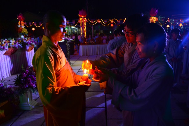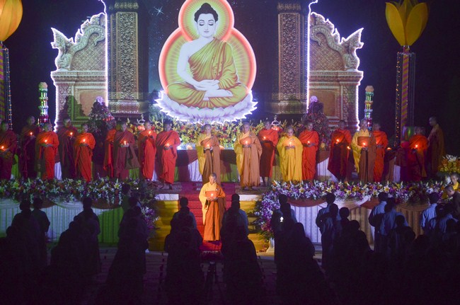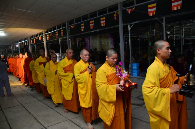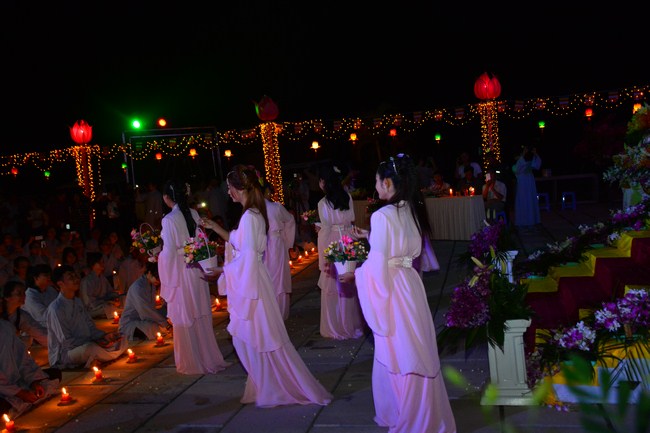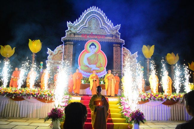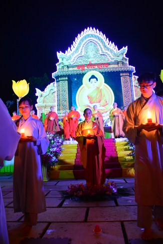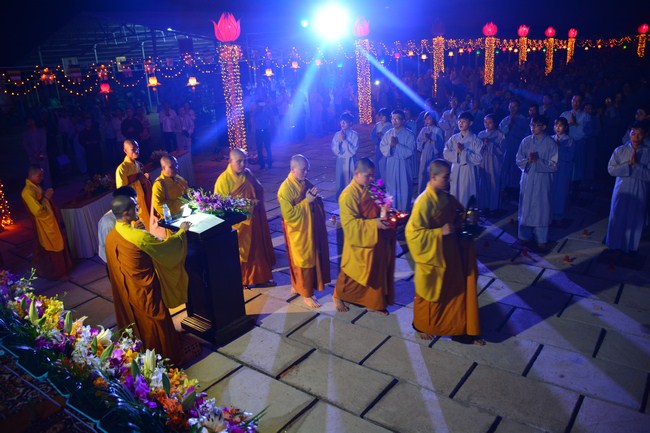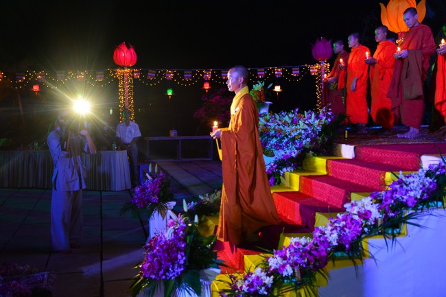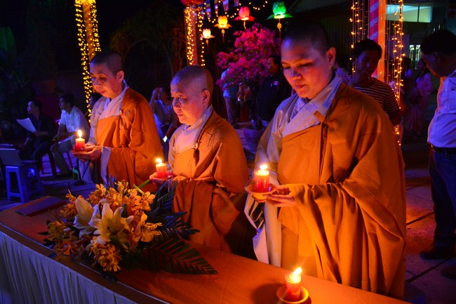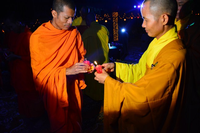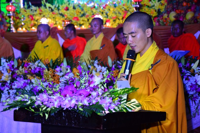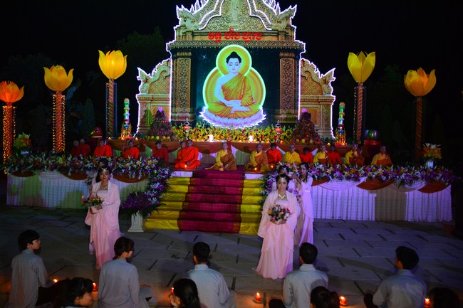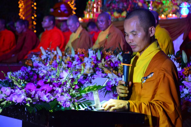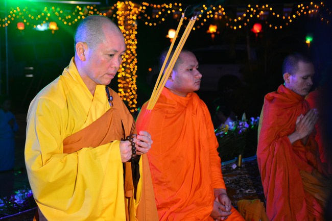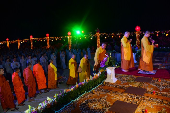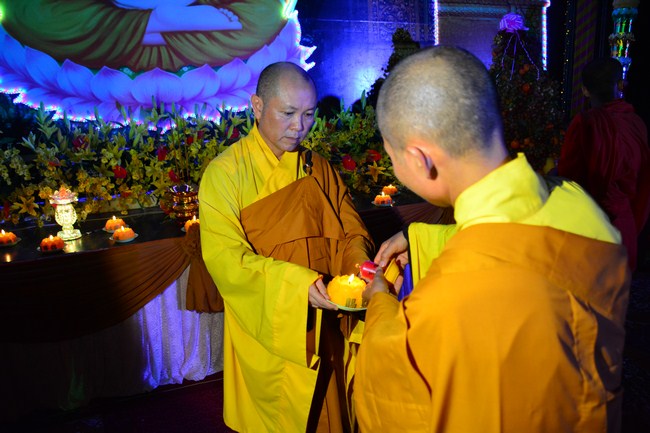 The festival night took place during 3 hours. Opening the ceremony, it was the rites of calling the prayers to seek the sound of bell initiated prayers by Junior Venerable Thich Tam Tuong. Next was the incence rituals of Buddha recitation and proclamation of reason; and then the rites of transmission of the Lamp was the most important part of festival night started by Senior Venerable Thich Chan Tinh. The Senior Venerable had proved and received the light of wisdom from the Buddha platform, then he transmited the light to the Junior Venerable abbot together with the respectable Cambodian monks; This light gradually spread over the whole congregation. All lights were burned which created a sparkling and marvellous atmosphere. This transmission and reception was as the inheritance of the Tathagata's eldest son for the good of Buddhist-truth and living beings so that to enlarge the Dharma, form which the transmission was even more lofty significance to express the spirit of six points of reverent harmony in two schools of Hinayana and Mahayana; Though They are not in the same countries, all are together towards the common goal of enlightenment and propagation.
