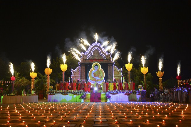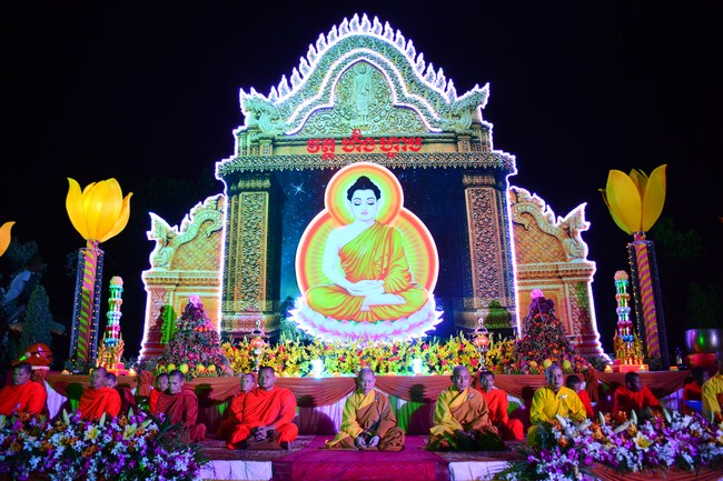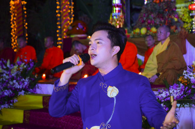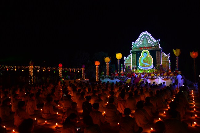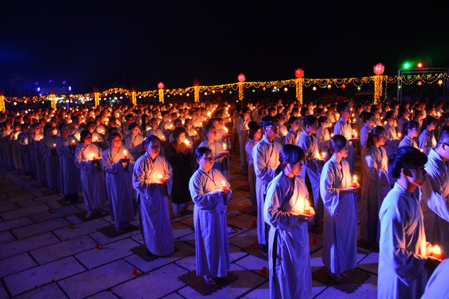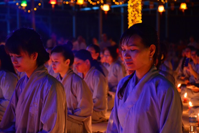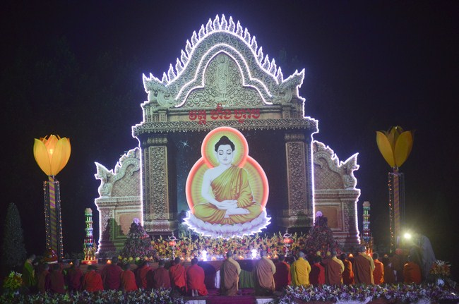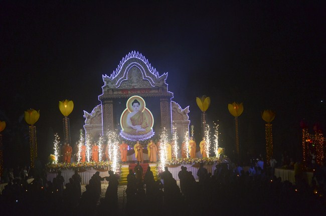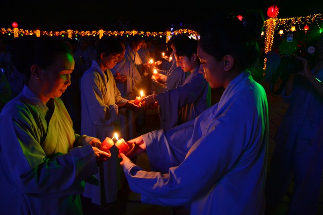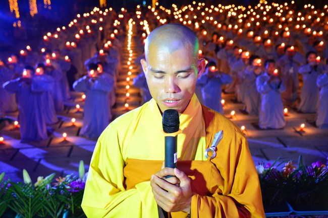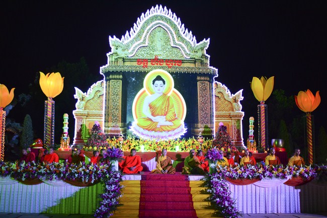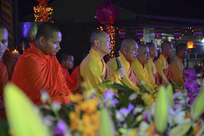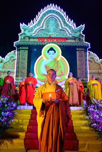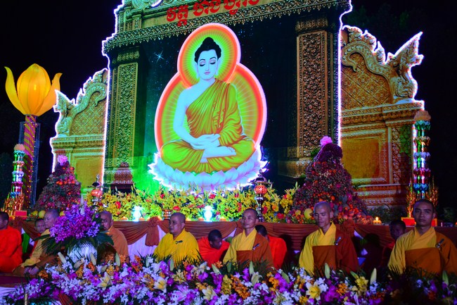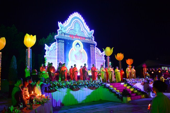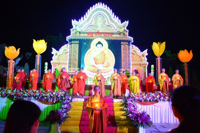 The festival night took place during 3 hours. Opening the ceremony, it was the rites of calling the prayers to seek the sound of bell initiated prayers by Junior Venerable Thich Tam Tuong. Next was the incence rituals of Buddha recitation and proclamation of reason; and then the rites of transmission of the Lamp was the most important part of festival night started by Senior Venerable Thich Chan Tinh. The Senior Venerable had proved and received the light of wisdom from the Buddha platform, then he transmited the light to the Junior Venerable abbot together with the respectable Cambodian monks; This light gradually spread over the whole congregation. All lights were burned which created a sparkling and marvellous atmosphere. This transmission and reception was as the inheritance of the Tathagata's eldest son for the good of Buddhist-truth and living beings so that to enlarge the Dharma, form which the transmission was even more lofty significance to express the spirit of six points of reverent harmony in two schools of Hinayana and Mahayana; Though They are not in the same countries, all are together towards the common goal of enlightenment and propagation.