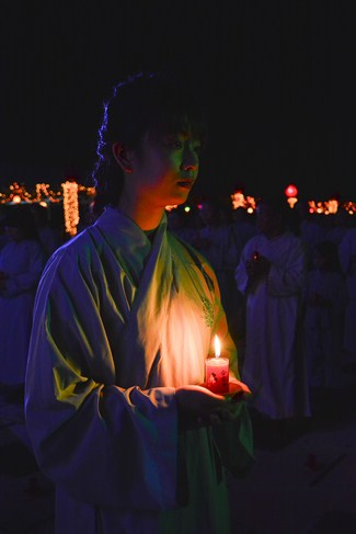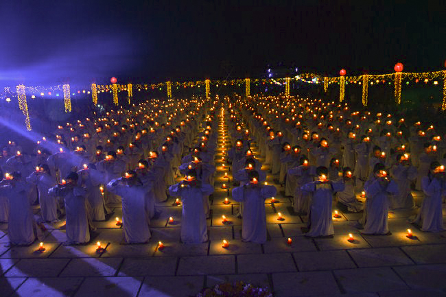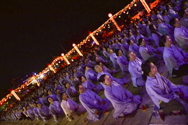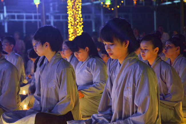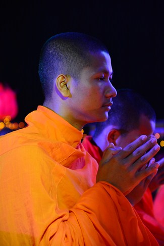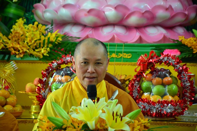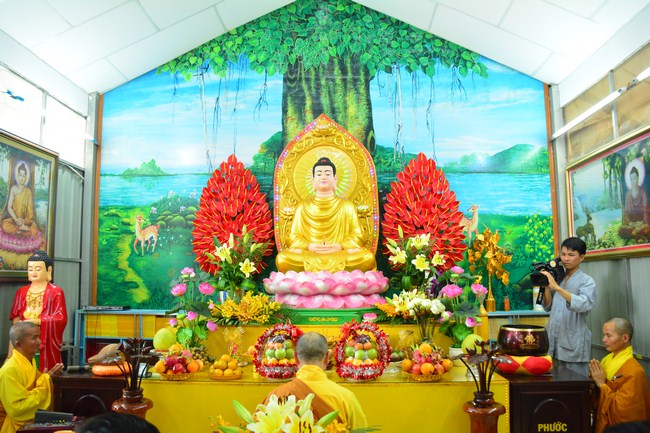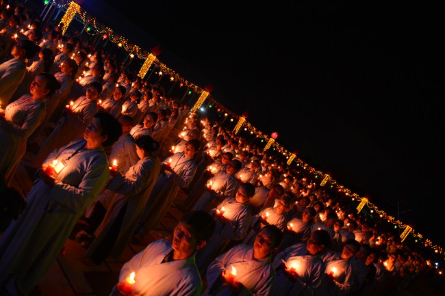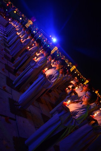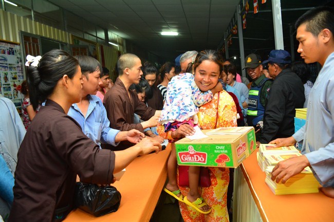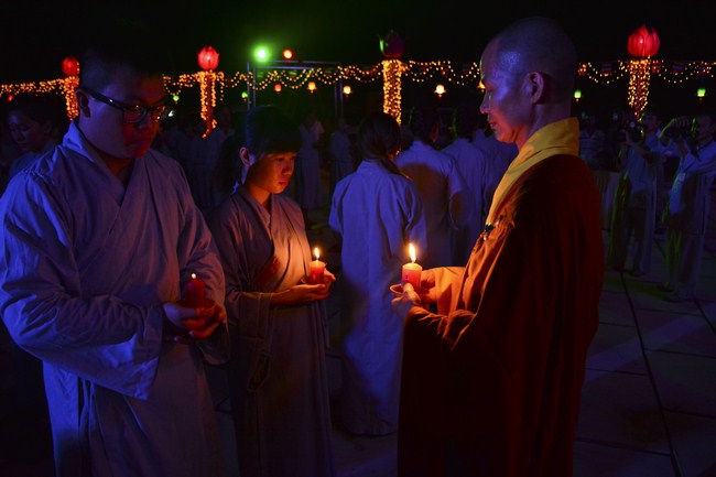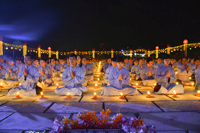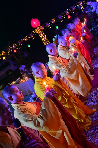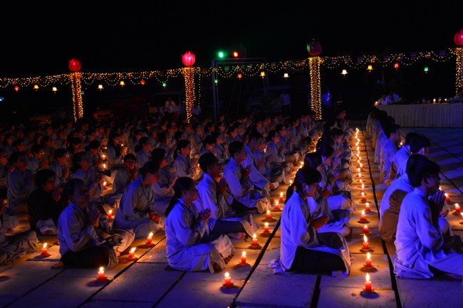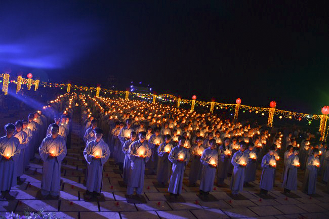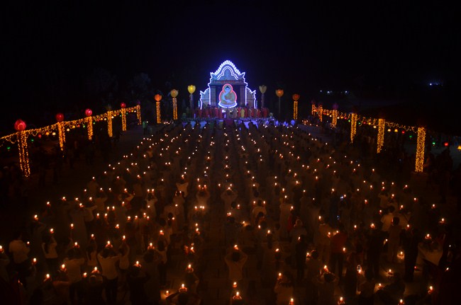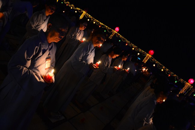 The festival night took place during 3 hours. Opening the ceremony, it was the rites of calling the prayers to seek the sound of bell initiated prayers by Junior Venerable Thich Tam Tuong. Next was the incence rituals of Buddha recitation and proclamation of reason; and then the rites of transmission of the Lamp was the most important part of festival night started by Senior Venerable Thich Chan Tinh. The Senior Venerable had proved and received the light of wisdom from the Buddha platform, then he transmited the light to the Junior Venerable abbot together with the respectable Cambodian monks; This light gradually spread over the whole congregation. All lights were burned which created a sparkling and marvellous atmosphere. This transmission and reception was as the inheritance of the Tathagata's eldest son for the good of Buddhist-truth and living beings so that to enlarge the Dharma, form which the transmission was even more lofty significance to express the spirit of six points of reverent harmony in two schools of Hinayana and Mahayana; Though They are not in the same countries, all are together towards the common goal of enlightenment and propagation.