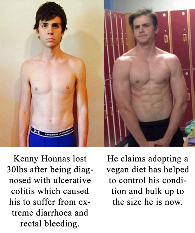Teenager suffering crippling bowel condition claims giving up meat helped him bulk up and play college football. Kenny Honnas, now 20, was rushed to hospital with rectal bleeding. Needed four blood transfusions and lost 2st due to ulcerative colitis. Keen sportsman thought his dreams of college football were over
