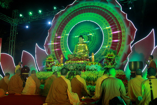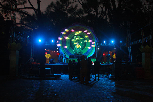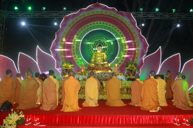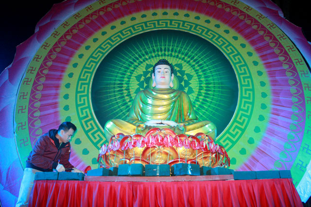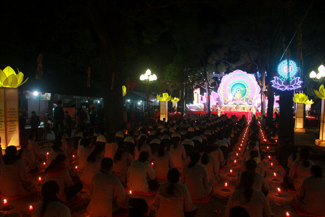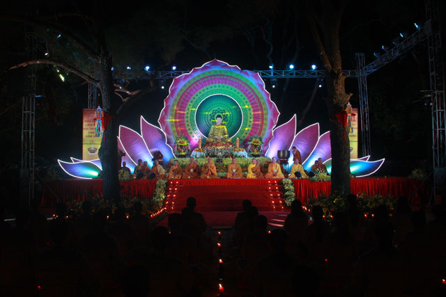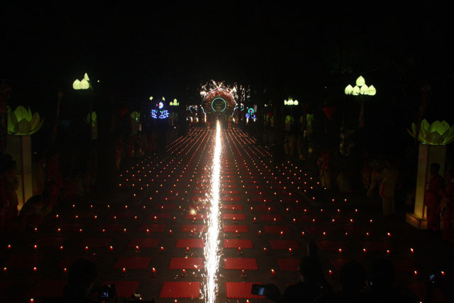 At 18:30, the program started with the Buddha statue placing ceremony. The program continued with the welcoming the delegation of clergy guests of honor onto the stage to witness and hold the Lotus Candle-Light Ceremony.