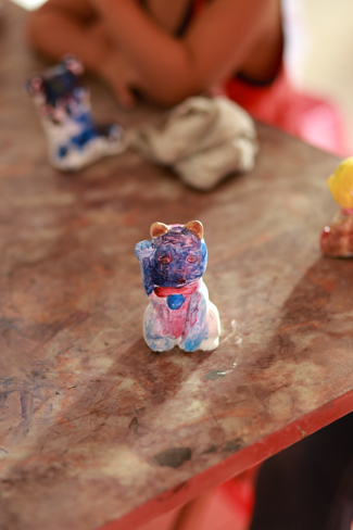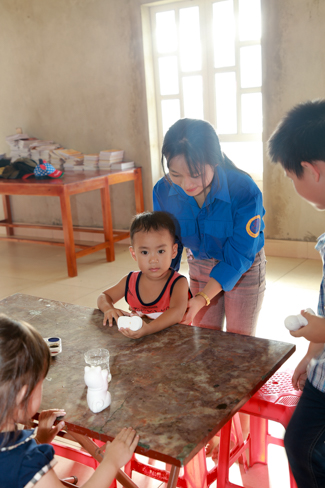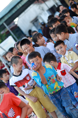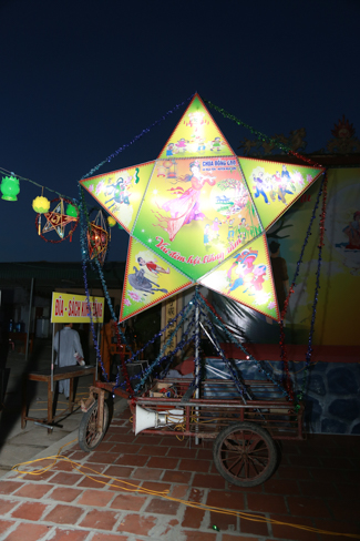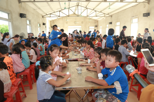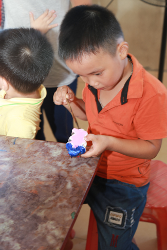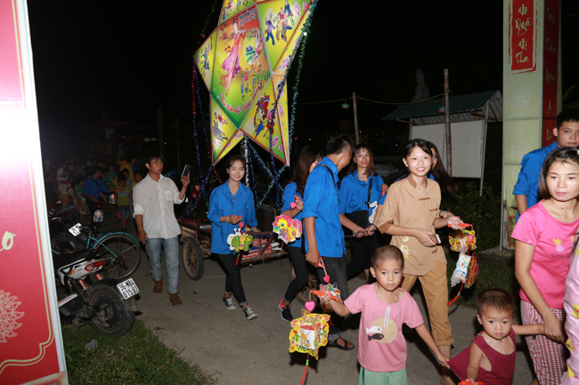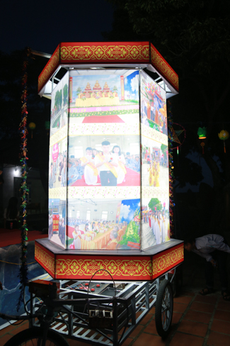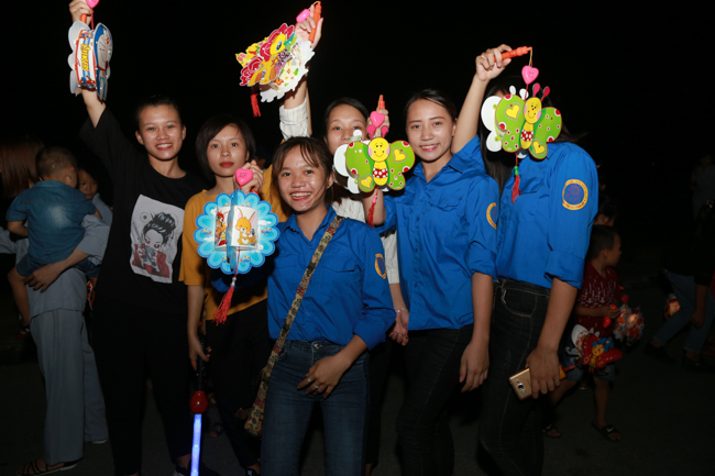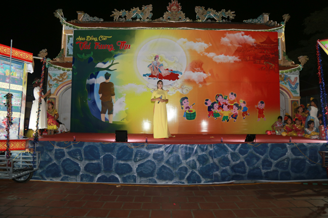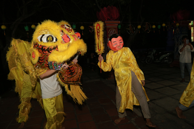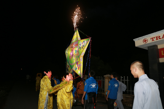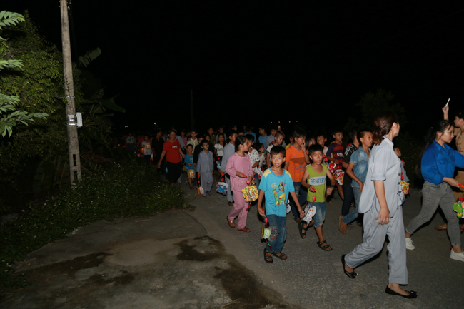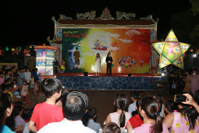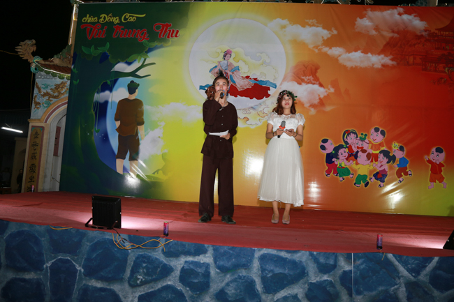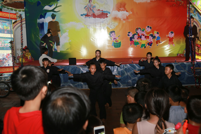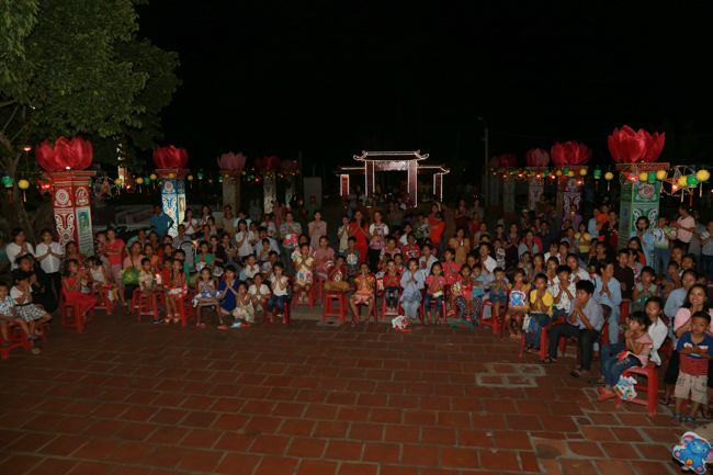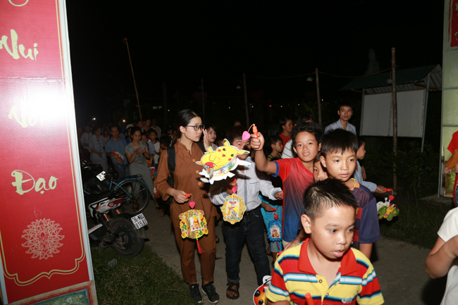 Finishing the dinner, each child was offered a lantern and went around the village with 2 persons dressed up as Moon Man and Moon Lady. They were supposed to celebrate the Mid-Autumn Festival with traditional 5-pointed star shaped lanterns. Following were the show of music performance and Vietnamese traditional martial art performance done by some chosen children. Coming to the last part, people gathered in the hall and enjoyed moon cake.
