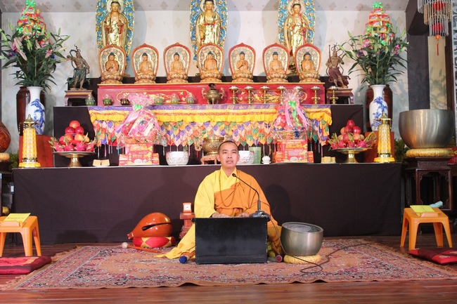 Being joyful due to welcoming of the monks and Buddhists in Hoa Phuc Pagoda, the great Senior Venerable graciously had a dharma talk from Nun Thich Nu Tam Tri’s translation.