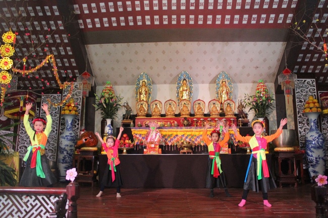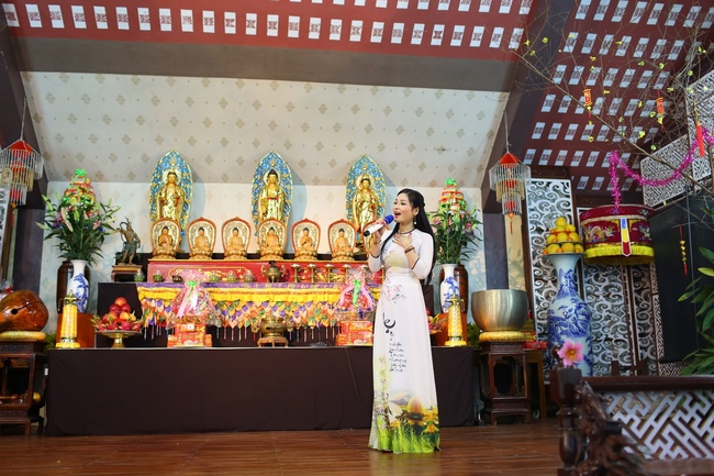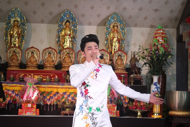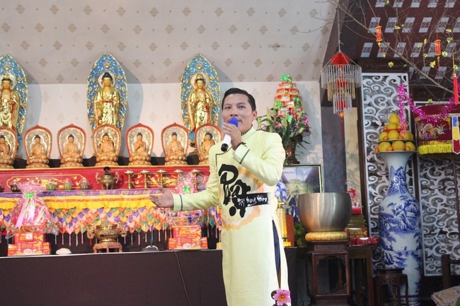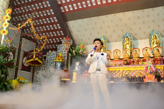 In order to express gratitude to the warm behaviors of the great Sen. Ven. Yoshimizu Daichi and Nun Thich Nu Tam Tri towards Ven. Thich Tam Hoa in Buddha’s affairs in Japan as well as their concern, help and cultivating conditions for Buddhists in Hoa Phuc pagoda, the Buddhist music program with the participation of Buddhist singers such as: Chanh Hoang Phap, Hoang Ai My, Bolero handsome boy Nguyen Ngoc Son, Pham Huu, Bich Ngoc, Hong Ngoc, child singer Chu Ngoc Tuan- the Voice Kids 2016 and the child actors and actresses from Tuoi Than Tien dance center took place respectfully to honour them.