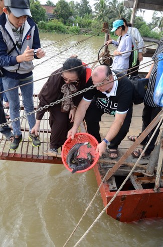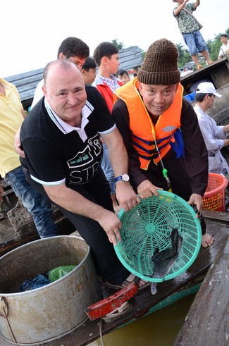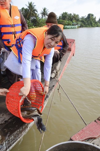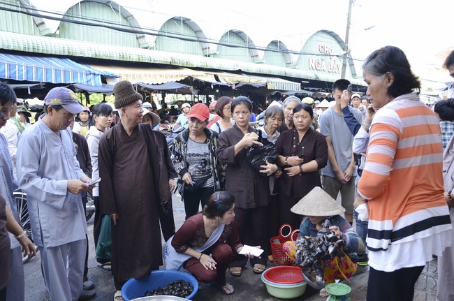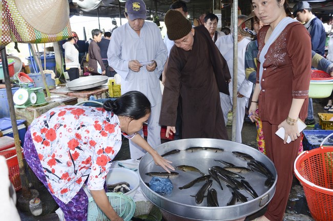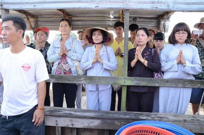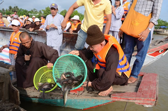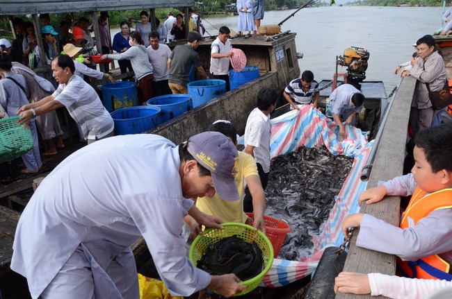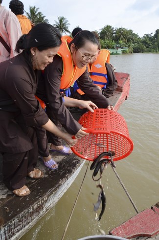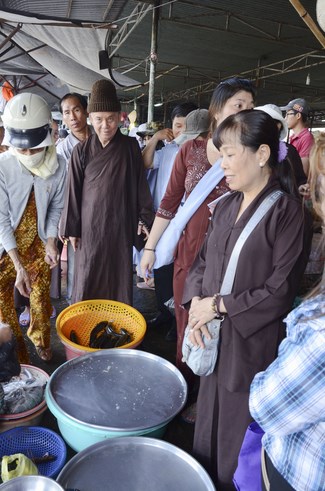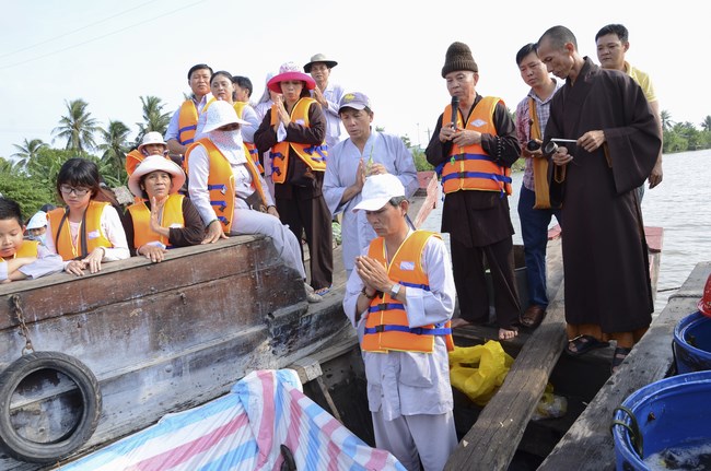 On July 28th, 2015 (June 13th, Goat year), the Jun.Ven took the group to Vinh Hiep temple in Nga Bay town, Hau Giang Province, associating with the abbot and Buddhists to buy more than 3 tons of fishes for releast. Then, the group had an word offering and donating money to cover Vinh Hiep pagoda roof.