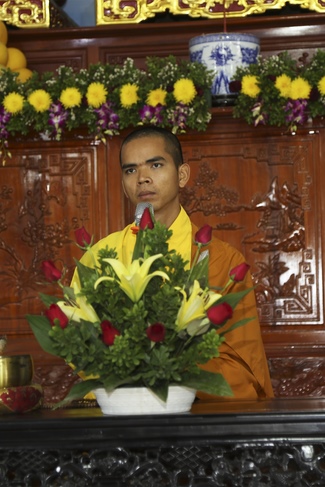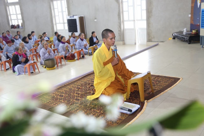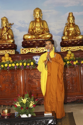 At 09:00 a.m., after that series of bell and Prajnarings and drums, recitation of the Buddha’s naming, and Buddhists’ believing mind invited Junior Ven. Thich Tam Trong came to the main hall and Junior Ven. Thich Tam Hung sent greetings and encouragement to Buddhists. Then, he talked about the theme “The fourfold stage of mindfulnessâ€. The fourfold stage of mindfulness including: