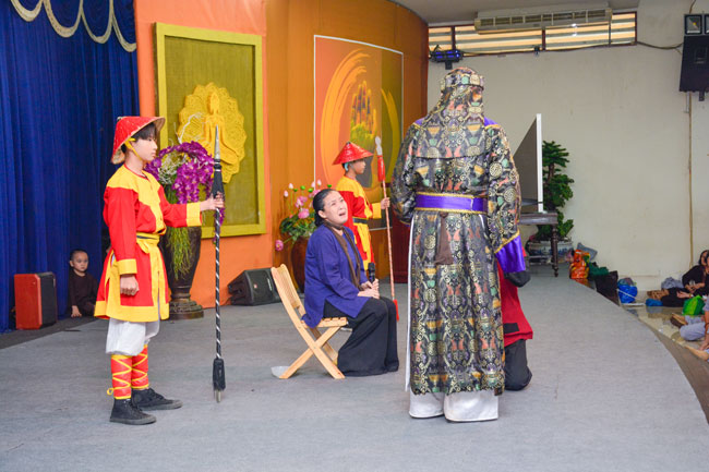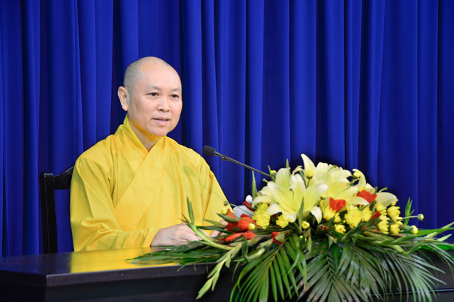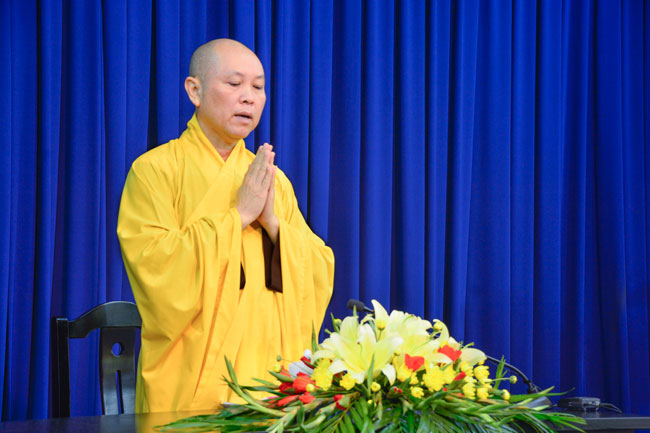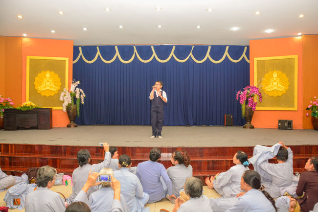 After taking breakfast, people gathered at the lecture\r\nhalls to listen a Dharma Talk shared by Sen. Ven.\r\nThich Chan Tinh, the abbot of Hoang Phap pagoda and\r\nthe chief of the organization. Over one hour, he talked about\r\nthe life of Tran Nhan Tong king Buddha on the occasion\r\nof 707 years from his death’s commemoration.