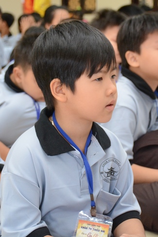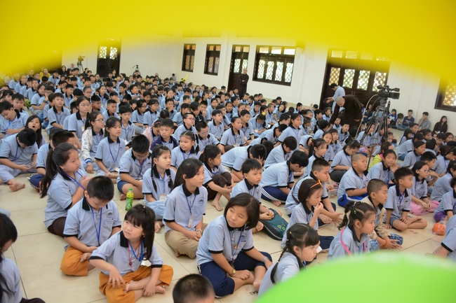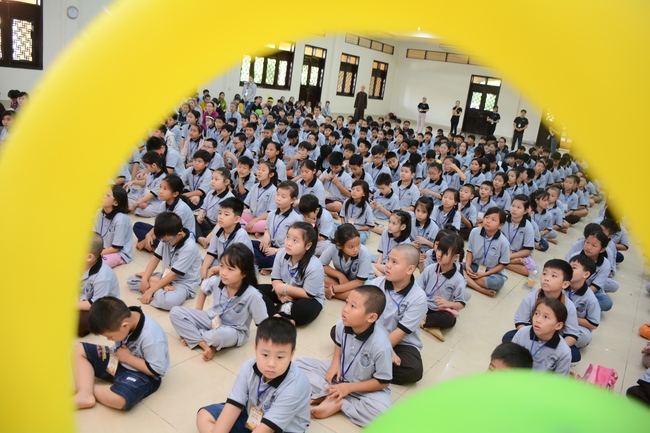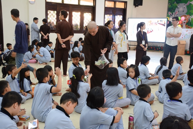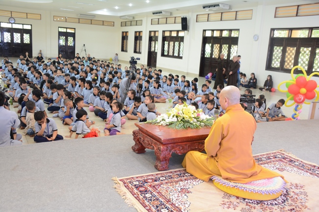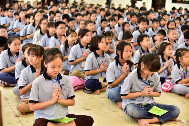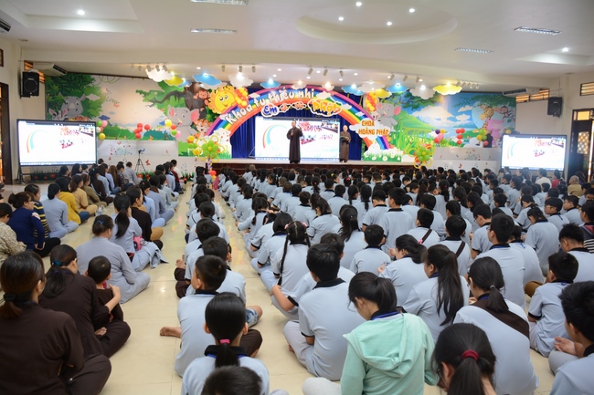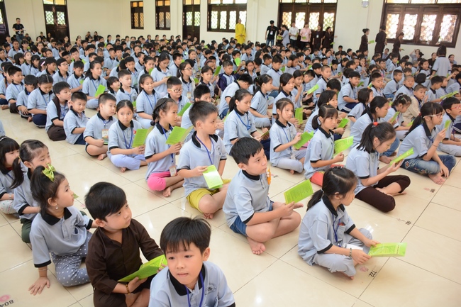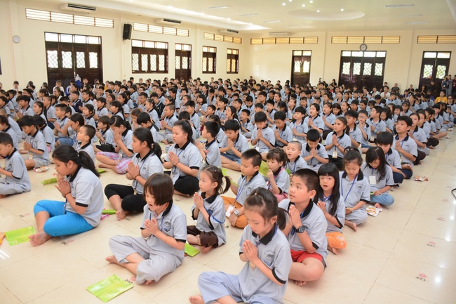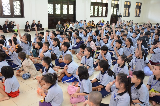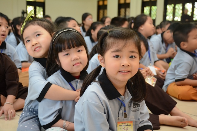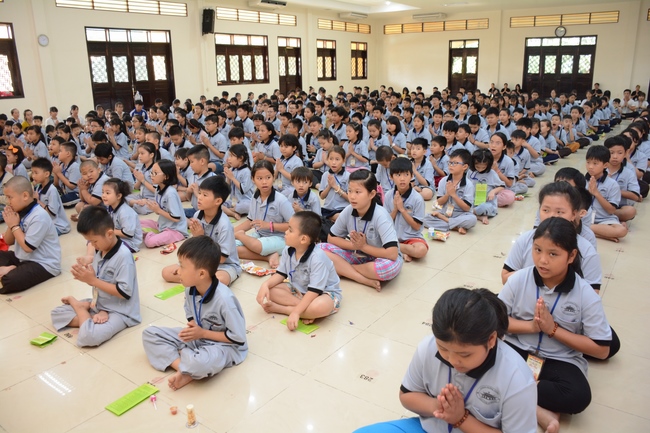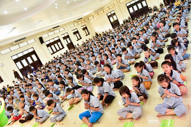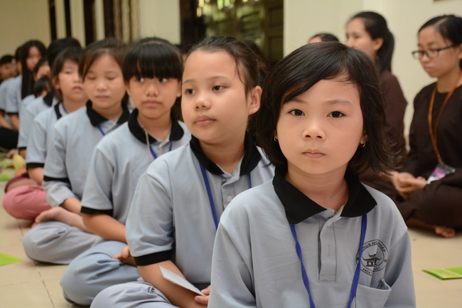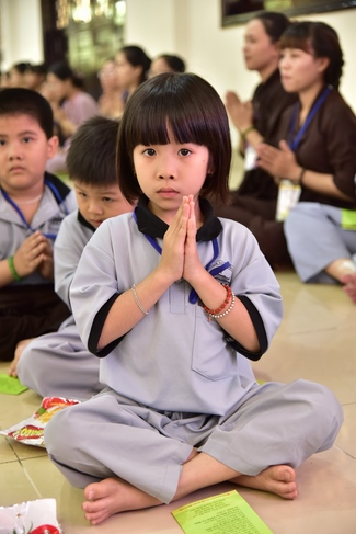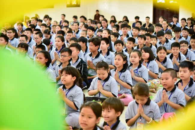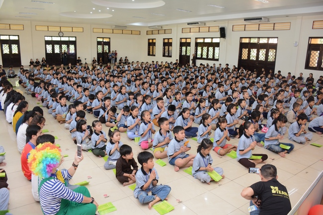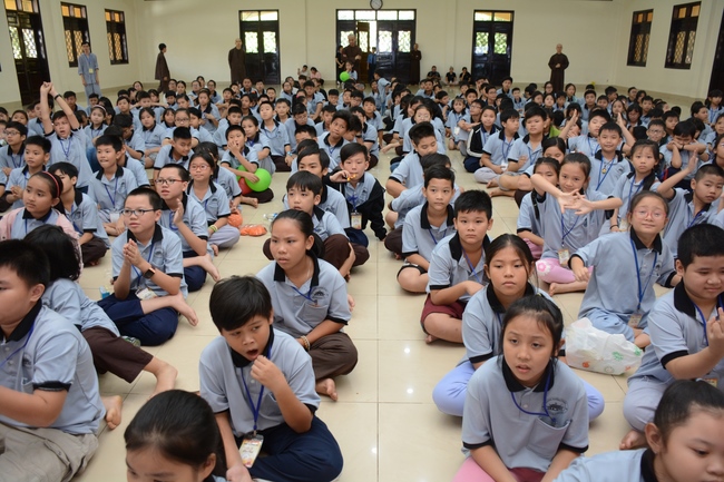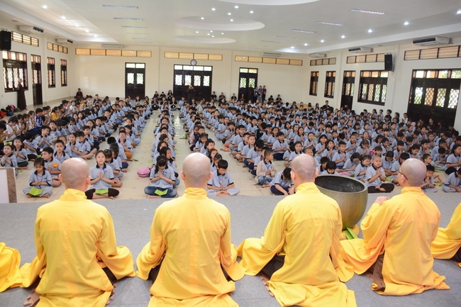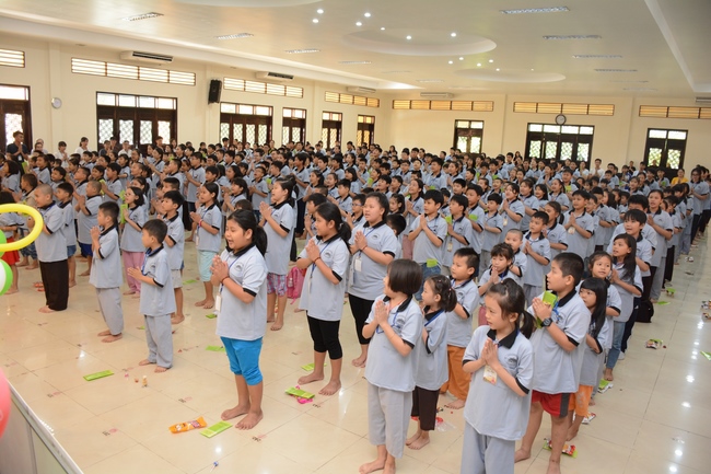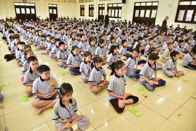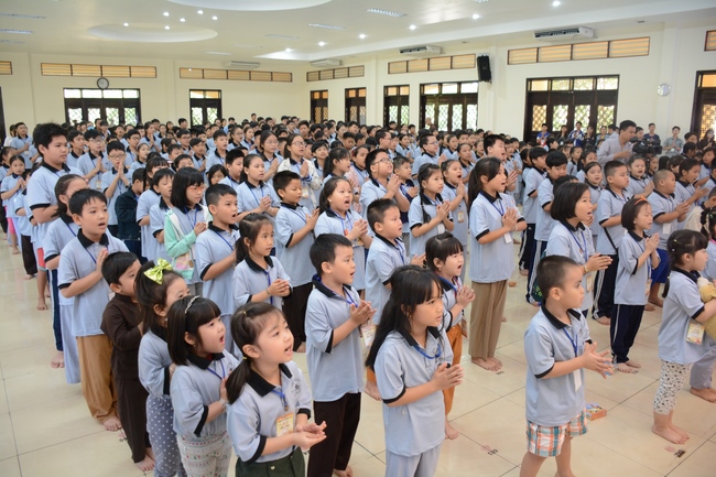 After registration in the morning, children gather at the main hall for orientation session and listening to Dharma talk from Senior Venerable Thich Chan Tinh, head of organizing department. He explains the meaning of the retreat name: “Come to Buddhaâ€, reminds everyone to purify body, speech, and mind. In terms of body, we should shy away from evils, and do good deeds. For pure speech, we should not ignore the advice or instructions from parents/teachers, lie or say rude words, ... but listen, follow the teachings from parents, grandparents and teachers, say good/gentle words instead. To have pure mind, we should avoid bad, greedy or hateful thoughts, ... When practicing Buddha's teachings into daily life, kids will become good children, good pupils and engaged citizen building better society, as a thankful response to the cares and commitment of everyone.
