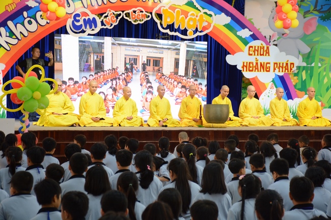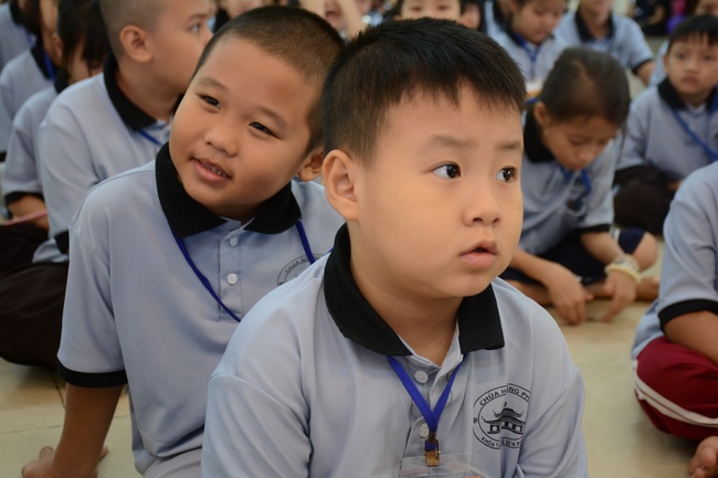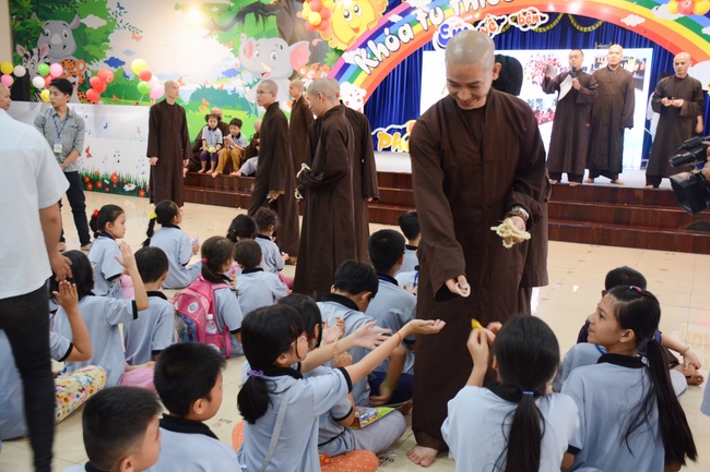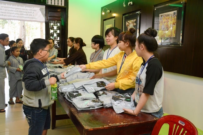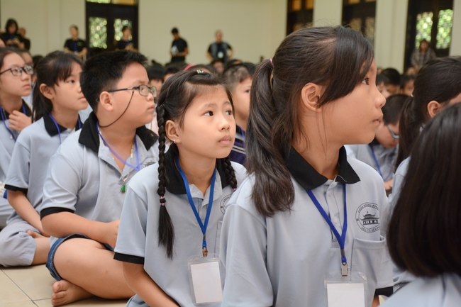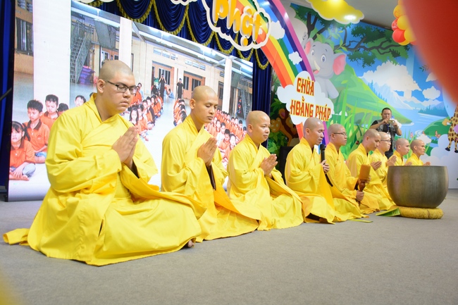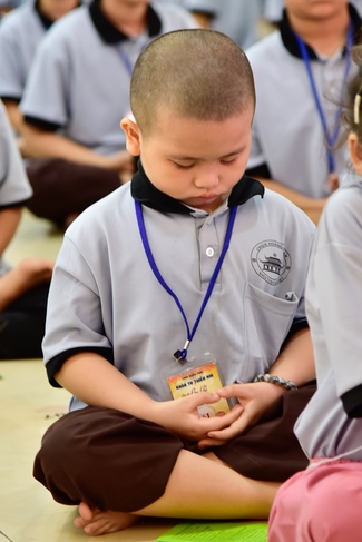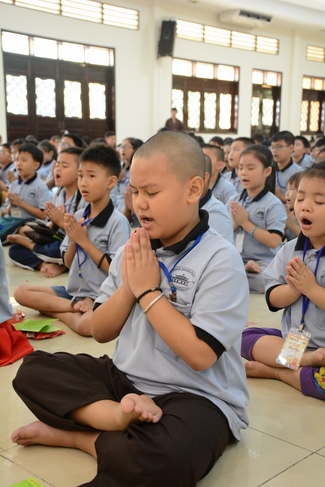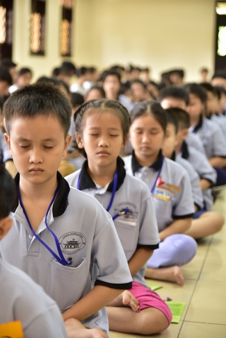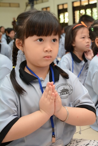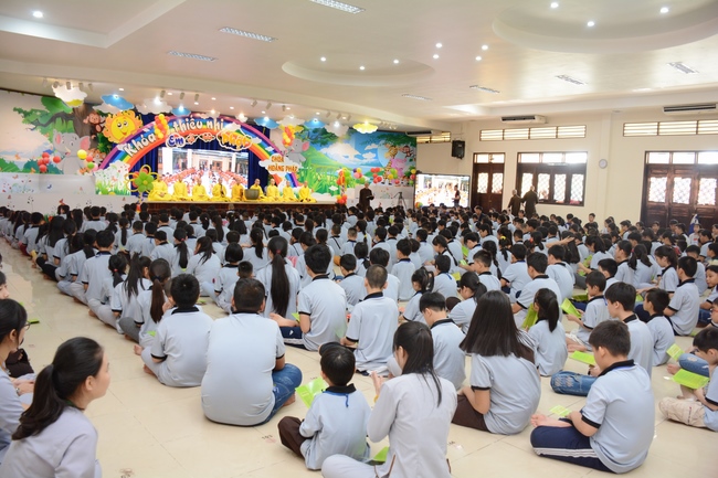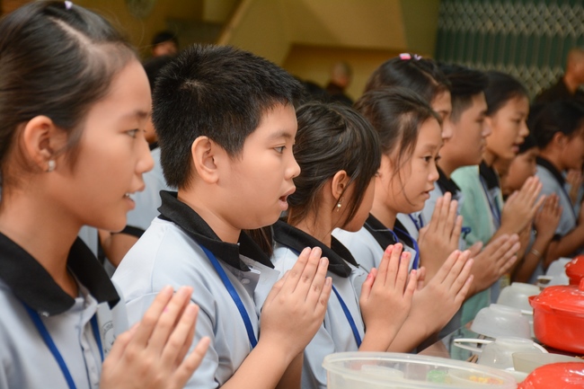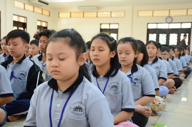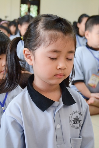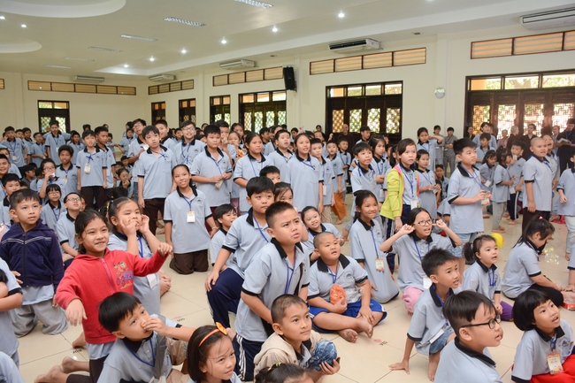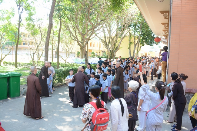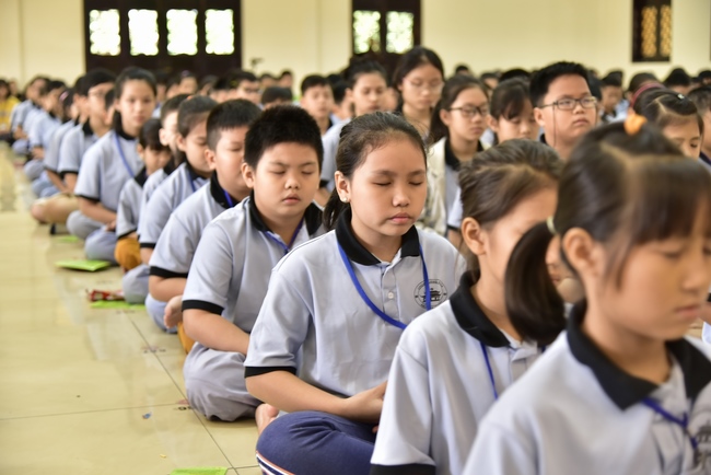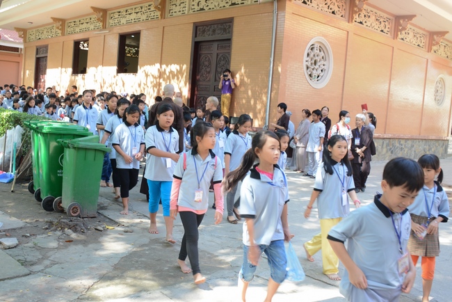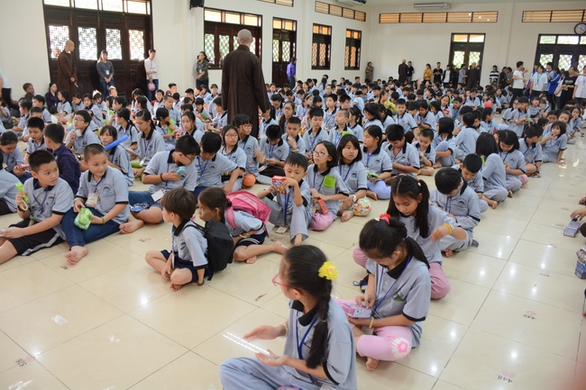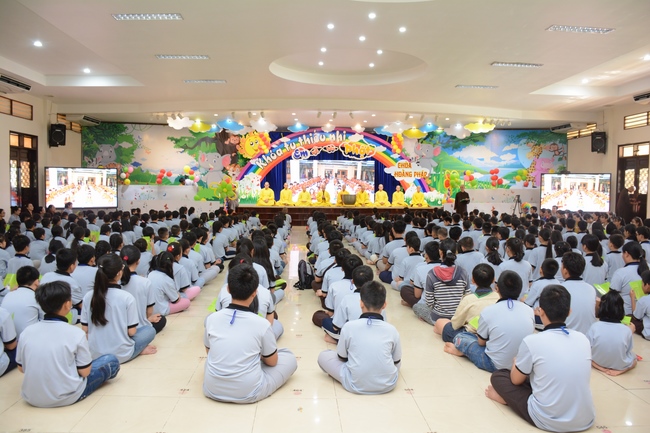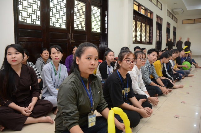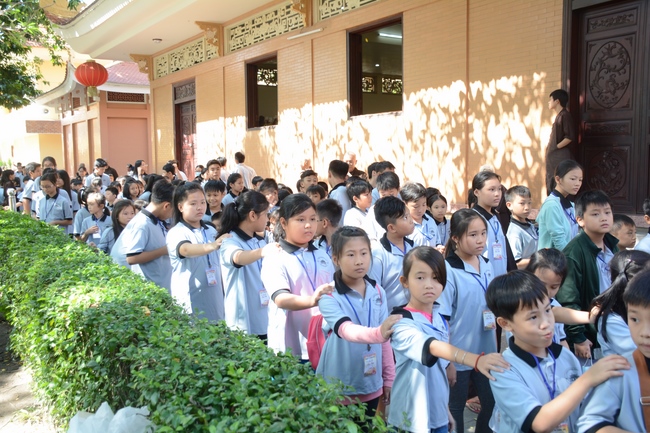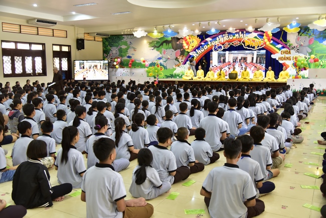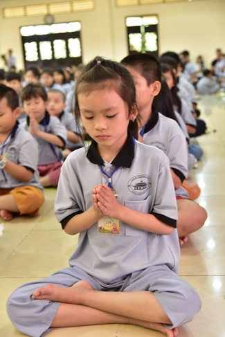 After registration in the morning, children gather at the main hall for orientation session and listening to Dharma talk from Senior Venerable Thich Chan Tinh, head of organizing department. He explains the meaning of the retreat name: “Come to Buddhaâ€, reminds everyone to purify body, speech, and mind. In terms of body, we should shy away from evils, and do good deeds. For pure speech, we should not ignore the advice or instructions from parents/teachers, lie or say rude words, ... but listen, follow the teachings from parents, grandparents and teachers, say good/gentle words instead. To have pure mind, we should avoid bad, greedy or hateful thoughts, ... When practicing Buddha's teachings into daily life, kids will become good children, good pupils and engaged citizen building better society, as a thankful response to the cares and commitment of everyone.