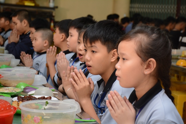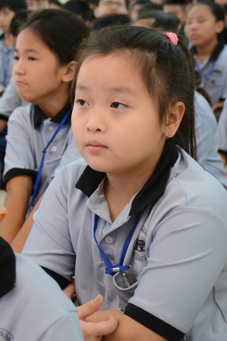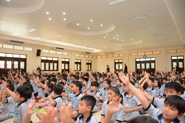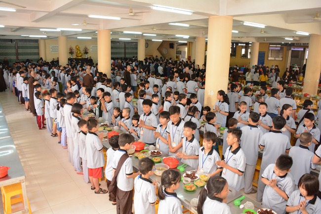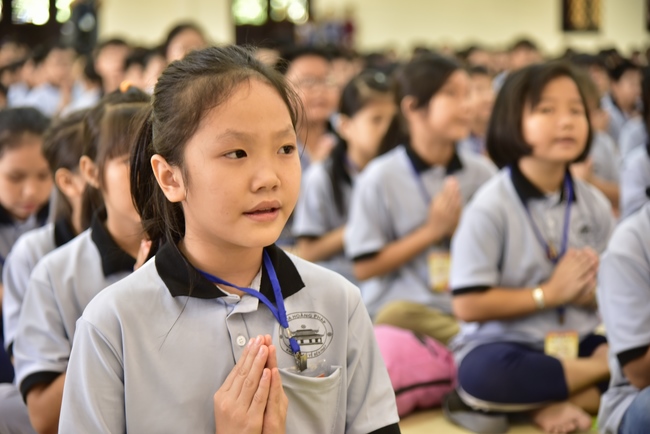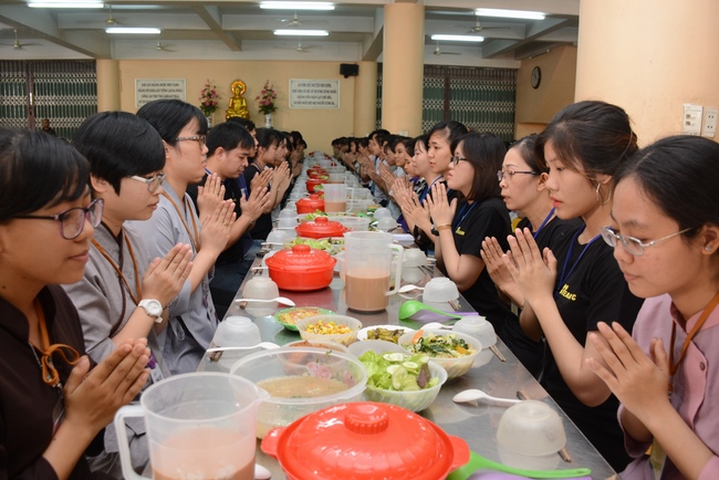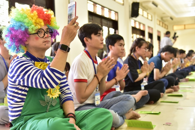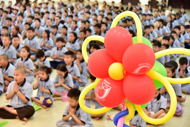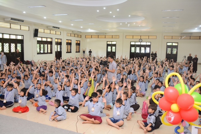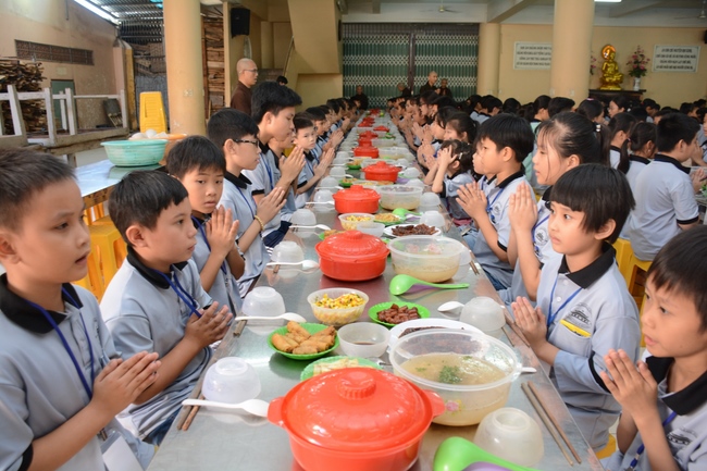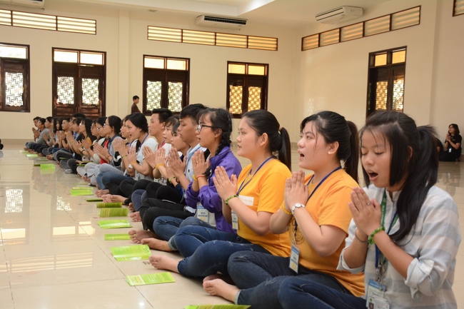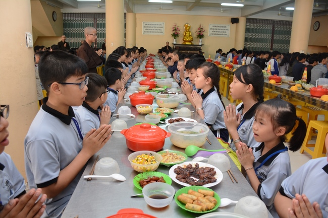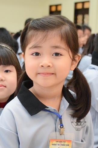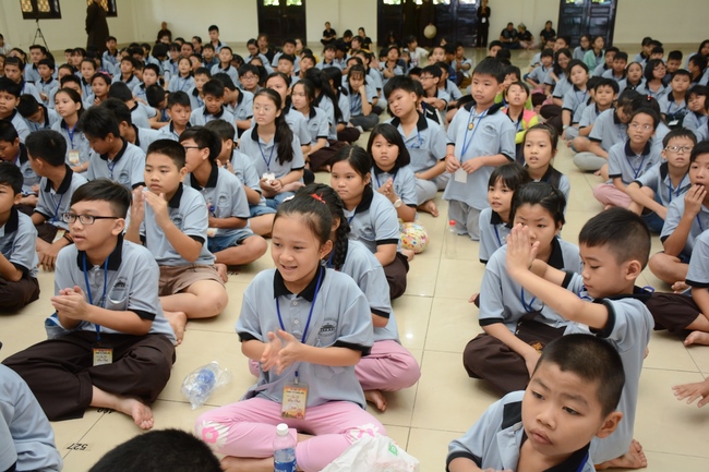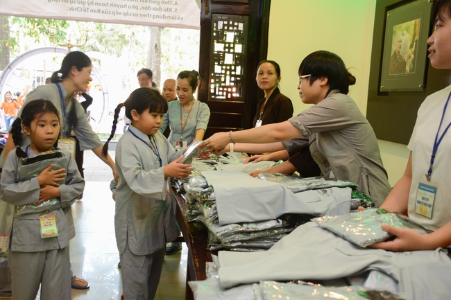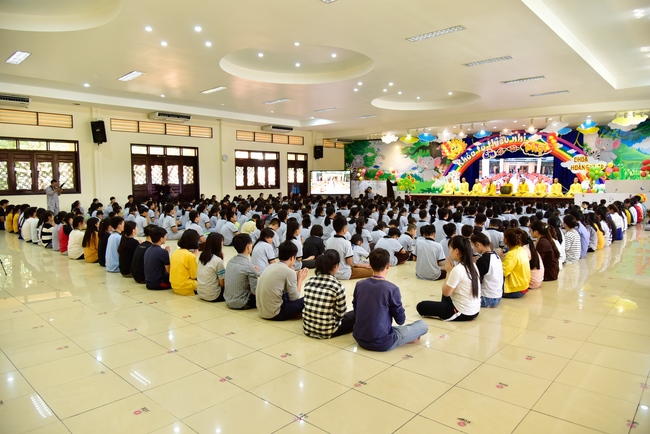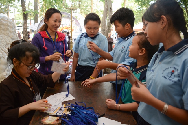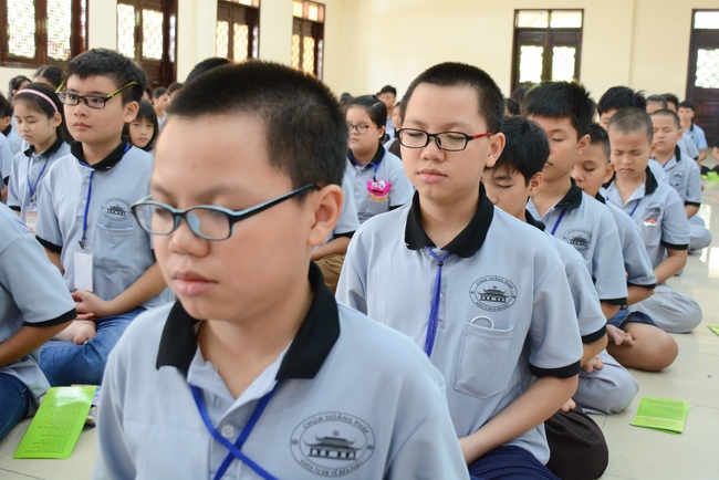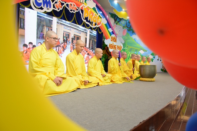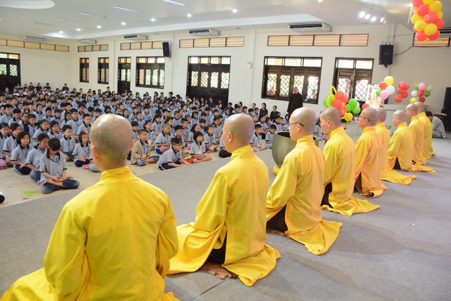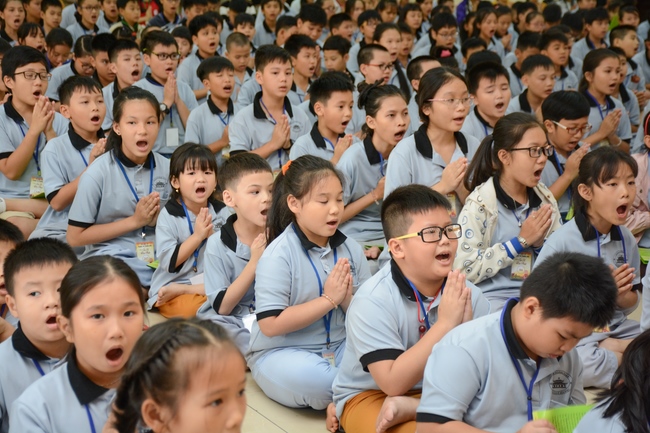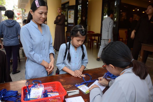 After registration in the morning, children gather at the main hall for orientation session and listening to Dharma talk from Senior Venerable Thich Chan Tinh, head of organizing department. He explains the meaning of the retreat name: “Come to Buddhaâ€, reminds everyone to purify body, speech, and mind. In terms of body, we should shy away from evils, and do good deeds. For pure speech, we should not ignore the advice or instructions from parents/teachers, lie or say rude words, ... but listen, follow the teachings from parents, grandparents and teachers, say good/gentle words instead. To have pure mind, we should avoid bad, greedy or hateful thoughts, ... When practicing Buddha's teachings into daily life, kids will become good children, good pupils and engaged citizen building better society, as a thankful response to the cares and commitment of everyone.