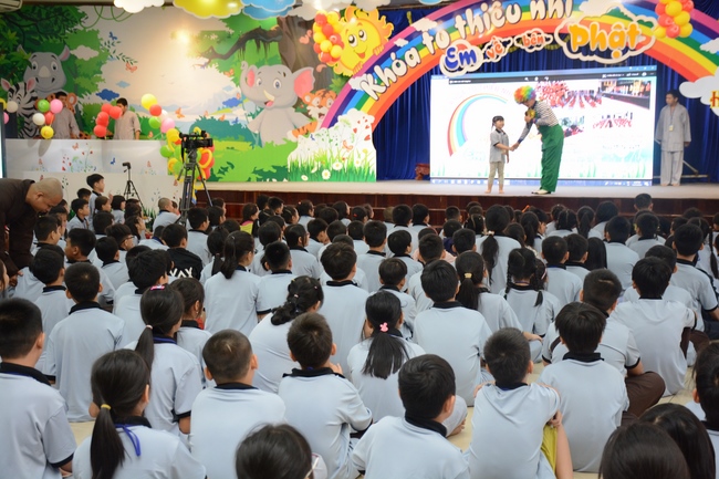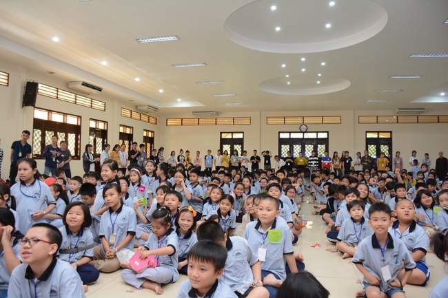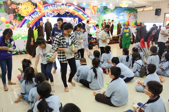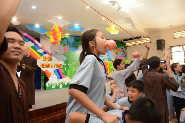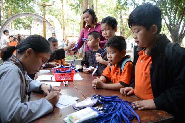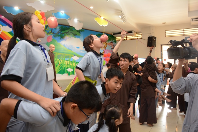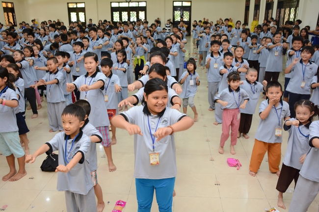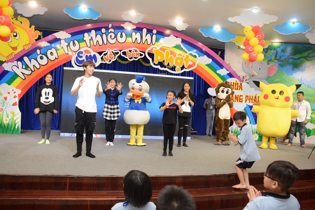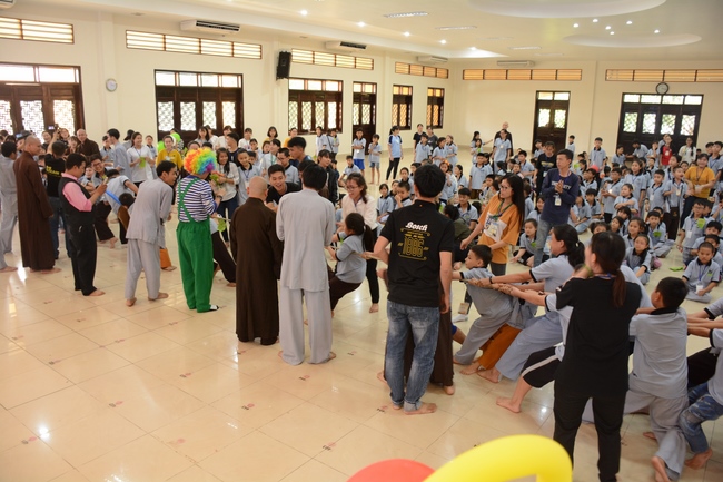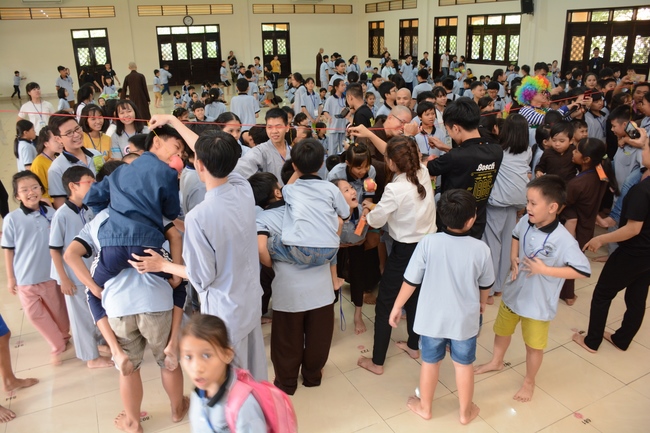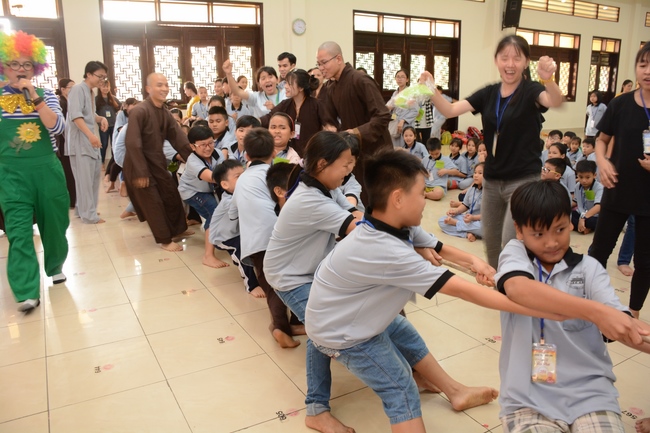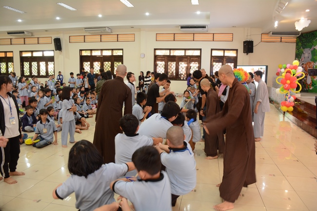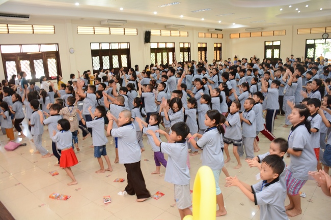 The program is held once a month on Sunday for children from 6 to 12 years old. This time, there are totally more than 300 young participants joining the retreat. It is the chance for them going to pagoda to study, access with the Dharma, and learn from monks. Besides studying Buddhism Dharma and etiquette, children have got many funny activities as team building, games, singing, story-telling. This is such a joyful, helpful and friendly playground for children to grow.