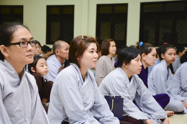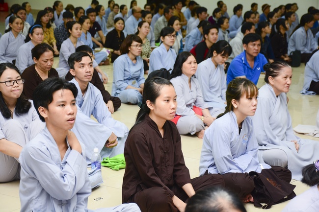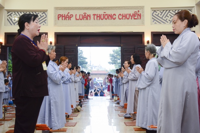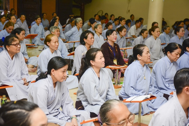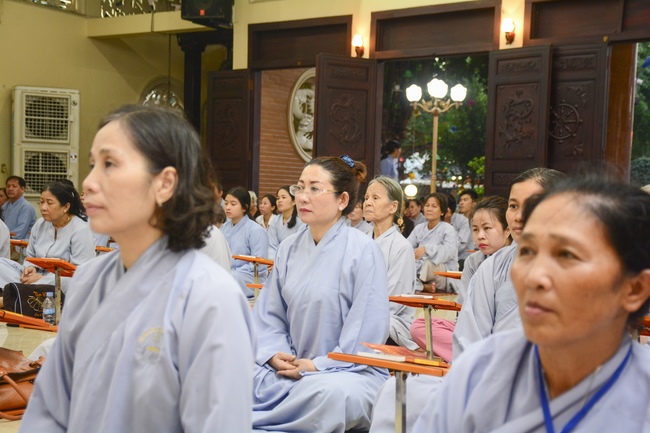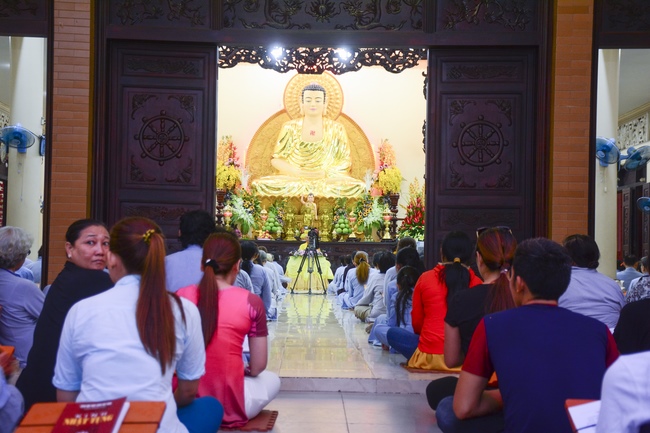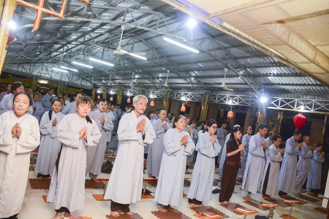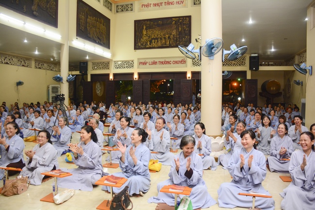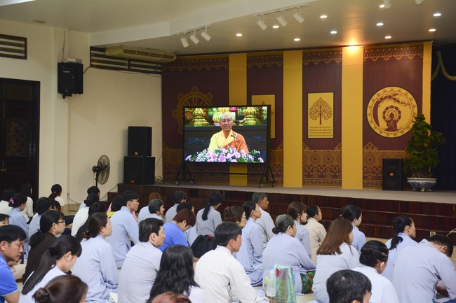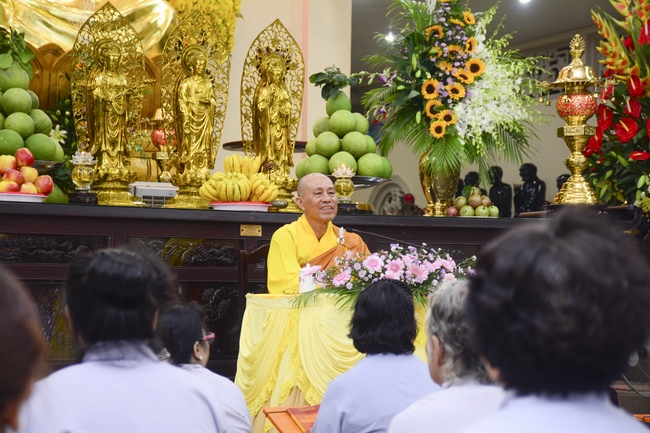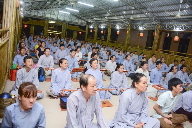 After reciting Buddha’s name for his witness and blessing, the mass listened to the Dharma talk from Reverend Thich Tam Dien, monk of Hoang Phap pagoda, with the topic: "Practicing, is it difficult or easy?"