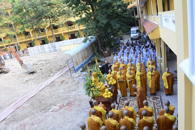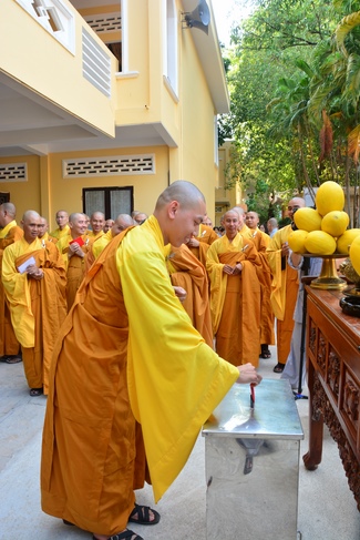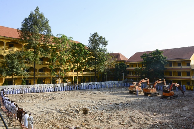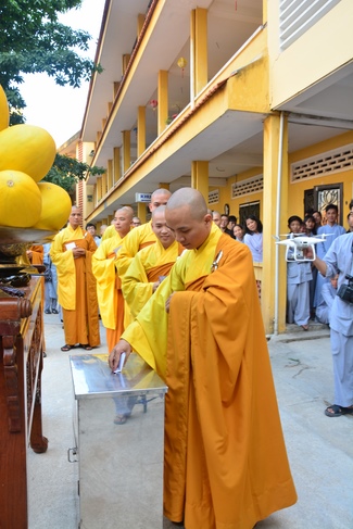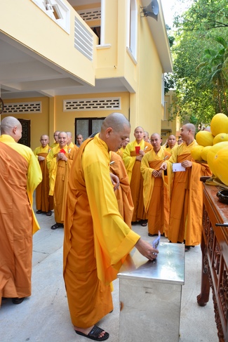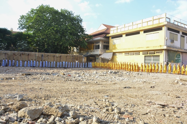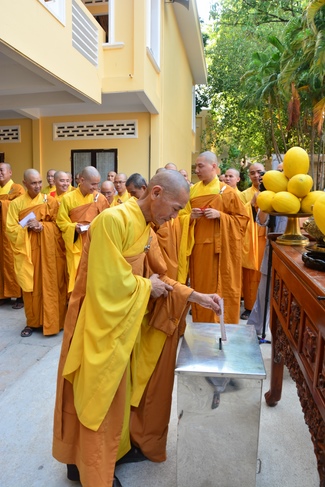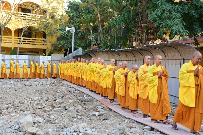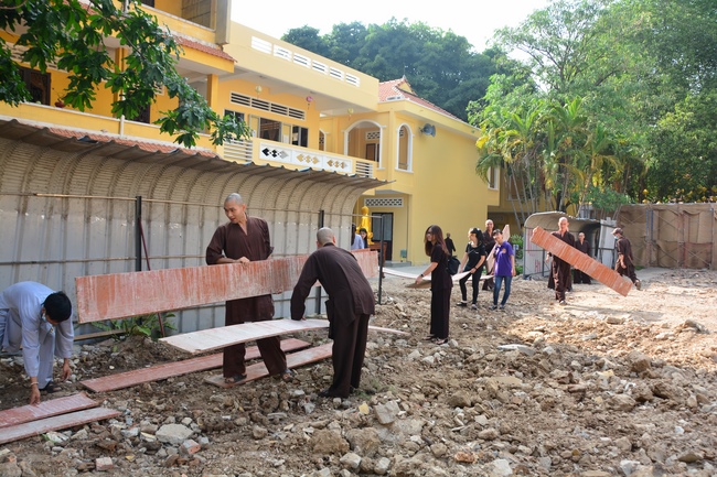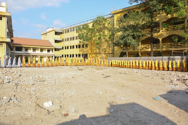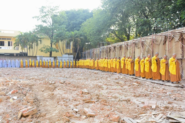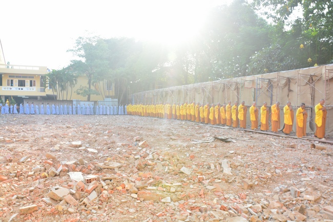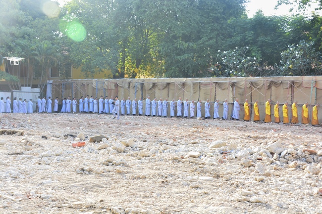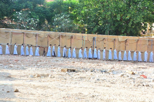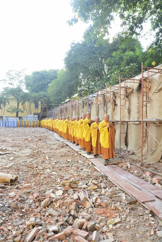 After offering incense to pay homage to Buddha and chanting rite, the sangha and Buddhists recite Buddha’s name while walking around the construction field. After that, The Venerable Abbot opens the donation for the building construction with his offering, then follow the monks and Buddhists. All have the same wish for the best fulfillment of the project.