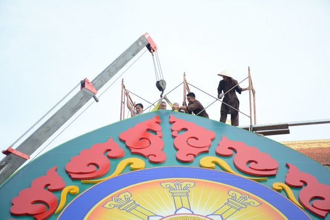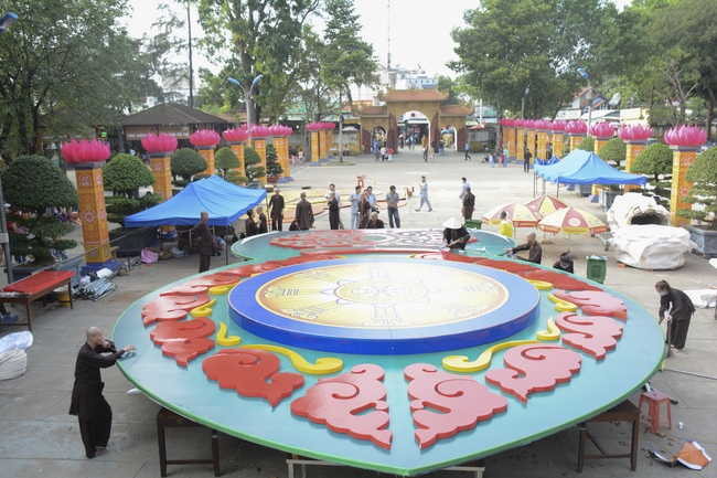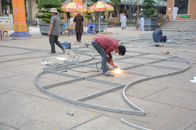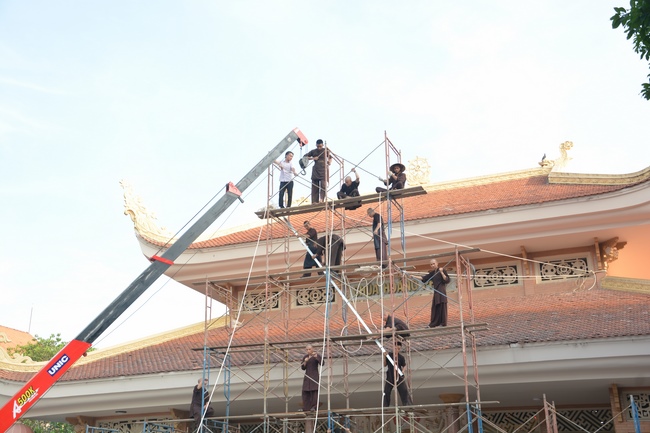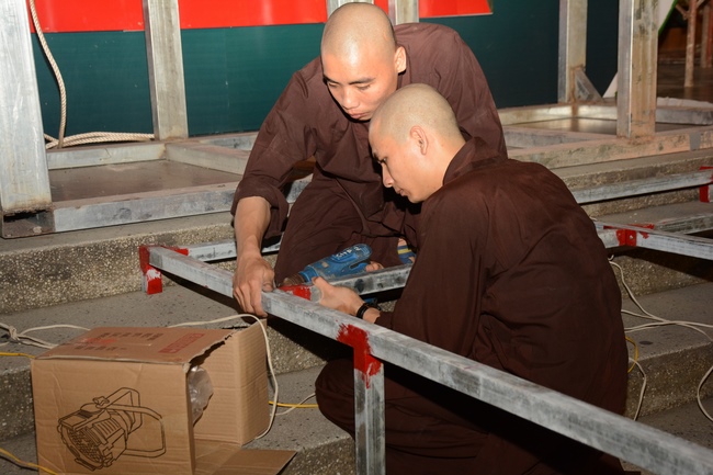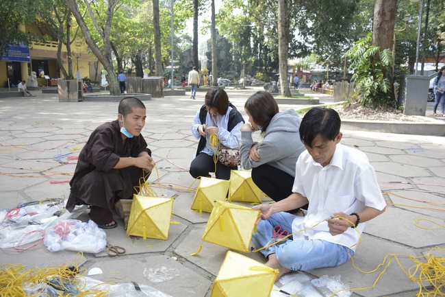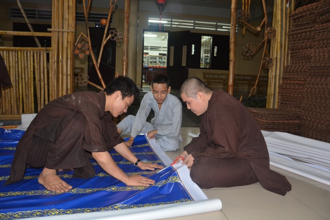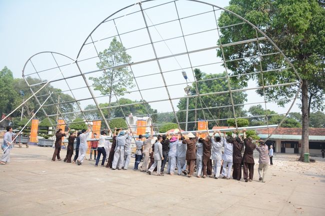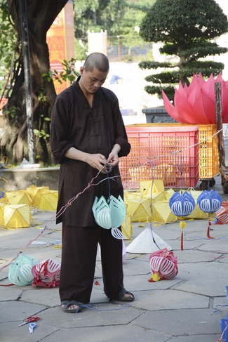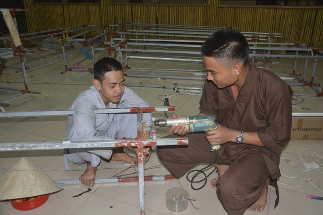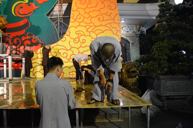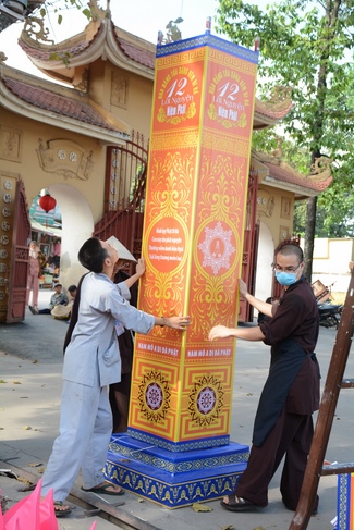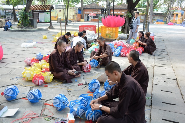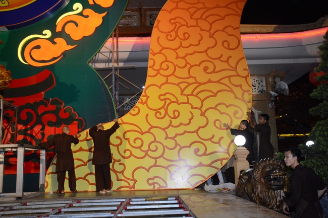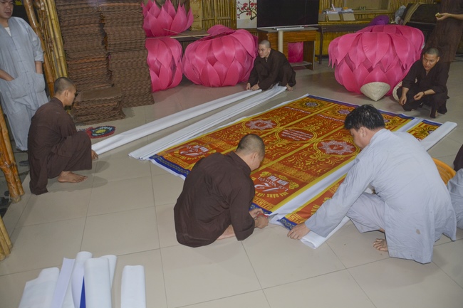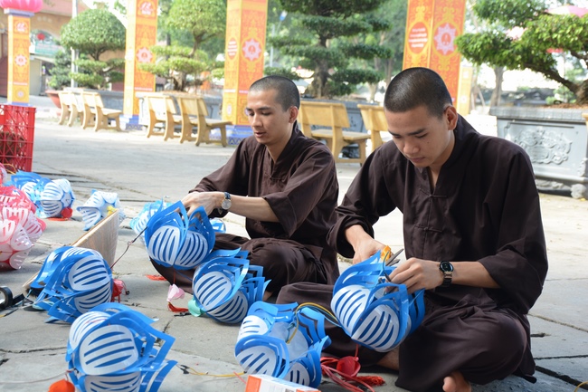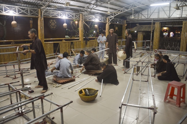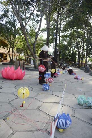Monks and Buddhists at Hoang Phap Pagoda are hurriedly fulfilling the rest works of preparation for lantern ceremony of Amitabha Buddha Day, Nov 17, lunar calendar.