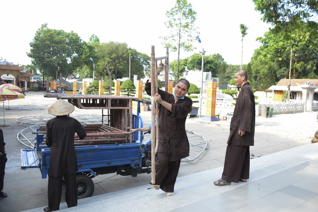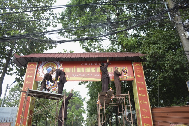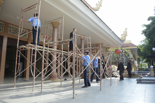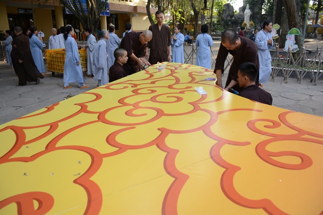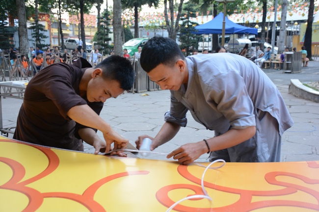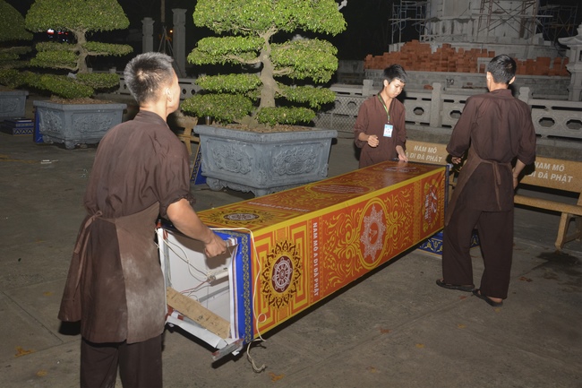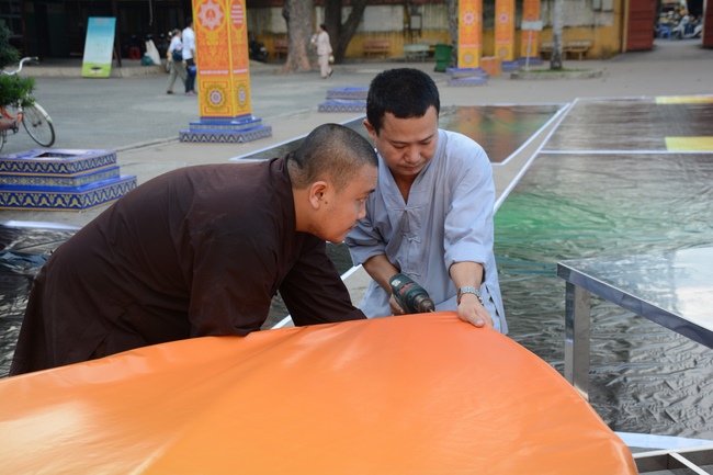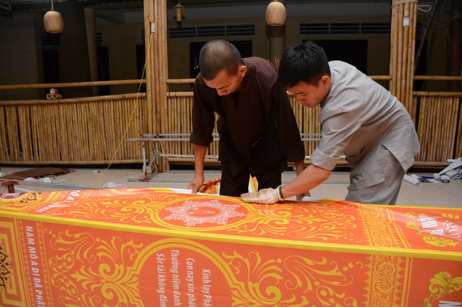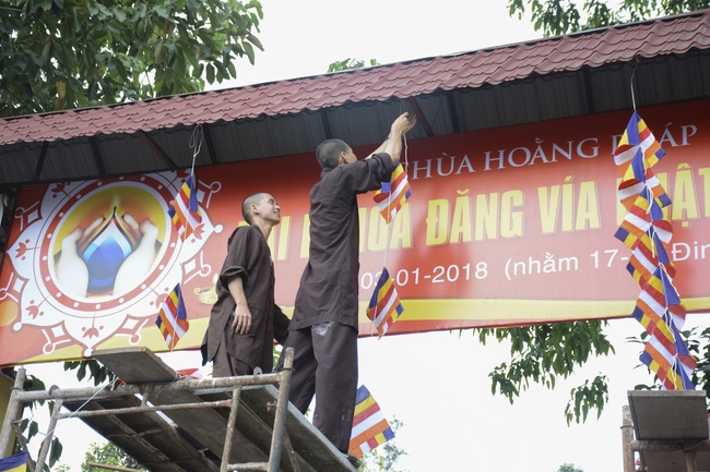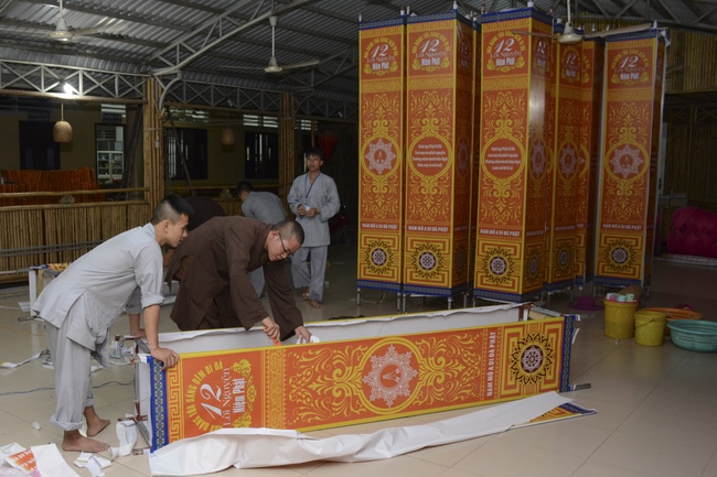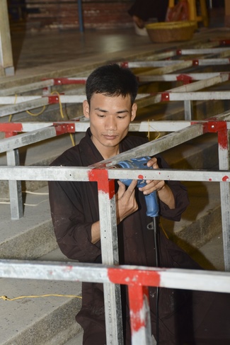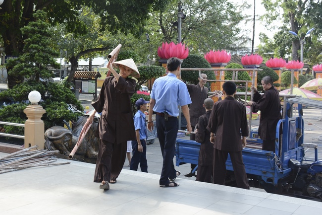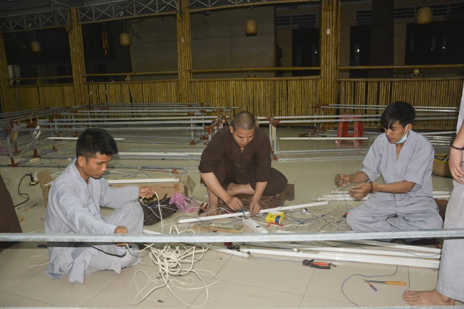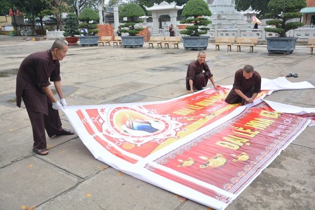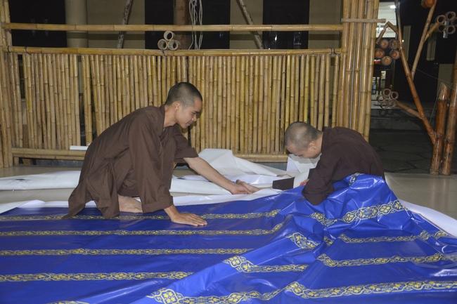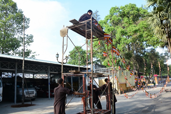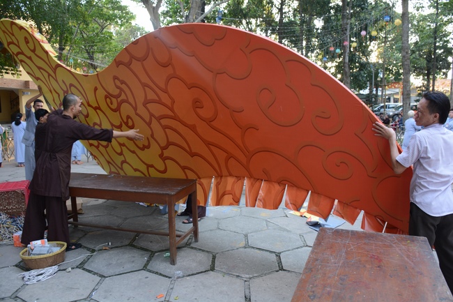 Monks and Buddhists at Hoang Phap Pagoda are hurriedly fulfilling the rest works of preparation for lantern ceremony of Amitabha Buddha Day, Nov 17, lunar calendar.