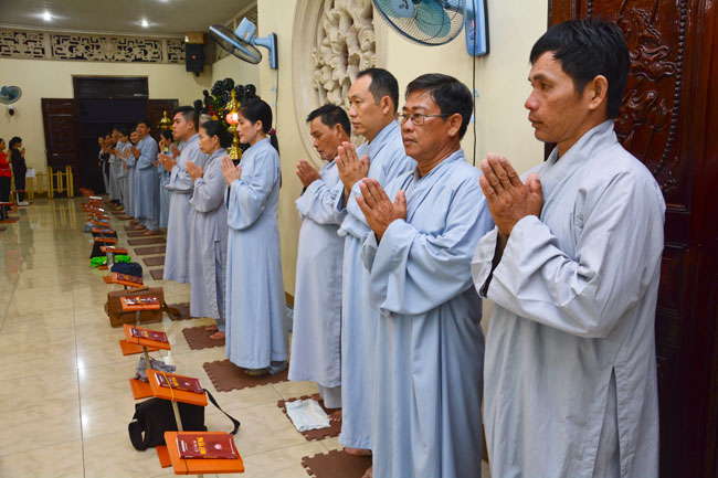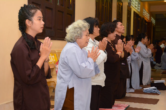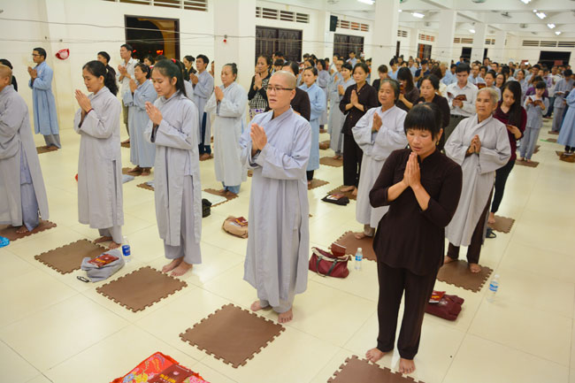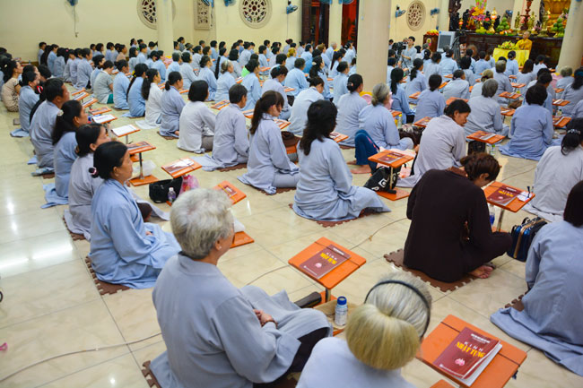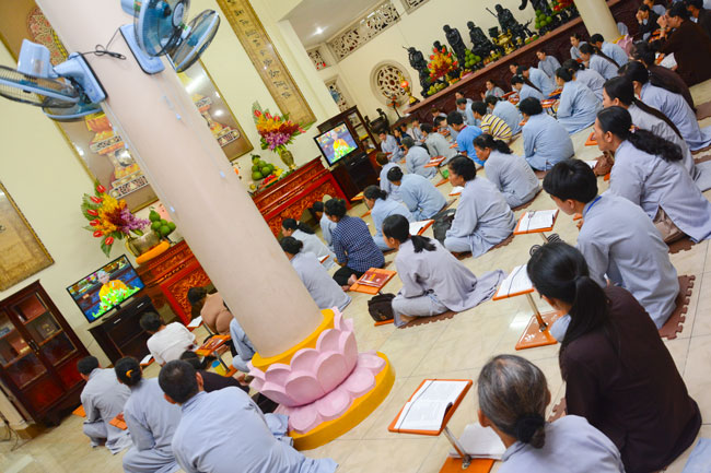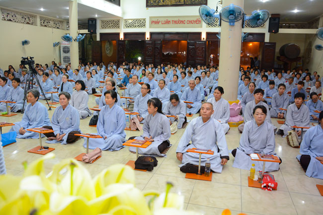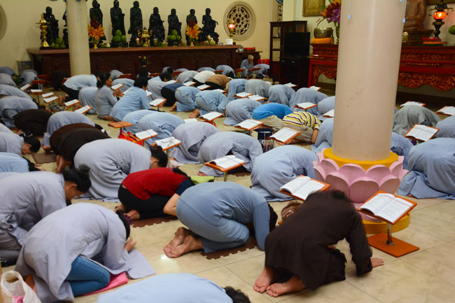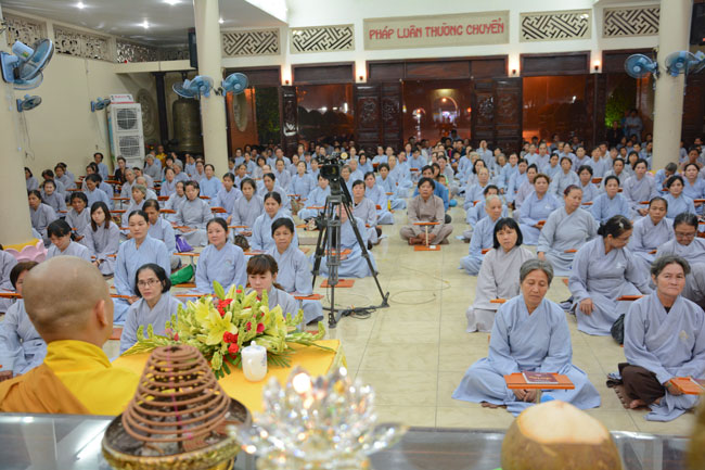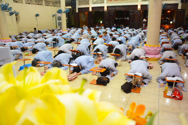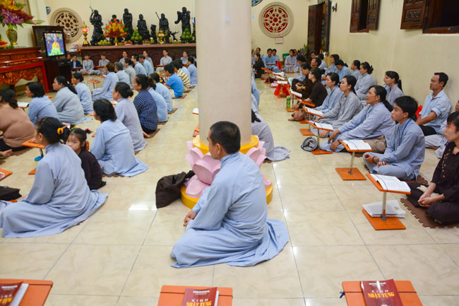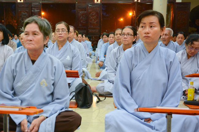Every day, we follow false mind; so loving ourselves gives bad thought of, for example, my house, my body, my wife, my son/daughter,… Then, all purposes move around to desire ourselves and they lead us to the conceit. So, we always foster ourselves, we create selfish lives and want to envy with others. Therefore, if we want to avoid wrong thinking, we must know how to observe that we always change. It cannot be lasting. Through all, we study the way to give up our desires and come back to “wanting less and knowing enoughâ€. Therefore, our lives can become peaceful. After the lecture, there was the schedule of penitence of reciting the Buddhas’ names.