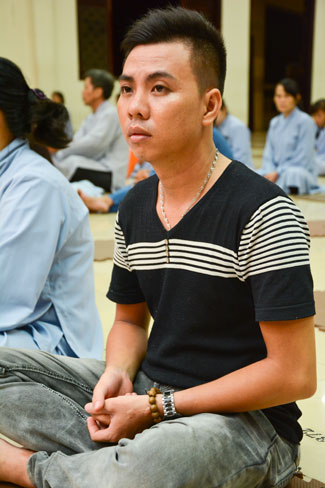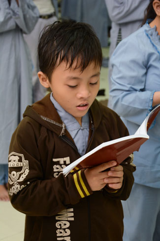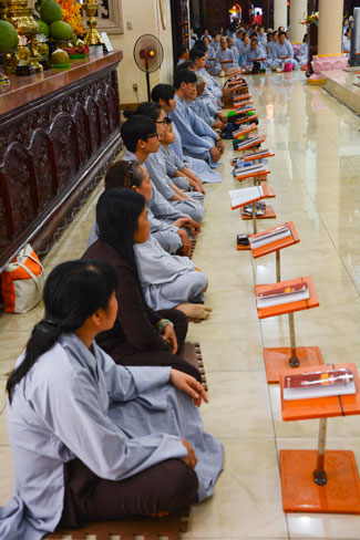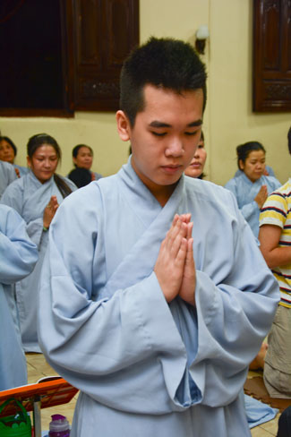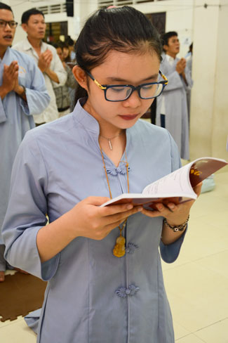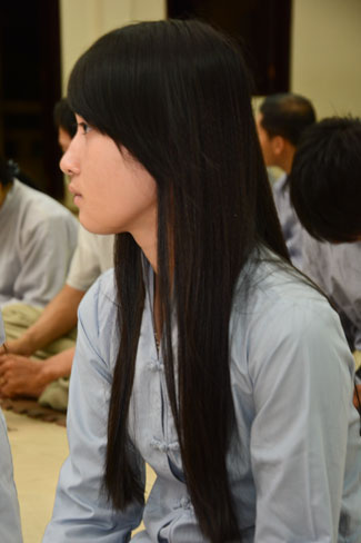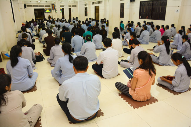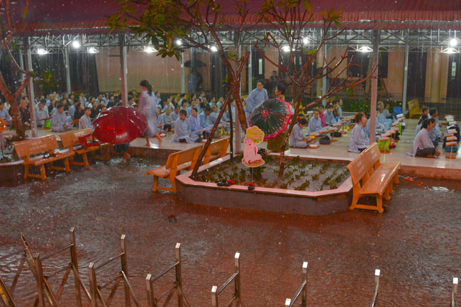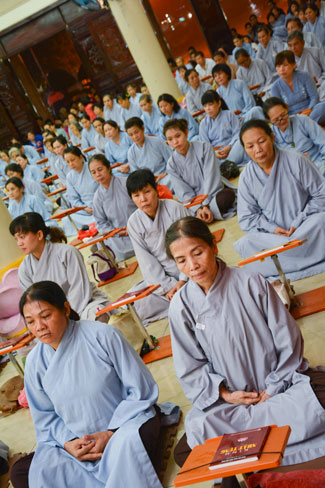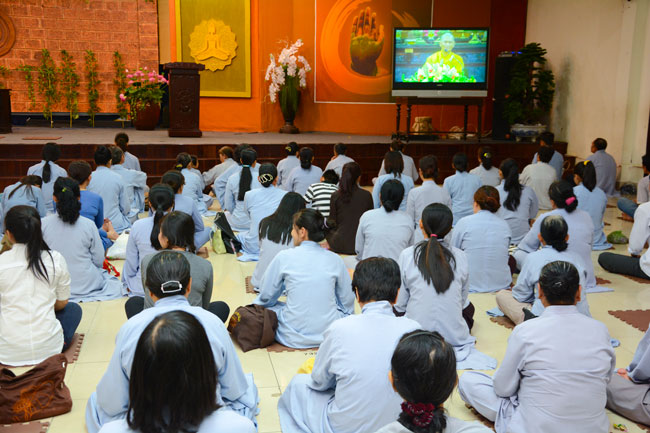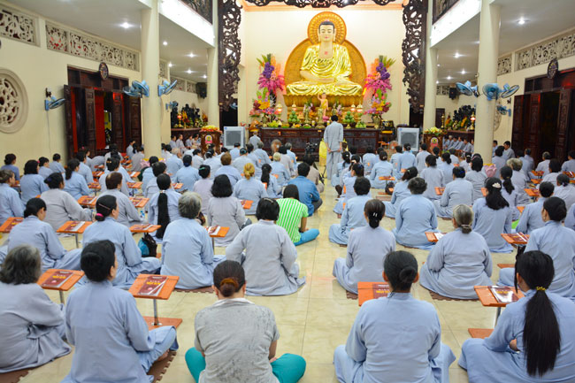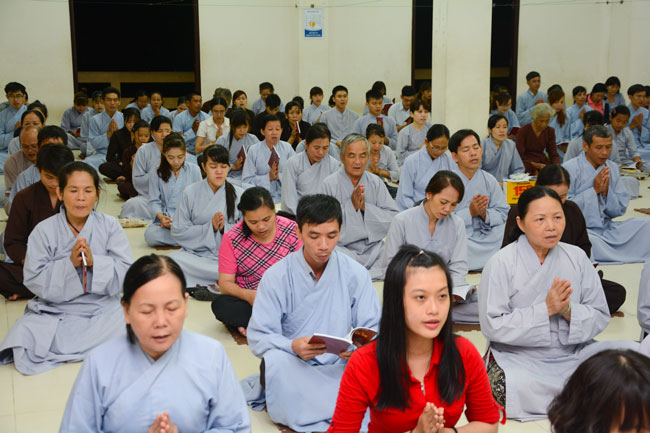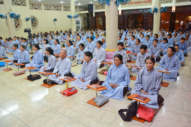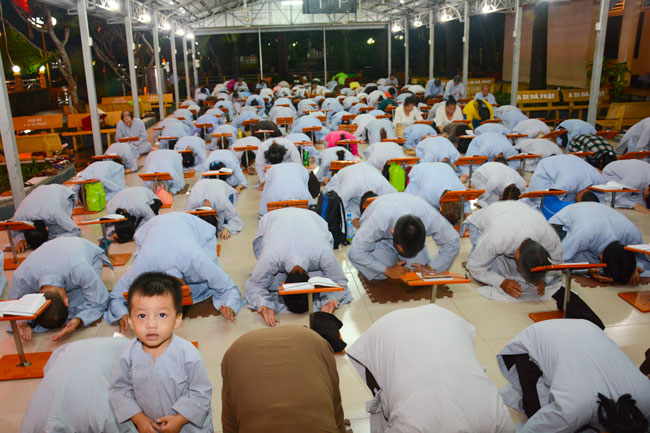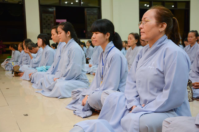 Every day, we follow false mind; so loving ourselves gives bad thought of, for example, my house, my body, my wife, my son/daughter,… Then, all purposes move around to desire ourselves and they lead us to the conceit. So, we always foster ourselves, we create selfish lives and want to envy with others. Therefore, if we want to avoid wrong thinking, we must know how to observe that we always change. It cannot be lasting. Through all, we study the way to give up our desires and come back to “wanting less and knowing enoughâ€. Therefore, our lives can become peaceful. After the lecture, there was the schedule of penitence of reciting the Buddhas’ names.