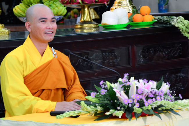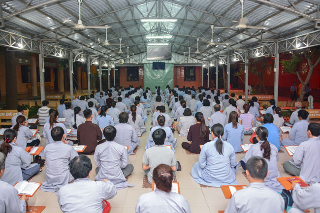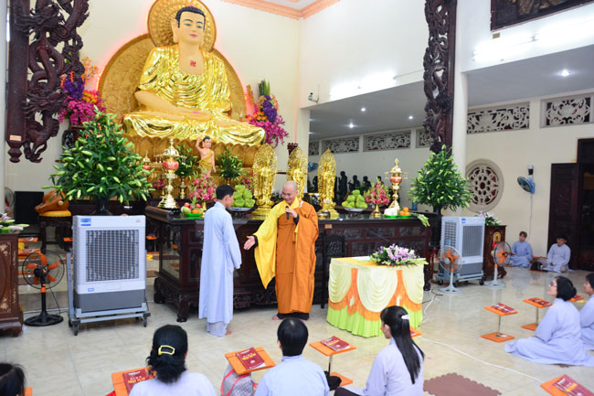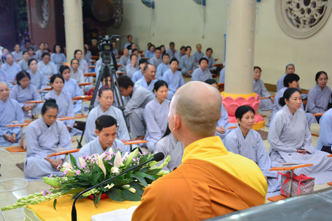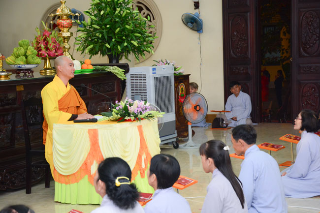 After reciting Buddha for blessing, the mass listened to Dharma teaching from the Junior the masses are listened toenerable Thich Tam Dai, monk of Hoang Phap pagoda, on the topic "Ability in receiving guests".
